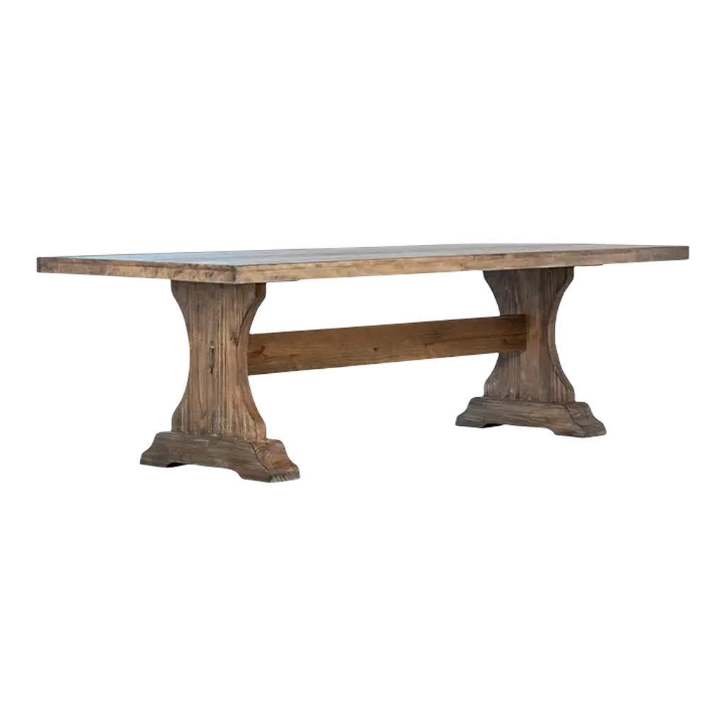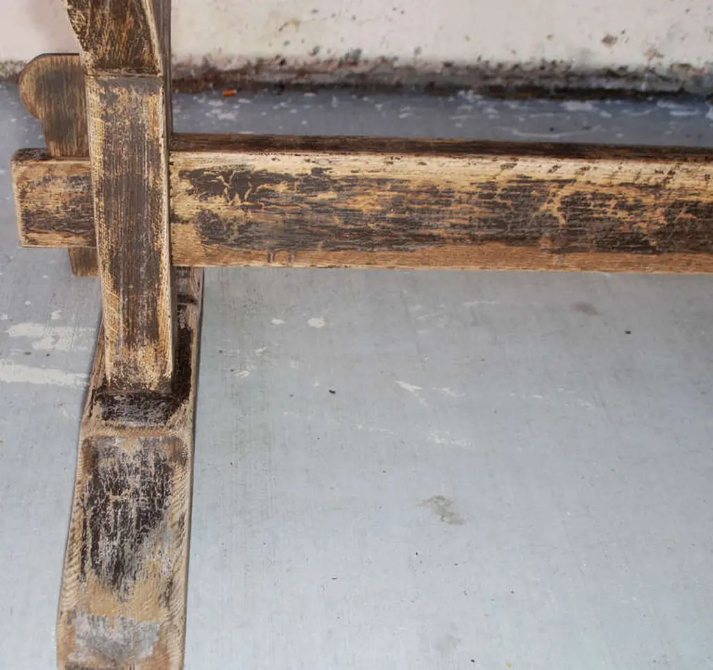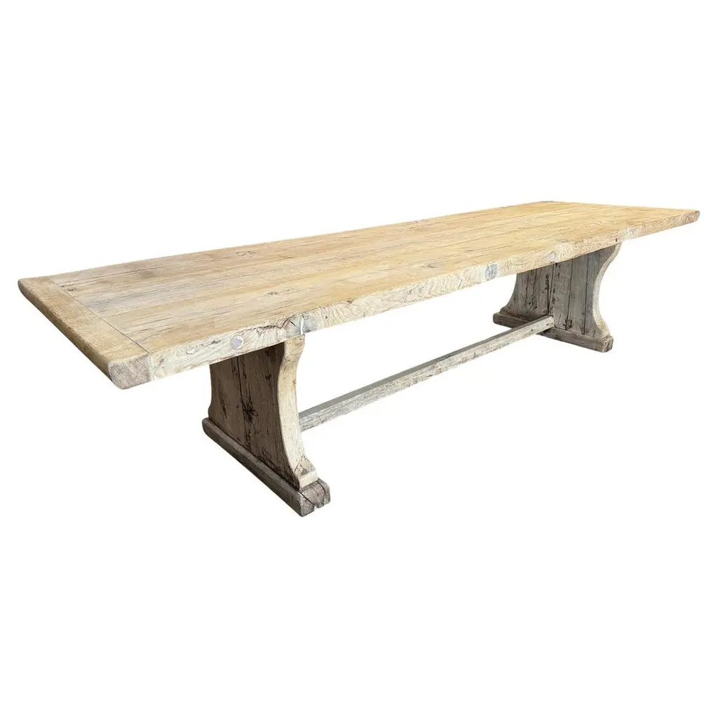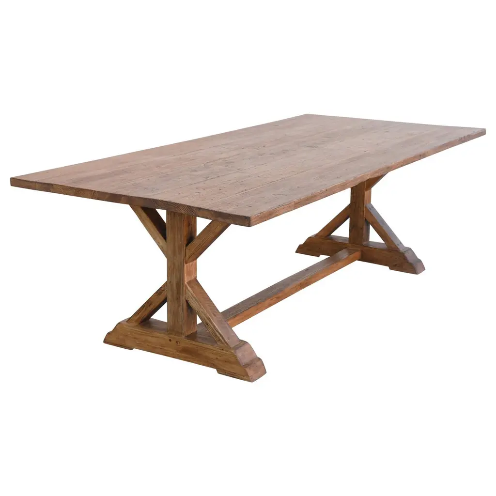 This completely collapsible oak trestle table is nicely weathered with tons of character.Because each table is bench-made in our own Los Angeles workshop you can influence all aspects of design, including size, wood species and finish. We use only traditional carpentry techniques, no nails or metal fasteners of any kind, just mortise and tenon construction reinforced with hand-cut wooden dowels. If you require customized overhang dimensions please stipulate with order.