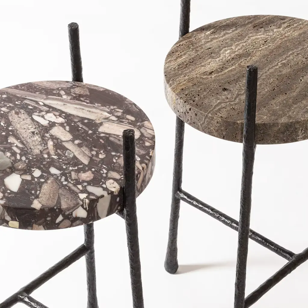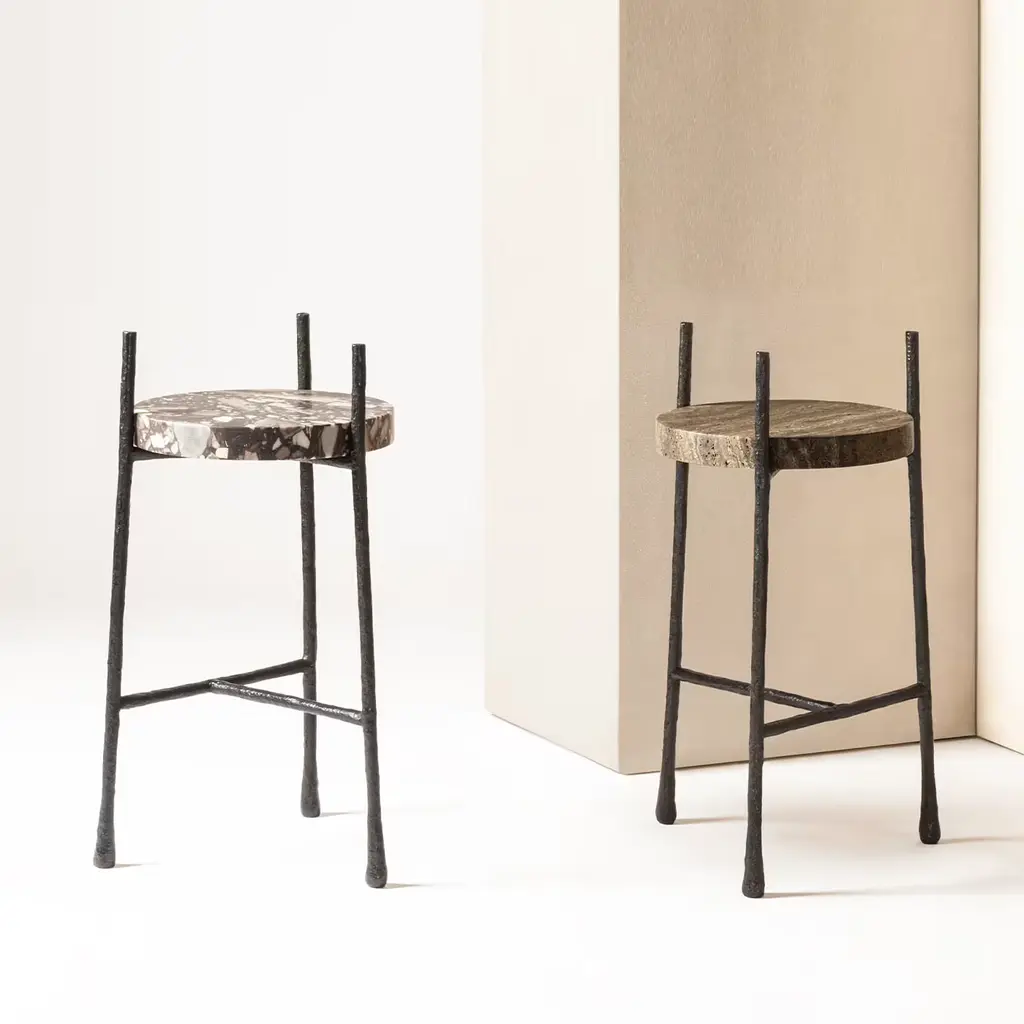 Crafted with precision, this special edition small table is a testament to meticulous artistry and design excellence. The tabletop, bearing the imprint of stones, adds an enchanting touch, making it a truly mesmerizing piece. Supported by slim legs crafted from burnished bronze, this table creates an illusion of weightlessness, adding to its visual appeal. Opt for the intricate breccia antica or the modern titanium travertine tabletop, each brimming with unique charm.