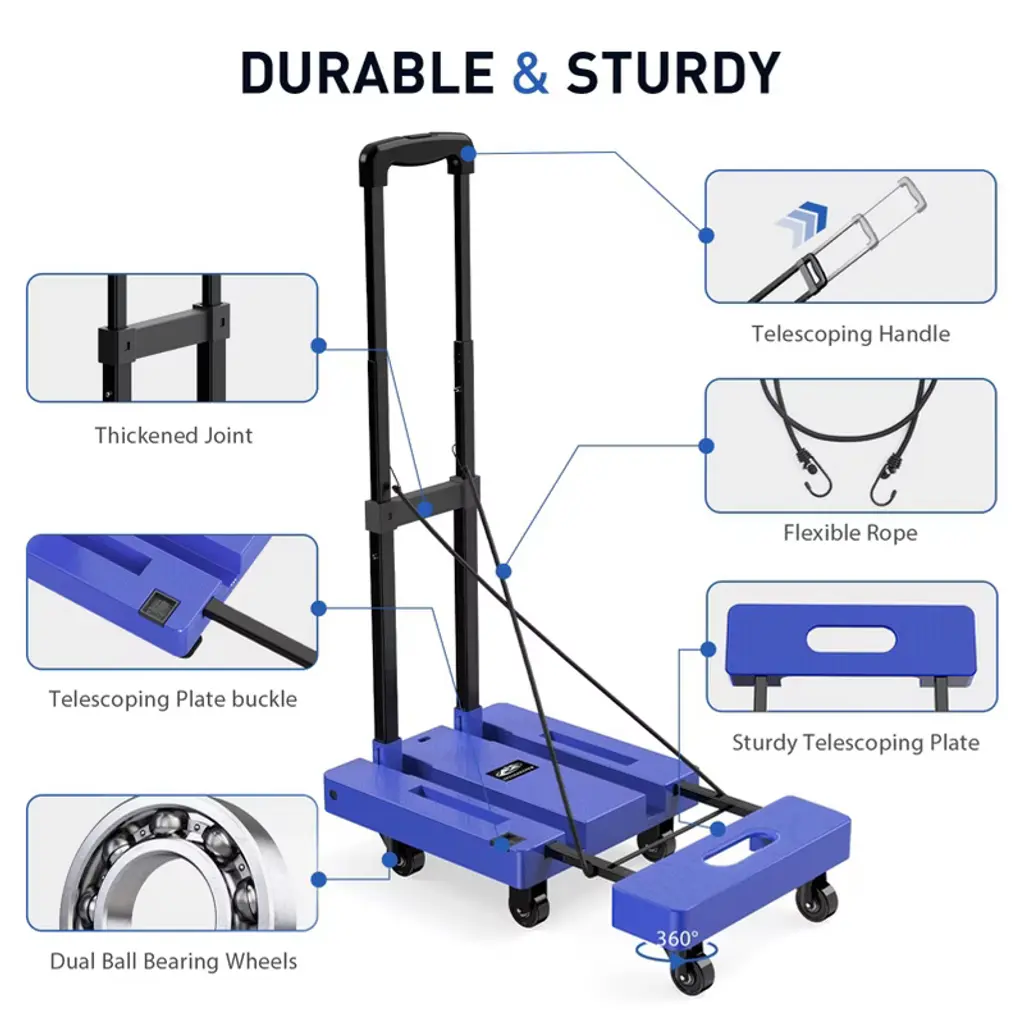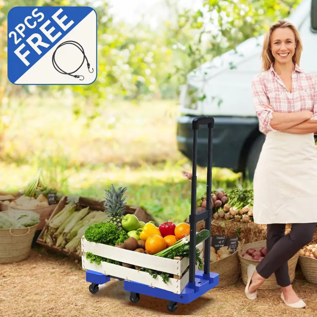 Obokata Spacekeeper Folding Hand Truck, 500 Lb Capacity Luggage Cart, Portable Folding Dolly With 6 Wheels And 2 Elastic Ropes For Luggage, Blue