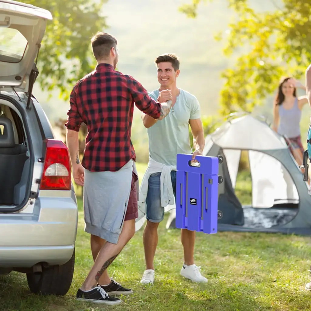 This folding hand truck is easy to fold or unfold in few seconds. When not in use, the luggage cart can be fully fold up flat, more convenient to transport and storage in vehicles, under a bed, in a closet or garages.