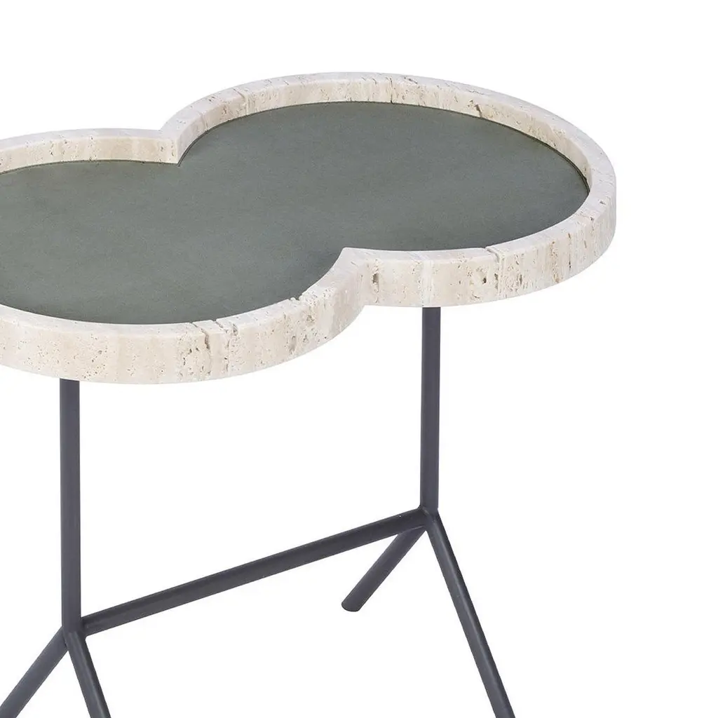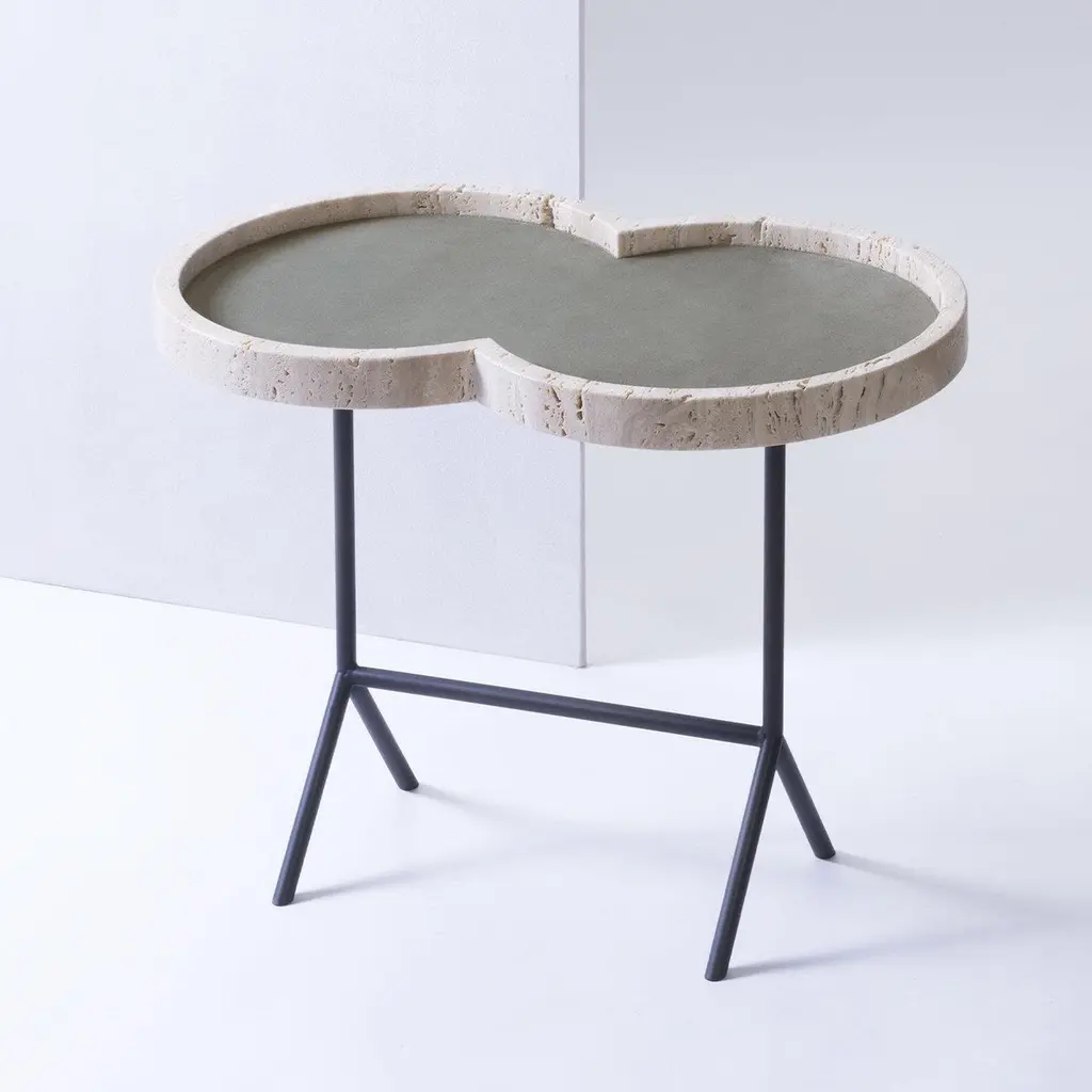 Occasional table with travertine top - Eight by Stephane Parmentier for Giobagnara.The object presented in the image has following finish: Travertine & A69 Sage Suede Leather (top) and Bronze legs.Named after the distinctive shape of its top, this occasional table will add a touch of contemporary flair in any corner of the house with its simple yet refined presence. The top with raised borders is crafted of travertine and available also in leather-covered wood. Lined inside with beige suede (also nappa and printed calfskin), it rests on a trestle base crafted of bronze that adds lightness to this versatile design.Design: Stéphane ParmentierMaterial: Travertine, Leather and BronzeDimensions (in): W 23.62 x D 14.17 x H 18.50Dimensions (cm): W 60 x D 36 x H 47Made by hand, in Italy.This item is made to order. Please choose the finish that you want for your piece.