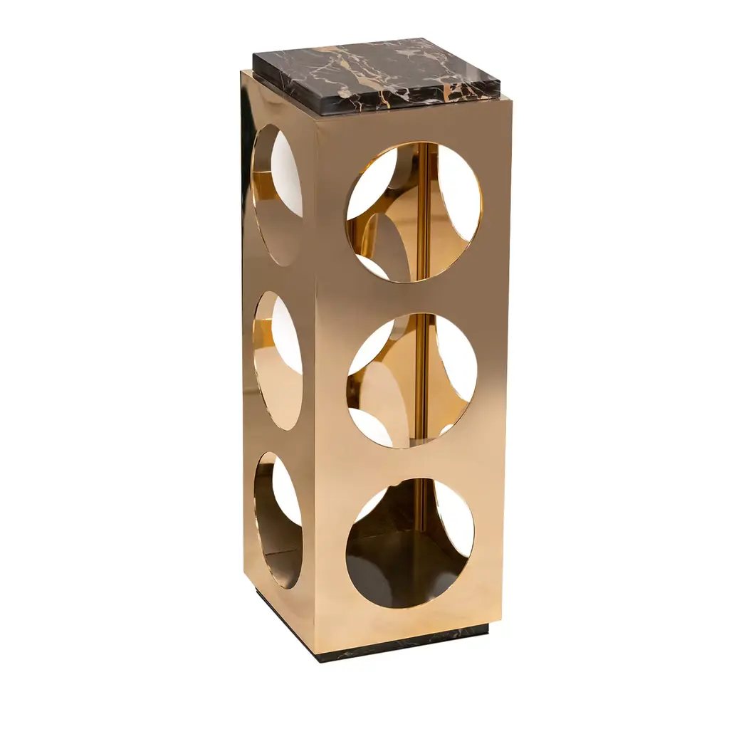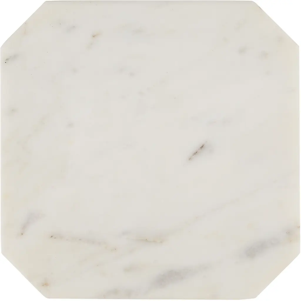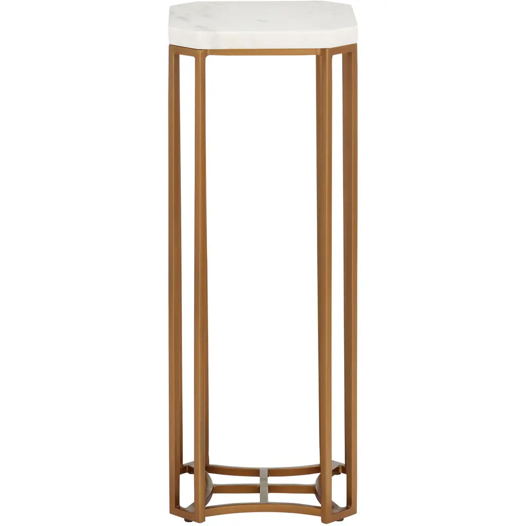 The Ocho Marble Drinks Table blends refined materials with geometric gracefulness. Its square top, crafted from smooth Banswara white marble, features gently rounded corners that soften the design. The iron frame, finished in antique brass, rises from a cross-shaped base at the floor, forming tall rectangular shapes that create an open and airy silhouette.