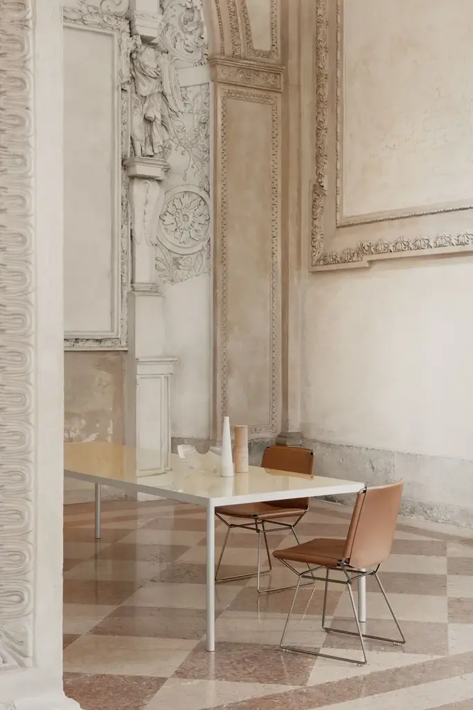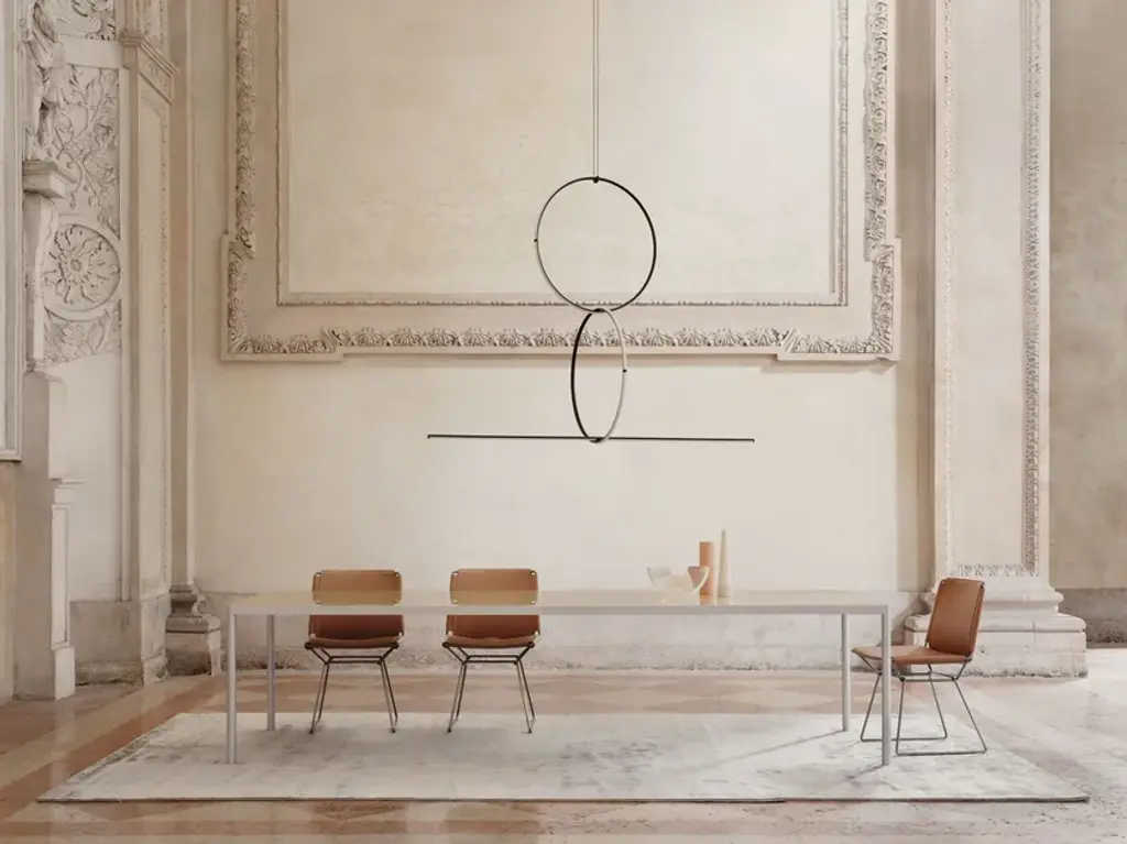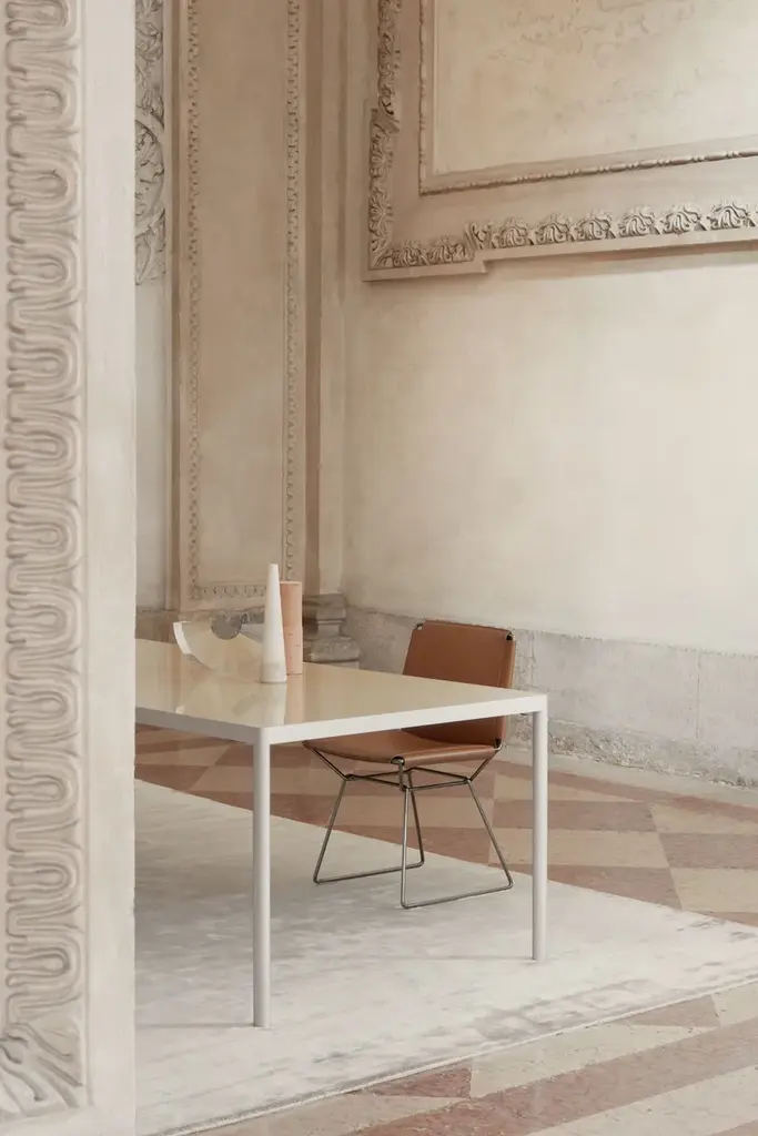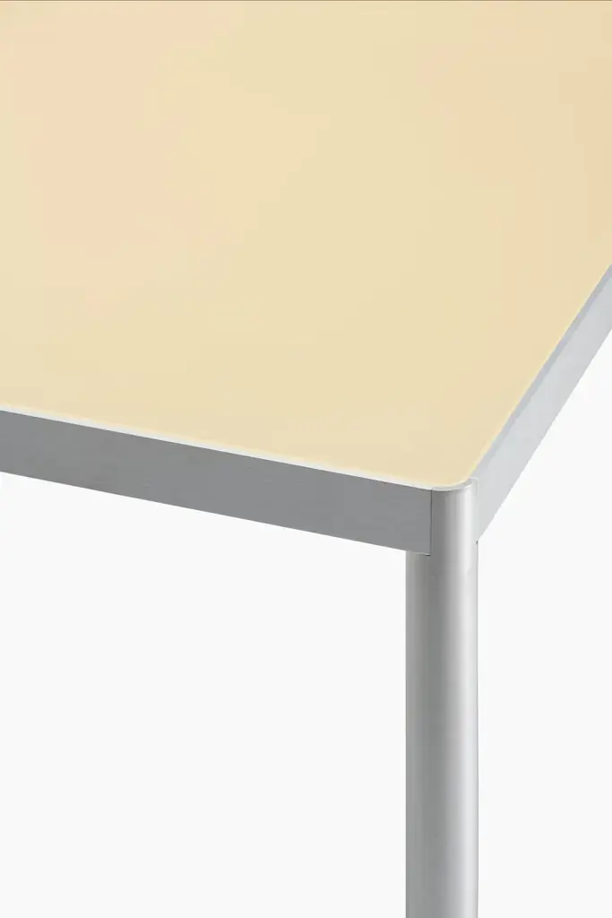 The Offset table’s poetics lie in its minimal dimensions.The protagonist of the design is the purity of the material used, a fundamental feature of the MDF Italia heritage: here it is brushed anodised aluminium.The simple lines carried over a wide range of sizes, even extra- large, convergelightness through the universal and chameleon-like language of an intrinsically industrial material, which silently merges into a large variety of domestic and contract settings.The Offset table system is ideal for both indoor and outdoor use. It stands apart for its extreme flexibility, being designed for tops in various materials.100% recyclable, it is quick and easy to assemble and disassemble. Studied for easy transportation with the flat pack.StructureThe frame is composed of only two extruded elements joined together fluidly by way of a high-precision mechanical processing method and sections that conceal the attachments.Extruded aluminium legs, round section, diam. 40 mm, with internal steel structural tie-rod only for lengths over 260 cm. Extruded aluminium perimeter structure, height 40 mm.Available in the following finishes: brushed anodised aluminium or painted matt lead black. TopsTops are recessed and do not require any securing hardware (excluding aluminum tops). Available in:• Back-painted tempered glass in the colours dune(ral 1001), burgundy (ral 3007), English green (ral 6007), navy blue (ral 5004), black (ral 9005) and white.Thickness: 8 mm.• Reconstructed stone: the top consists of sandblasted, tempered and spatulated glass slats in white calce, black slate, pink onyx, yellow onyx, sage green, brick red and pietra serena finishes. 9 mm thick.Reconstructed stone is obtained from a blend of mineral powders that have been micronized and mixed with liquid acrylic and water-based products, giving it a material essence. The finishes are applied manually with a palette knife over the entire surface of the table, creating a one-of-a-kind texture that characterises each and every product, both to the eye and to the touch. After application, a maturation process at room temperature is required; the material is subsequently protected with a water-based nanotechnological finish that makes the table sturdy and easy to clean. Top, edges and legs covered with the application of a thickness of about 1.5 mm of material. Visual irregularities, nuances, a lack of uniformity of both surface and material colour are deemed traits of value and uniqueness.DimensionsTables H73 available in 21 different sizes.The maximum sizes stated in the price list indicate the limitations for use of material chosen for the construction of built-in tops.AccessoriesProtective rain cover specifically for outdoor products, waterproof, made of 100% polyester, outside with acrylic coating, inside with acrylic resin coating. Its characteristics are emphasised by its fully fungicidal Teflon finish. Each rain cover comes with a closable bag, so that it can be folded and kept correctly when not in use.Use and maintenanceFor correct washing, use a delicate neutral soap and water, and rinse thoroughly after washing, using only water. After cleaning, allow the fabric to dry correctly before folding it and putting it away, to avoid it getting mouldy.Avoid the fabric coming into direct contact with weed killers, fertilisers, and chlorine, as these may stain the protective rain cover indelibly.OutdoorTables with reconstructed stone tops can be used outdoors, in the dimensions D100 L180/240/300, D120 L120, D150 L150, D180 L180. Reconstructed stone tops are divided into several parts as shown in the drawing.