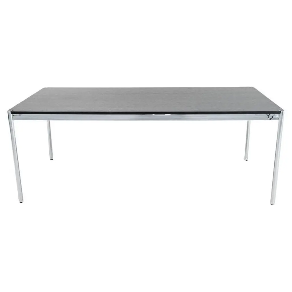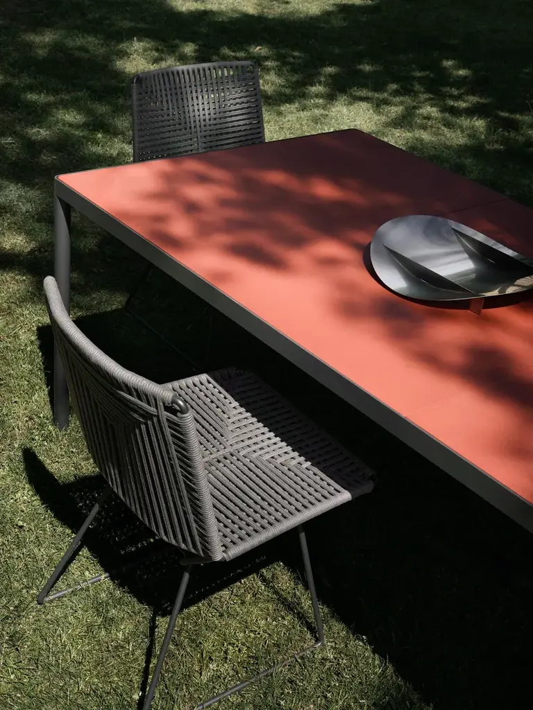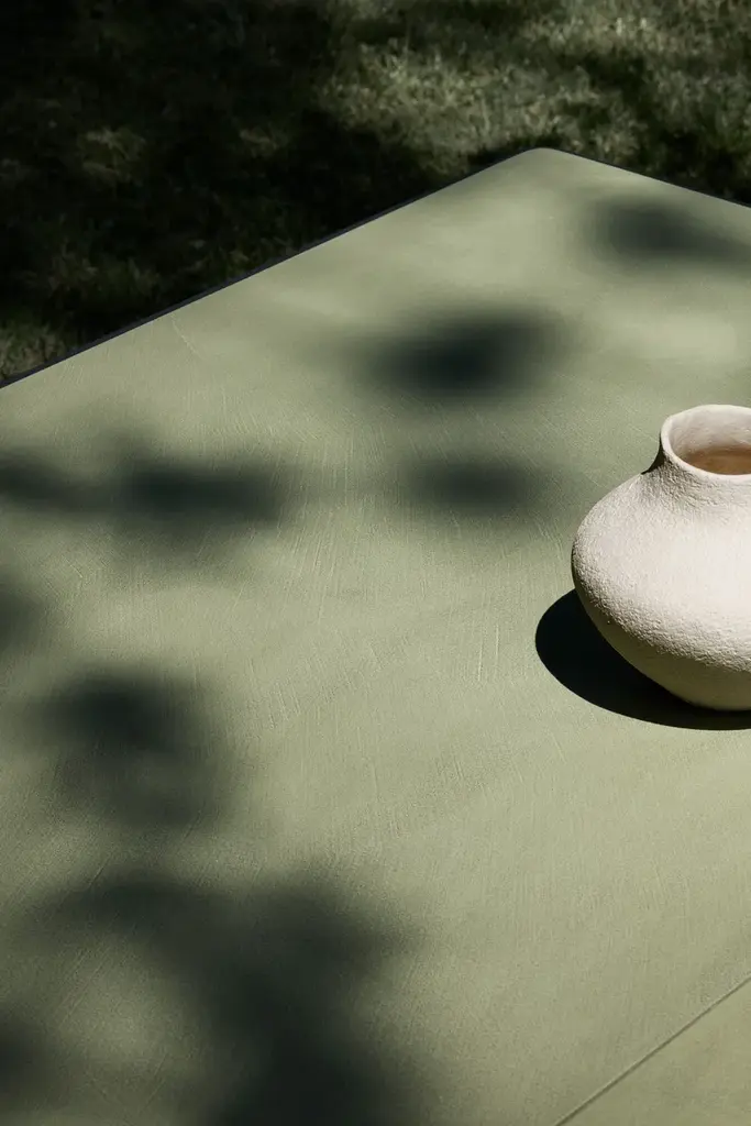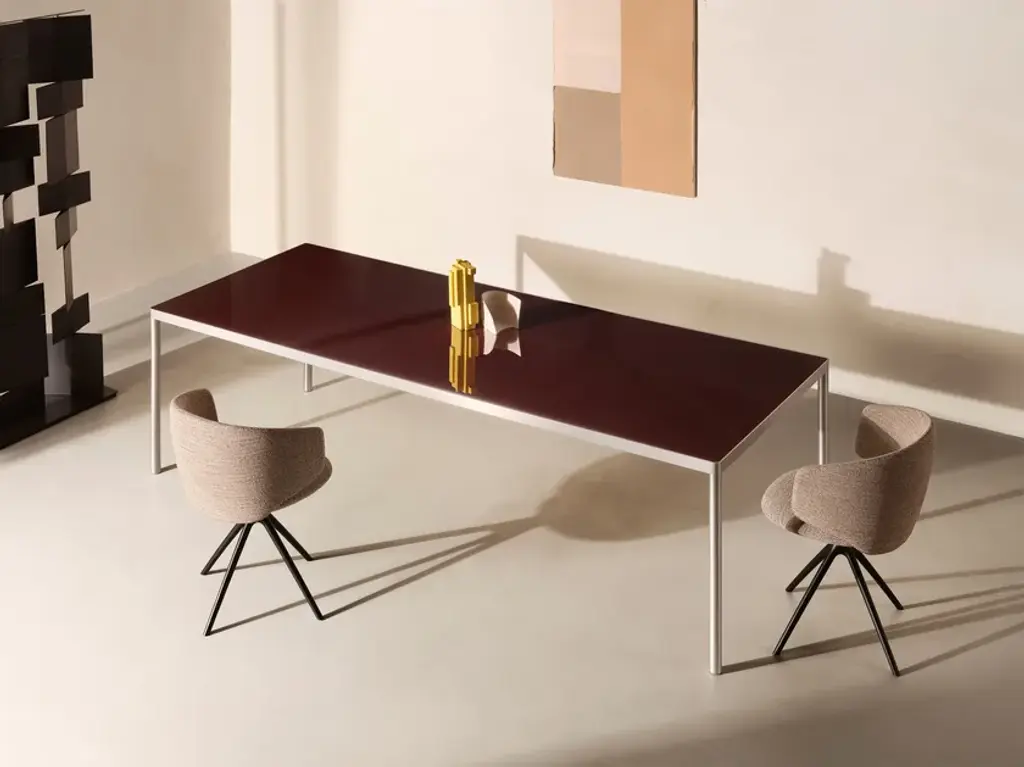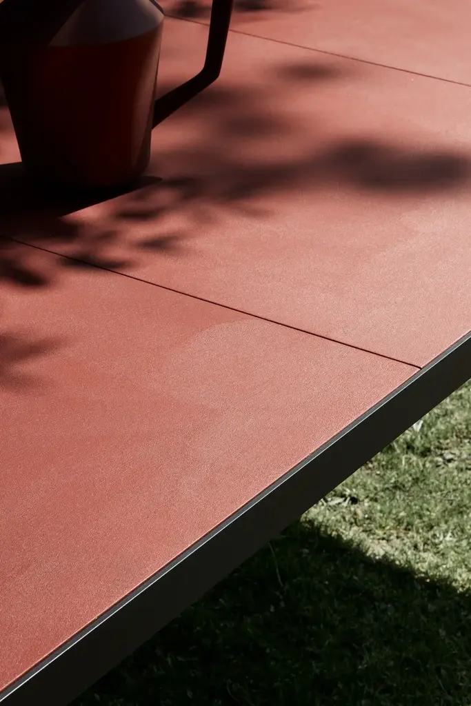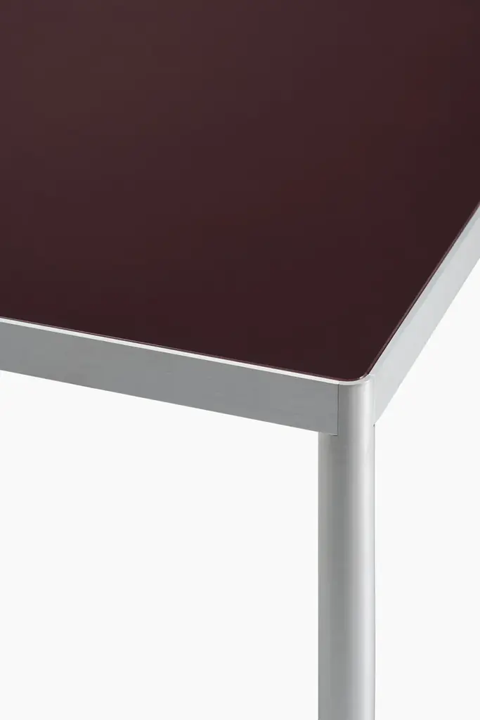The Offset table’s poetics lie in its minimal dimensions.The protagonist of the design is the purity of the material used, a fundamental feature of the MDF Italia heritage: here it is brushed anodised aluminium.The simple lines carried over a wide range of sizes, even extra- large, convergelightness through the universal and chameleon-like language of an intrinsically industrial material, which silently merges into a large variety of domestic and contract settings.The Offset table system is ideal for both indoor and outdoor use. It stands apart for its extreme flexibility, being designed for tops in various materials.100% recyclable, it is quick and easy to assemble and disassemble. Studied for easy transportation with the flat pack.StructureThe frame is composed of only two extruded elements joined together fluidly by way of a high-precision mechanical processing method and sections that conceal the attachments.Extruded aluminium legs, round section, diam. 40 mm, with internal steel structural tie-rod only for lengths over 260 cm. Extruded aluminium perimeter structure, height 40 mm.Available in the following finishes: brushed anodised aluminium or painted matt lead black. TopsTops are recessed and do not require any securing hardware (excluding aluminum tops). Available in:• Back-painted tempered glass in the colours dune(ral 1001), burgundy (ral 3007), English green (ral 6007), navy blue (ral 5004), black (ral 9005) and white.Thickness: 8 mm.• Reconstructed stone: the top consists of sandblasted, tempered and spatulated glass slats in white calce, black slate, pink onyx, yellow onyx, sage green, brick red and pietra serena finishes. 9 mm thick.Reconstructed stone is obtained from a blend of mineral powders that have been micronized and mixed with liquid acrylic and water-based products, giving it a material essence. The finishes are applied manually with a palette knife over the entire surface of the table, creating a one-of-a-kind texture that characterises each and every product, both to the eye and to the touch. After application, a maturation process at room temperature is required; the material is subsequently protected with a water-based nanotechnological finish that makes the table sturdy and easy to clean. Top, edges and legs covered with the application of a thickness of about 1.5 mm of material. Visual irregularities, nuances, a lack of uniformity of both surface and material colour are deemed traits of value and uniqueness.DimensionsTables H73 available in 21 different sizes.The maximum sizes stated in the price list indicate the limitations for use of material chosen for the construction of built-in tops.AccessoriesProtective rain cover specifically for outdoor products, waterproof, made of 100% polyester, outside with acrylic coating, inside with acrylic resin coating. Its characteristics are emphasised by its fully fungicidal Teflon finish. Each rain cover comes with a closable bag, so that it can be folded and kept correctly when not in use.Use and maintenanceFor correct washing, use a delicate neutral soap and water, and rinse thoroughly after washing, using only water. After cleaning, allow the fabric to dry correctly before folding it and putting it away, to avoid it getting mouldy.Avoid the fabric coming into direct contact with weed killers, fertilisers, and chlorine, as these may stain the protective rain cover indelibly.OutdoorTables with reconstructed stone tops can be used outdoors, in the dimensions D100 L180/240/300, D120 L120, D150 L150, D180 L180. Reconstructed stone tops are divided into several parts as shown in the drawing.