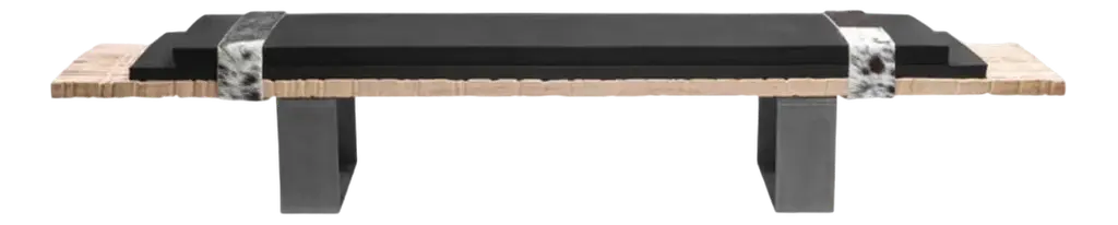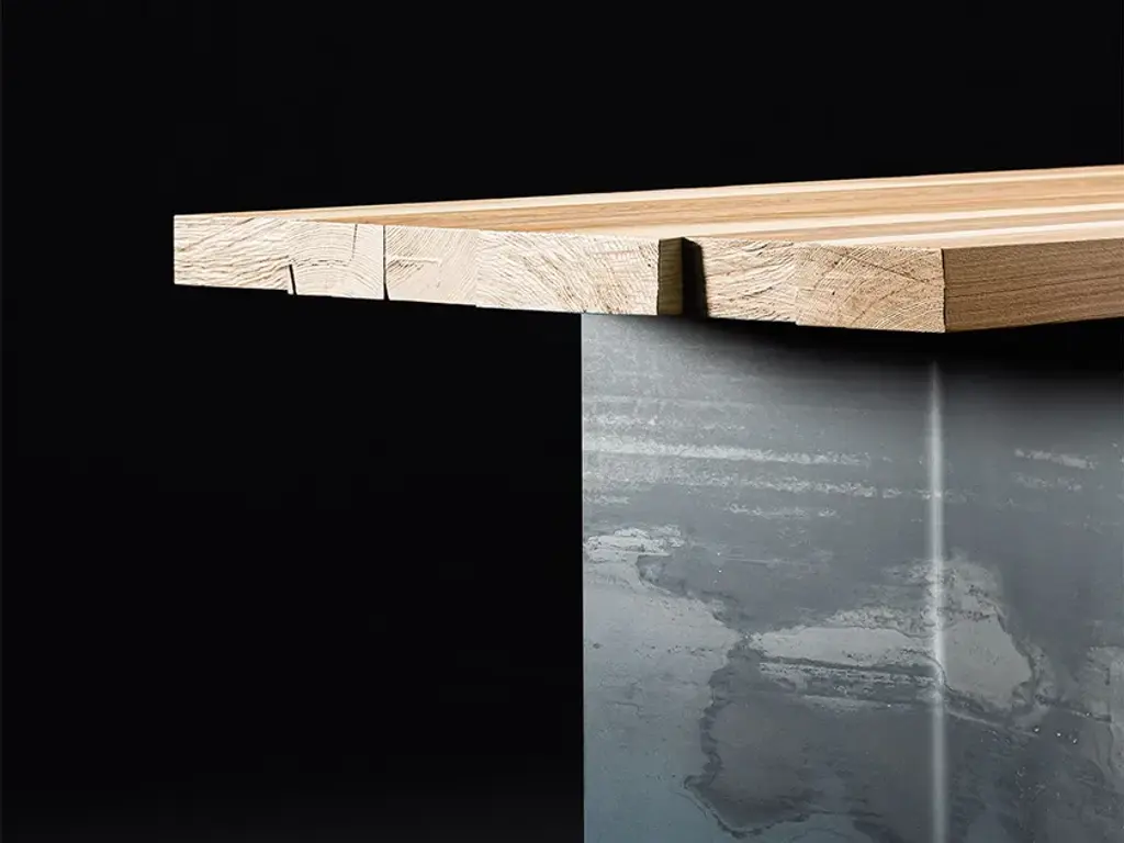 Every panel of wood is unique, and this uniqueness shines through even when they are combined together to create a single table. The rough-cut short edges of the individual panels create a contrast with the straight long sides, and the skilful combination of light and dark surfaces creates a unique visual effect. The Olive Ash imitates the prized features of olive wood, while retaining the semi-hardness and versatility of ash. The tabletop is supported by folded iron sheets with a metallicised finish and visible welding.Every Bruno Spreafico piece is unique and made to measure, with a wide choice of woods, bases, finishes, colours, materials, sizes and other features.