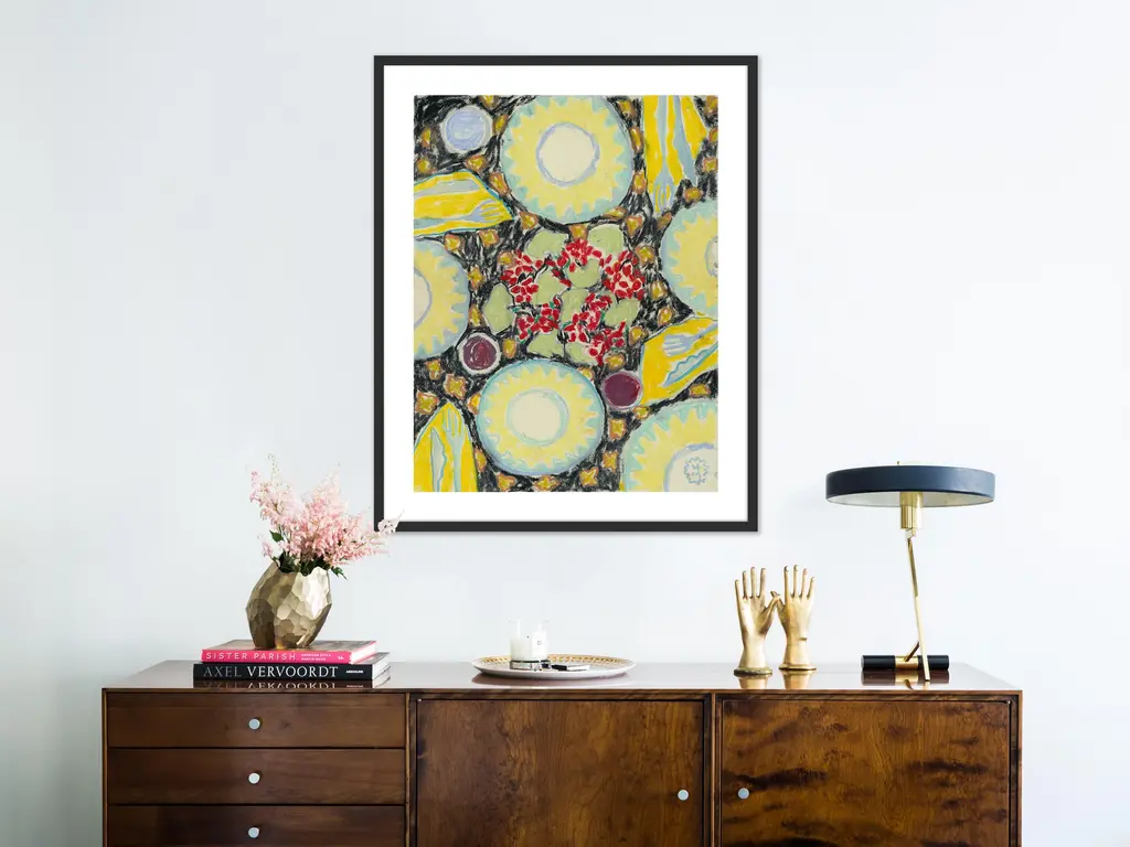 DESCRIPTION: On the Table by Happy Menocal in Black Frame, Medium Art Print SPECIFICATIONS: Type: Framed Paper. Framed Size (in): 29x36. Orientation: Vertical. Flush/Float/Matted: Matted. Frame Color: Black. Hanging Hardware: Picture Perfect. FRAMING: Each art work arrives framed and ready to hang. We use handmade frames with a plexiglass glazing front, because it offers less glare than standard glass. At this time, we only offer framed prints. ARTIST BIO: Happy Menocal is a New York-based artist and creative director. She is known for her spirited illustration style and profligate use of color. Founded in 2012, her studio specializes in personal and corporate event stationery, brand identity, murals and textile design for private clients and hospitality groups.