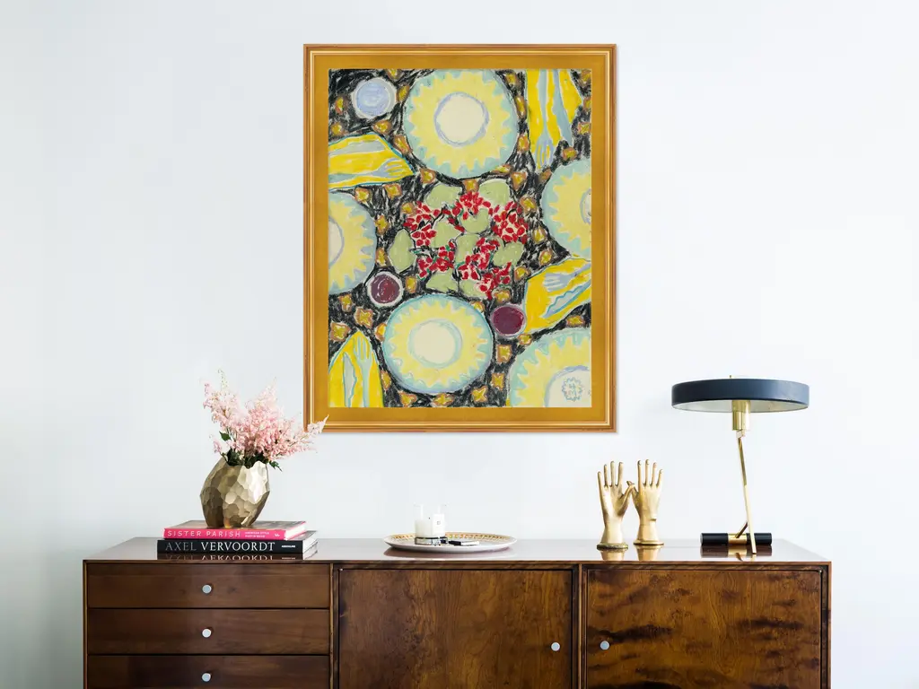 DESCRIPTION: On the Table by Happy Menocal in Gold Frame, Medium Art Print SPECIFICATIONS: Type: Framed Paper. Framed Size (in): 29x36. Orientation: Vertical. Flush/Float/Matted: Flush. Frame Color: Gold. Hanging Hardware: Picture Perfect. FRAMING: Each art work arrives framed and ready to hang. We use handmade frames with a plexiglass glazing front, because it offers less glare than standard glass. At this time, we only offer framed prints. ARTIST BIO: Happy Menocal is a New York-based artist and creative director. She is known for her spirited illustration style and profligate use of color. Founded in 2012, her studio specializes in personal and corporate event stationery, brand identity, murals and textile design for private clients and hospitality groups.
