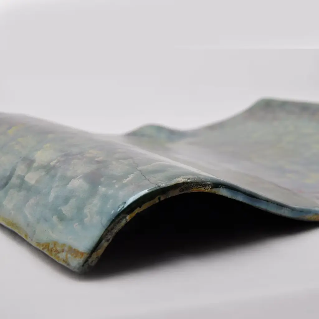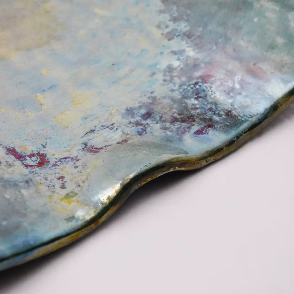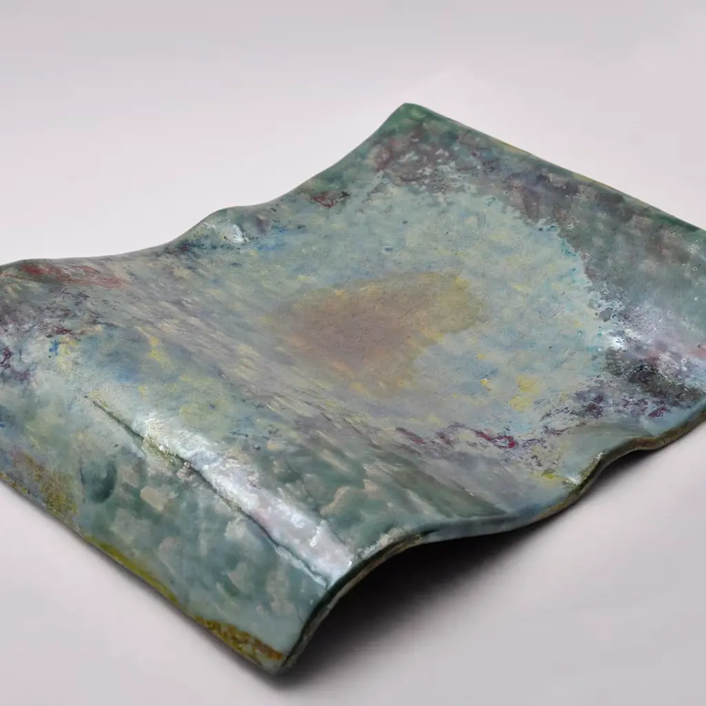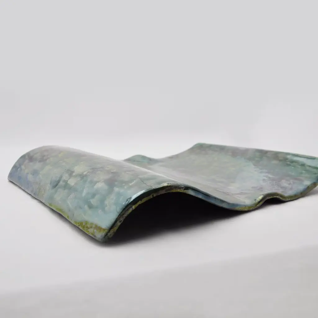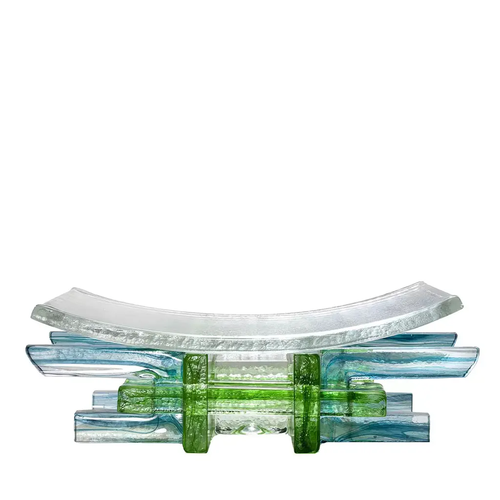 This modern centerpiece was designed and created by hand by Nino Basso. It has a modern design and glossy, green colors that the raku ceramics technique transforms into a play of light and dark shades and golden reflections. This unique centerpiece is the perfect accessory to complement any type of interior design.