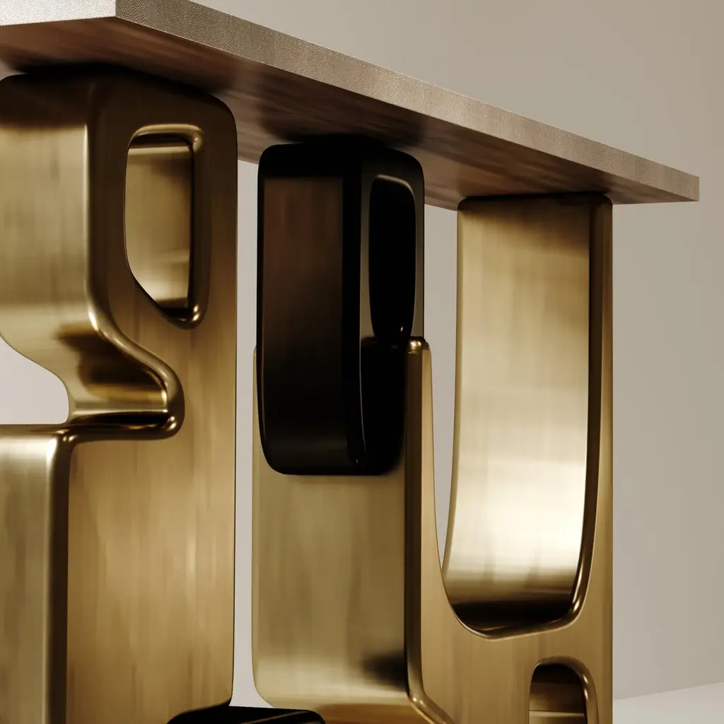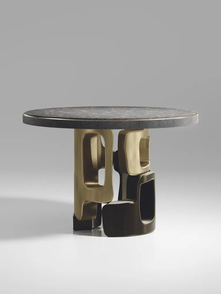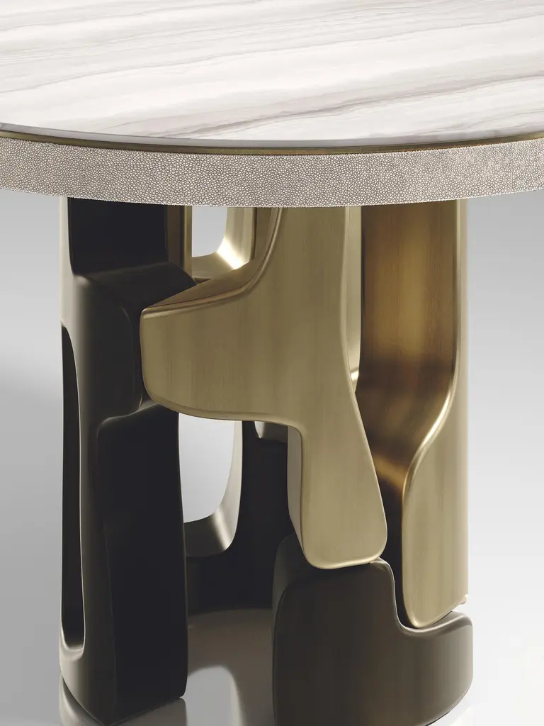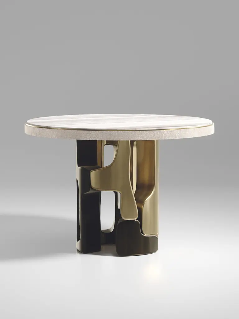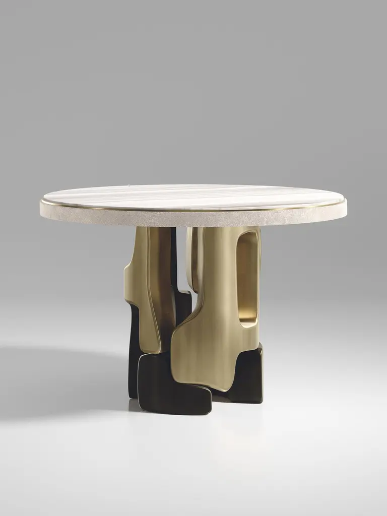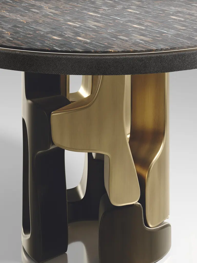 The Paris based label has distinguished themselves since their launch, with their iconic use of shagreen mixed with brass and other exotic materials. All furniture is handcrafted by skilled artisans, ultimately making each piece unique, designed in Paris and produced in the Philippines.The Apoli breakfast table by Kifu Paris is both dramatic and organic its unique design. The onyx top sits on an ethereal geometric and sculptural bronze-patina brass base. This piece is designed by Kifu Augousti the daughter of Ria and Yiouri Augousti. Part of the Apoli Capsule Series, see images of collection at end of slide.The finish of the shagreen is authentic as it is hand-dyed and the designer calls the finish look: "antique natural shagreen."The dimensions of this piece are 43.3 diameter x 29.25 heightAll Kifu Paris pieces are handmade by artisans, ultimately making each piece unique.Custom color / sizing available on request.Wipe clean with soft dry cloth.Although inspired by her parents, her collection of Home Accessories and Furniture is a distinct identity of its own. Kifu uses handmade techniques of elaborate inlay patterns of shagreen, shells, semi-precious stones, materials she experienced as a child growing up in her parent’s studio, but interpreted in a younger quirkier way reflecting her youth. From her "jewelry inspired knobs" on decorative boxes, gold bar boxes and an extravagant inlay pattern mix of shagreen and shell inspired by galactic constellations, as seen on her enormous round mirror, is refreshing to see. Kifu embodies whimsical elements throughout her collection and is not afraid to be daring and unexpected in her approach to design.All shagreen-covered items should be kept out of direct sunlight, color variants may occur on the stingray and other exotic finishes, but this showcases the Parisian label's commitment to creating authentic luxurious products using natural components.