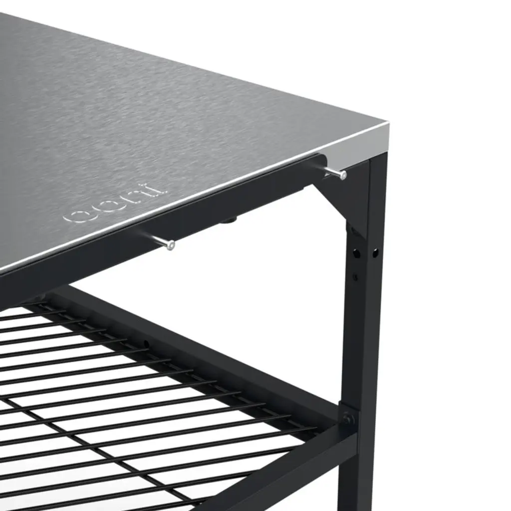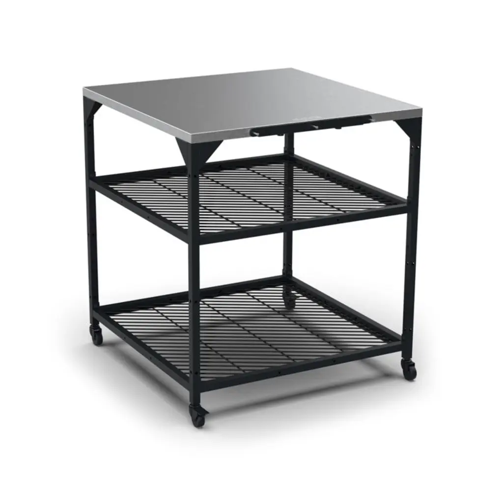 Create the ultimate outdoor pizza station with this modular table, designed to support your Ooni pizza oven (sold separately). Crafted of black carbon steel, the large table is topped with a sleek stainless steel work surface. Adjust the two shelves to hold the propane tank, wood pellets, waterproof cover and other essentials, and hang cooking tools from the built-in hooks so they're right at hand. Wheels roll the cart from garage to patio or wherever the pizza party happens to be, then lock securely when it's time to cook. The modular table upgrades the already-impressive Ooni pizza-making experience.View all Ooni pizza ovens