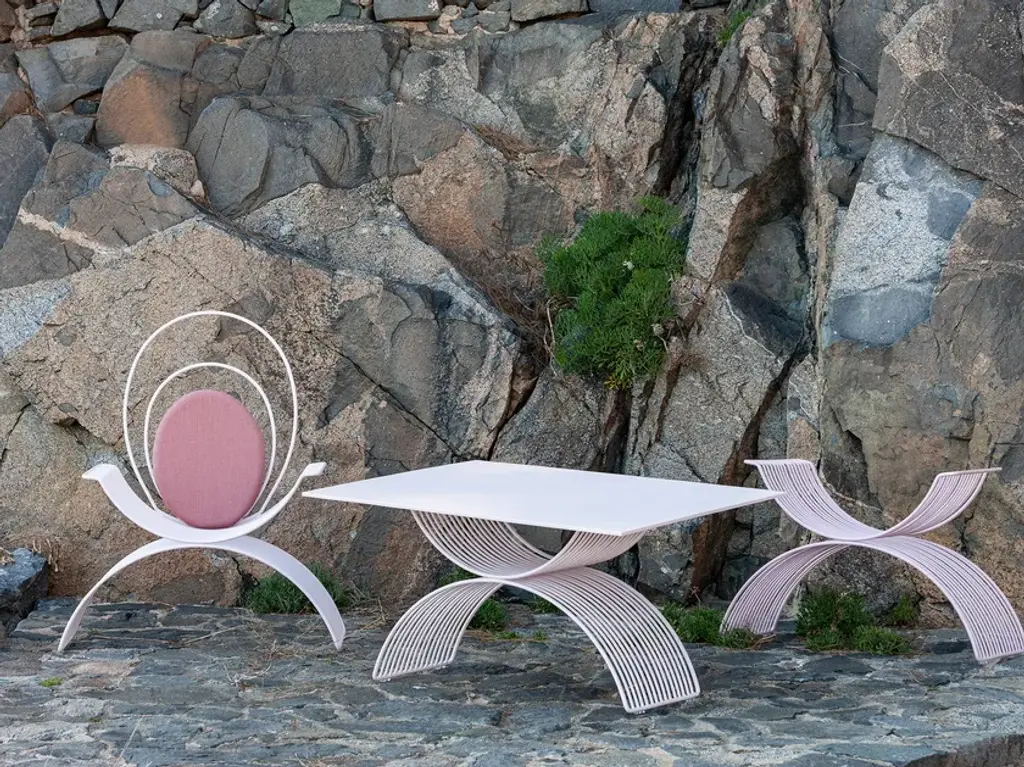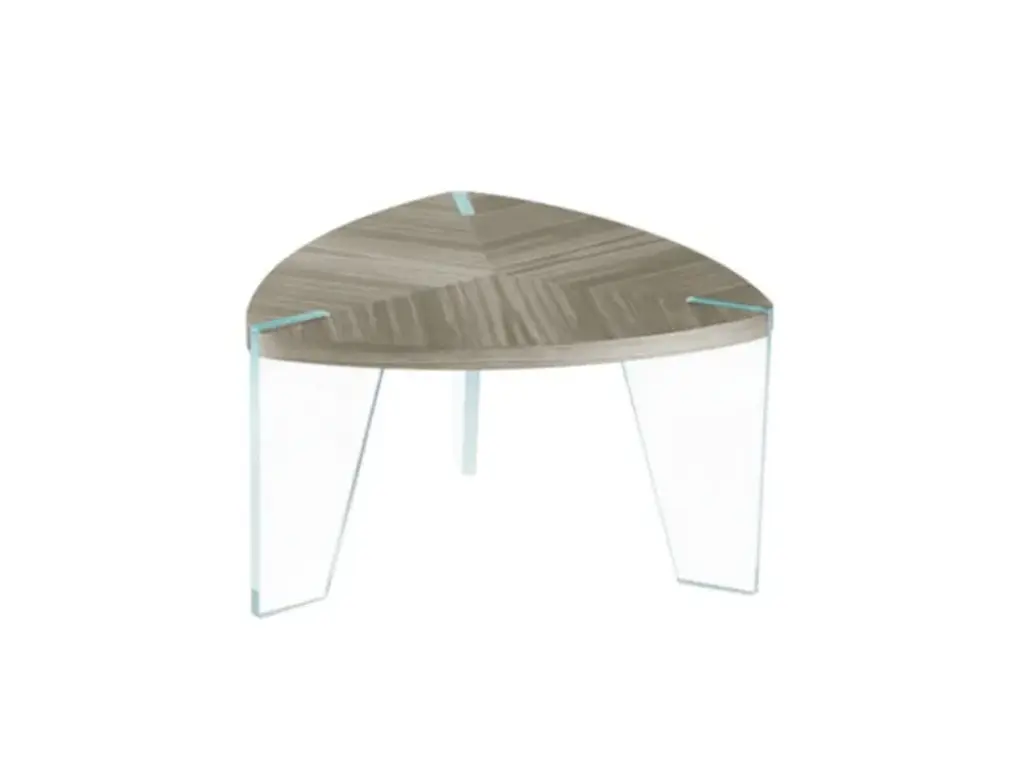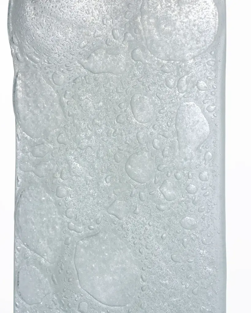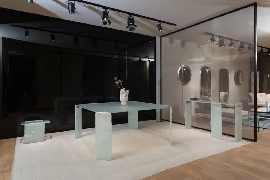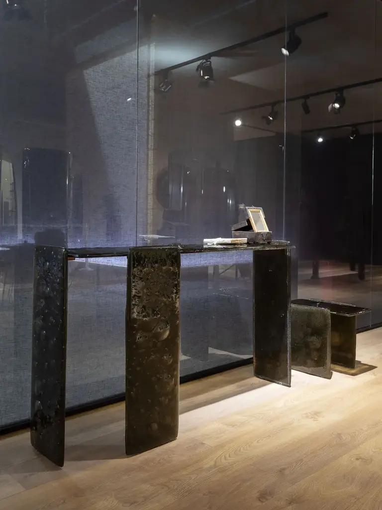 OPALIA is a collection of low tables, high tables, and consoles, with components made by melting glass offcuts with special additives to create irregular glass masses, rich in bubbles and featuring wavy surfaces. Available in extra-clear or bronze glass.In the high tables, when the legs are made of fused extra-clear glass, the top is in acid-etched extra-clear float glass; when the legs are in fused bronze glass, the top is in acid-etched bronze float glass.The removable legs are attached to the top using bonded plates and brushed anodized aluminum joints, available in silver, pink, green, or bronze.