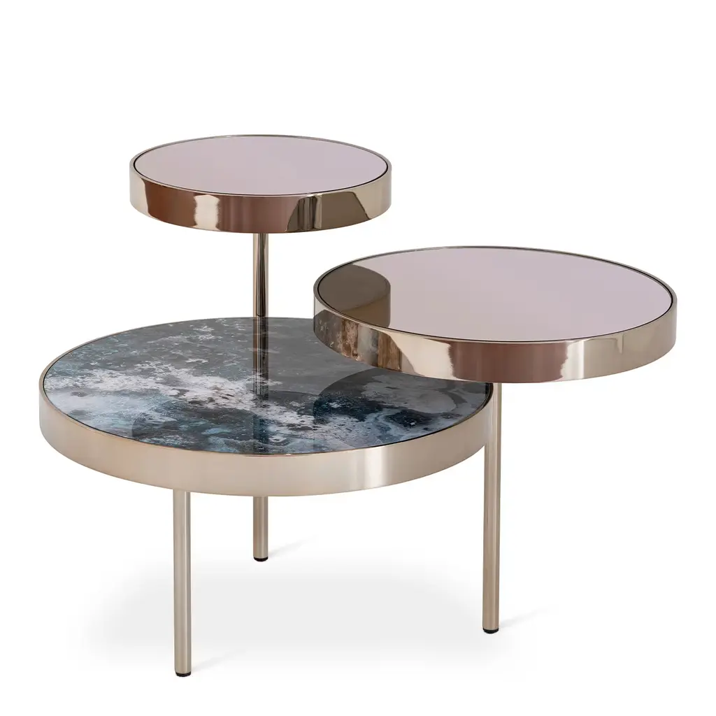 Displaying an extraordinary geometric game that sees three spheres balancing each other in delicate yet visually striking juxtapositions, this side table will make for an iconic and unique addition to a contemporary interior. It is handcrafted of metal finished in a polished gold shade and features glass sheets and smokey mirror tops. Please ask the Concierge for further details.