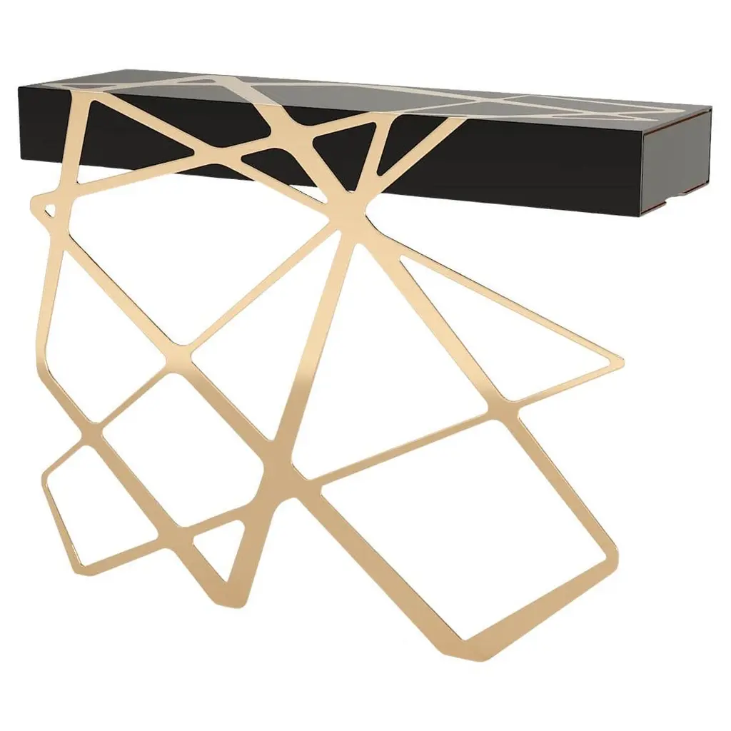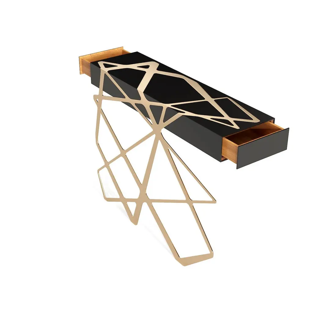 Inspired by the Sacred Ceiba trees in Havana, Joao Faria created the stunning Roots Console Table for contemporary homes. It is handcrafted using carefully selected wood veneers, metals, and materials. Many consider this piece a work of art, like a sculpture. The Roots Collection also includes coffee tables, mirrors, desks, and screens. Each piece is handmade by order, so we can manufacture it in endless combinations.This piece is entirely made in Portugal and artisanally by the author. Its manufacturing process is time-consuming because, among other complex operations, every wood insert is drawn, cut and fitted on the metal structure without the use of machinery. After the final wood shapes are ready, the tabletop is assembled and crafted using carefully selected wood veneers with natural patterns or a lacquered finish. The author himself chooses the wood veneer leaves and bookmatches them to achieve the best result in the piece. The final finish on the wood is a varnish to enhance the wood's natural beauty or to protect the lacquer.The metal structure supporting the tabletop, which appears to be floating, is made from very thick and resistant steel, stainless steel, copper, or brass, depending on the final version of the console.This listing is for a console mastercrafted from black lacquered wood and a thick brass structure brushed by hand, with transparent varnish to protect the metal from staining.However, we can manufacture it in customised options: Tabletop: It can be in different lacquer colours or wood veneers, such as ironwood, black oak, tineo, and ebony macassar. The wood finish can be matt, satin or high-gloss.Structure: You can choose between stainless steel, copper, brass, or lacquered steel. Stainless steel, copper, and brass can be finished in three different ways: polished, brushed, or in an "Industrial Chic" style. The author also handmade the "Industrial Chic" style, making every piece truly unique. The lacquered steel can be any RAL colour. The polished brass finish takes longer to manufacture than the brushed or "Industrial Chic" styles because the polishing operation is time-consuming and requires several steps for surface preparation. The console has two discrete drawers, in a different wood veneer, which adds a surprising touch, in all its versions. For extra security, the console must be nailed to the wall. We send all the hardware to attach it.If you're interested in a custom-made option, please contact us.This piece is assembled and delivered in a wooden box wrapped in bubble wrap. Labour of love from Portugal.Designer/Author - Joao Faria/Emotional Objects.Manufacturer - Joao Faria/Emotional Objects.At Emotional Objects, we don't follow trends or fashion. Instead, we create distinct and timeless objects with solid ideas and concepts. Every Emotional Object has a meaningful story behind it. Made to last for generations, we proudly see our objects as future furniture classics that will stand the test of time.Working in Portugal with the best artisans, Joao Faria's work is difficult to distinguish between functional and fine art. He uses the finest materials and techniques, but most importantly, he only makes pieces he would want for himself.Art Furniture, Unique, Tailored, Emotional, Truly Yours.