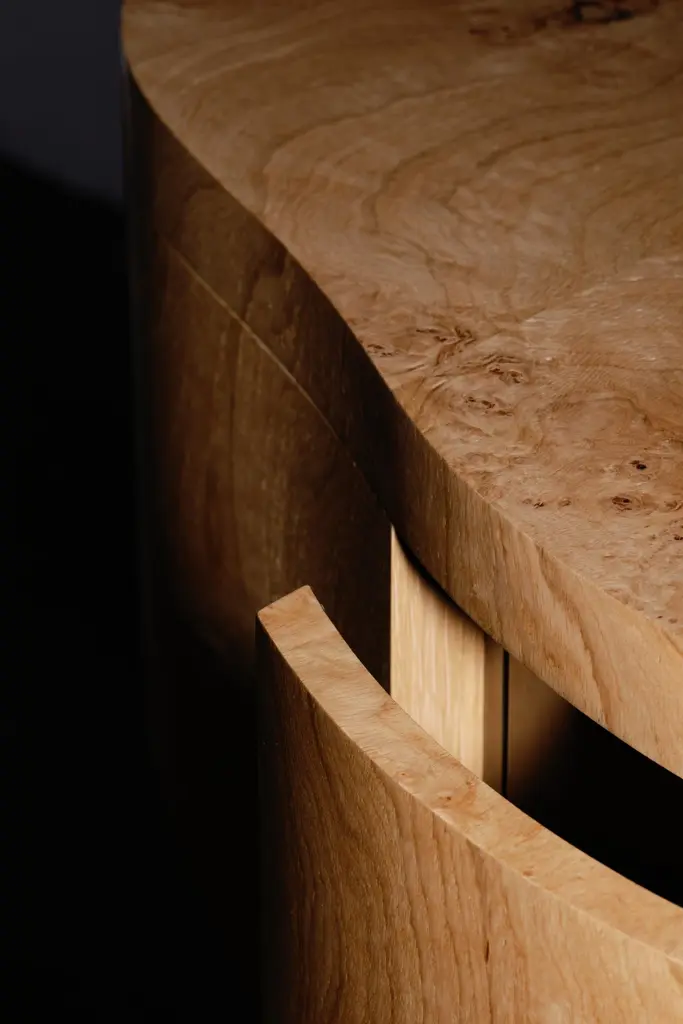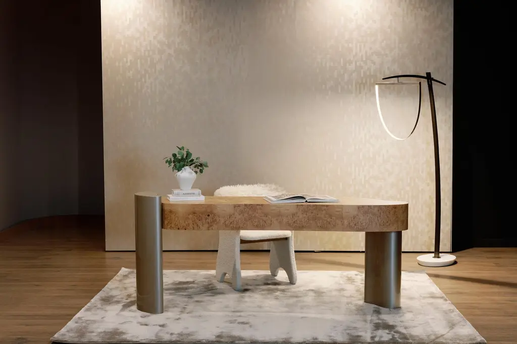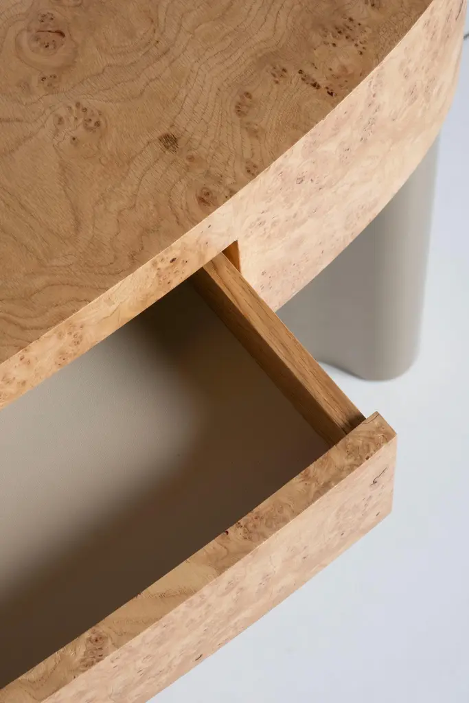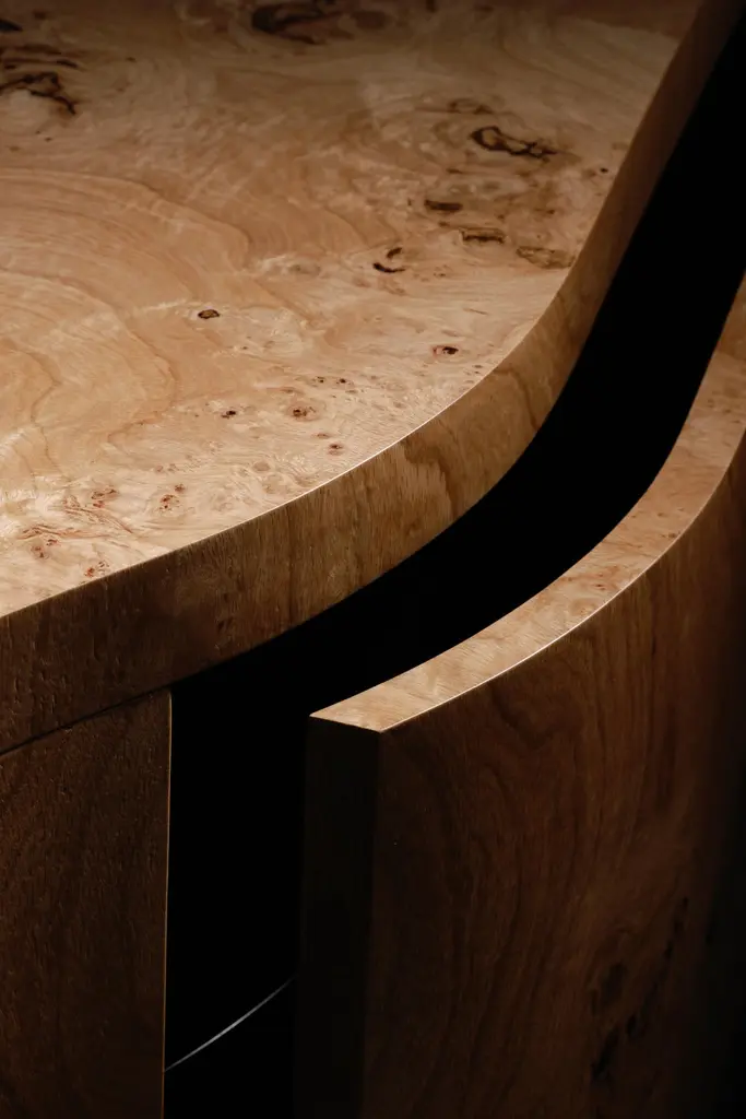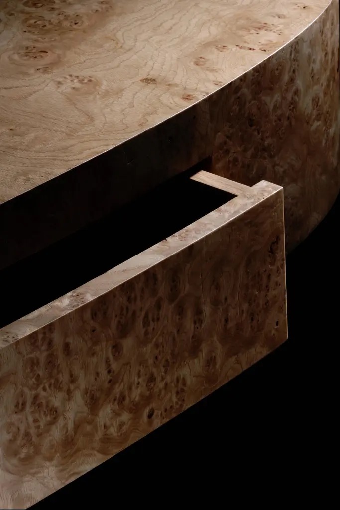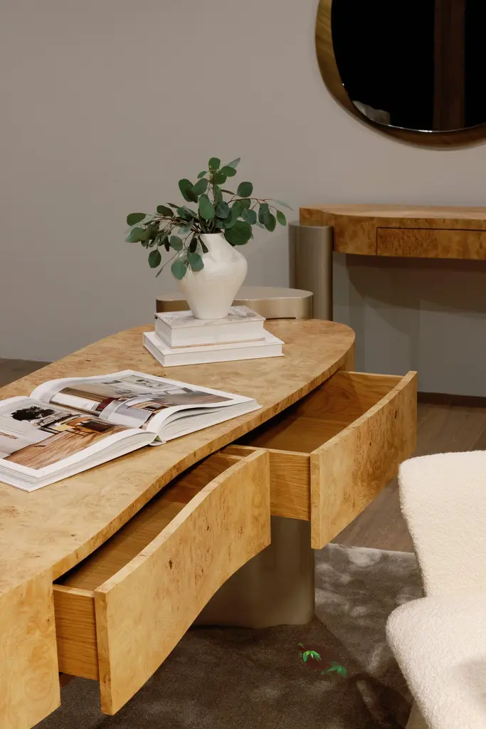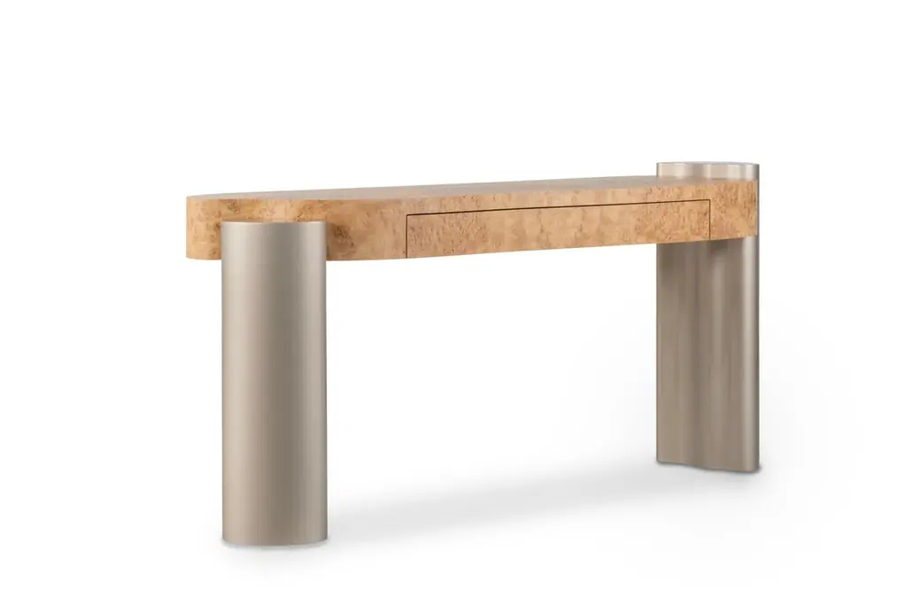 Organic Modern Formosa Console, Contemporary Collection, Handcrafted in Portugal - Europe by Greenapple.The Formosa console table is inspired by the tranquil landscapes of Ria Formosa, translating its organic beauty into a sculptural design. Bold cylindrical legs contrast with the fluid lines of the tabletop, creating a sense of movement and balance. Designed to stand out with understated elegance, the Formosa console table reflects Greenapple’s dedication to exclusive design and masterful artistry.The Formosa console features a module with one drawer in natural white oak root with open-pore and a matte varnish. The veneer is anti-fungal and vermin-free, ensuring longevity and preservation.The drawer bottom is lined in light beige leather.This module is supported by two wooden bases lacquered in gold champagne with a high-gloss varnish.The Formosa console can be customized in terms of dimensions, materials and finishes.Formosa Console Material CodesFI073 Lacquered, Varnished, Gold Champagne, High-GlossWD105 Oak Root, Open-pore, Varnished, Natural White Oak Root, MatteM105649 Leather, Light BeigeHandcrafted in Portugal - Europe by GreenappleUnique by design, Crafted by peopleGreenapple transforms contemporary spaces into exclusive narratives of design and craftsmanship. From custom-made furniture to bespoke interiors, each creation is a timeless work of art, shaped by master artisans who honor centuries-old techniques.Founded in 2005 by Sérgio Rebola and Rute Martins, Greenapple has earned global recognition among high-end clientele and leading design firms. While Rute designs each unique piece, Sérgio ensures uncompromising quality from design to production and from production to your home. We provide a seamless experience, offering short production lead times, worldwide delivery within 7 to 10 days, and white-glove service upon request.For U.S. clients, we can handle all customs clearance, cover duties, and offer white-glove service as well upon request.Entry Table, Foyer Table, Hall Table, Pier Table