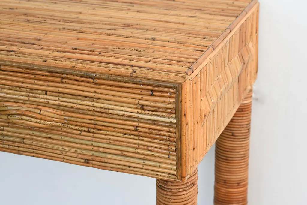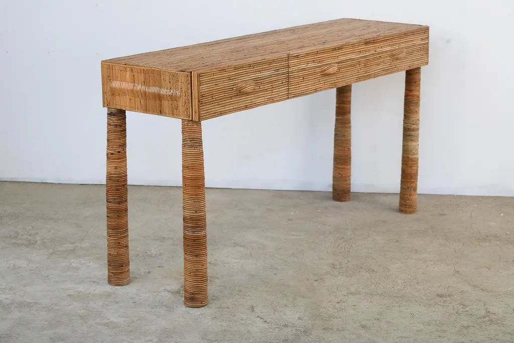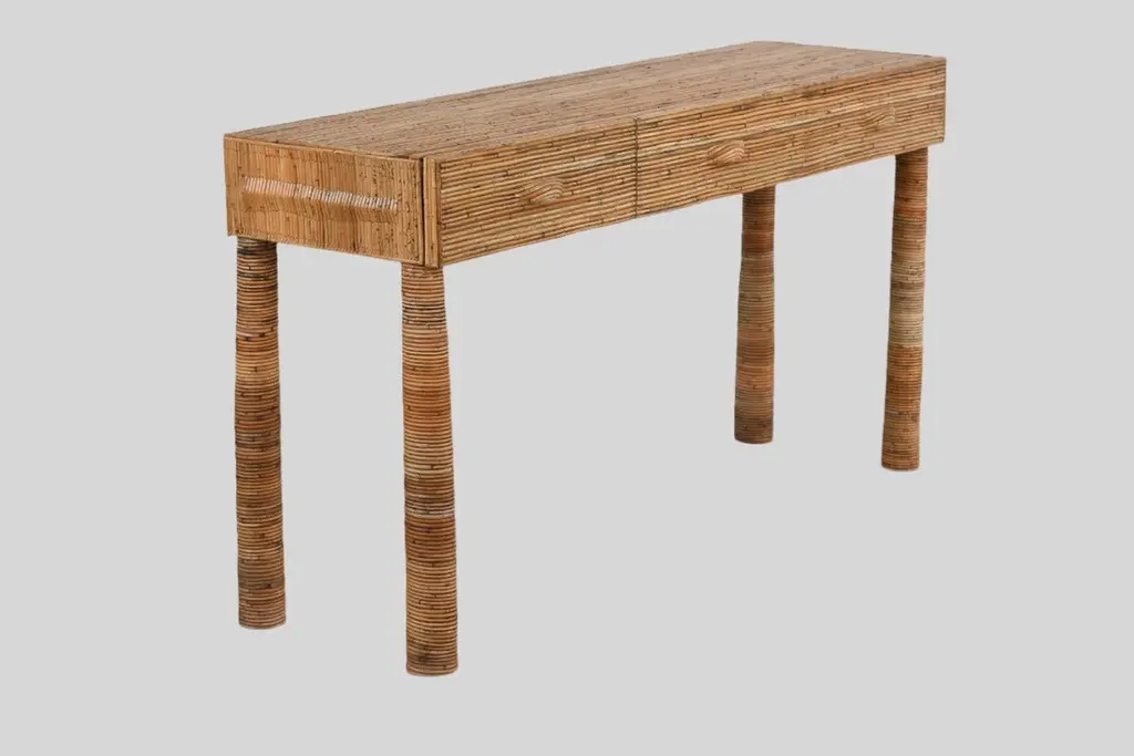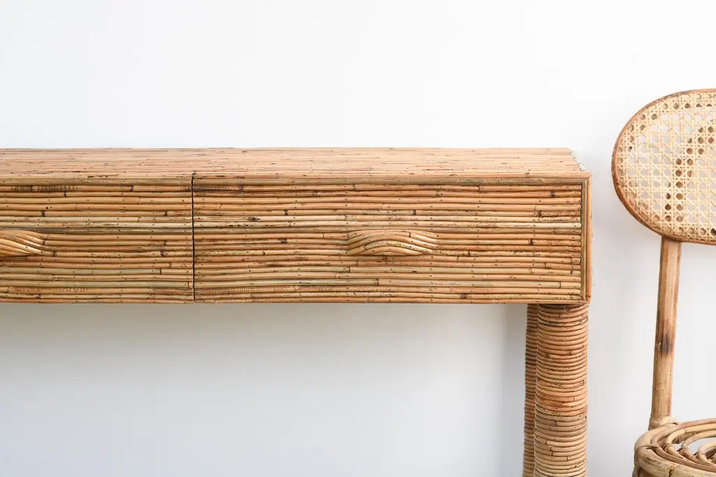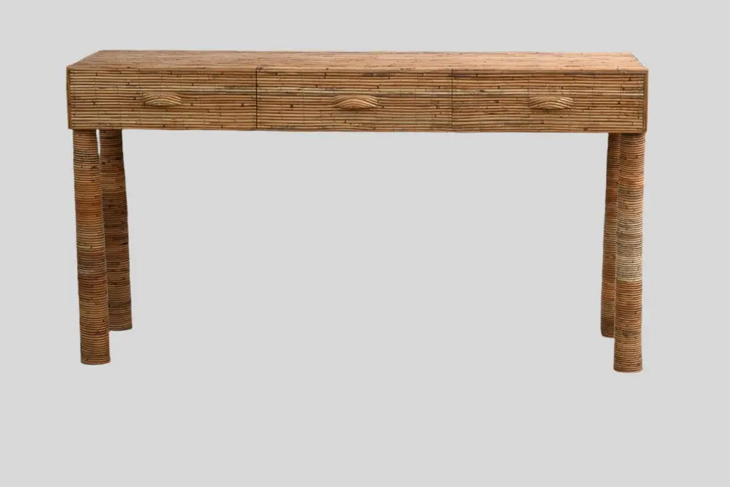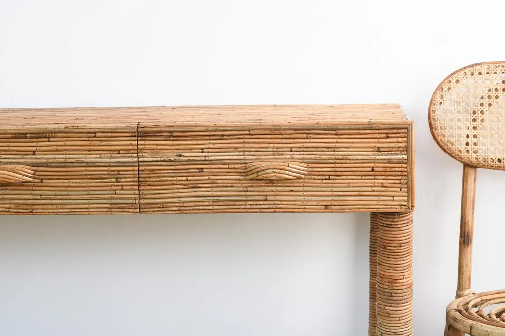 “Cardi” is Crafted entirely from sustainably sourced organic rattan and cane, this console table embodies earthy sophistication. Its rattan texture celebrates natural imperfections—each rattan piece tells a story of artisanal craftsmanship, creating a softly tactile surface that radiates warmth and organic charm. Thoughtfully designed with three smooth-gliding drawers, concealed behind a facade of intricately rattan inlay. The discreet integrated handles are masterfully bent into the material itself, ensuring the uninterrupted flow.- 100% organic rattan & cane, ethically harvested and handcrafted.-Three spacious drawers with handles that visually blend into the façade, preserving the table’s harmonious aesthetic. -Lightweight yet sturdy frame with tapered legs, evoking a sense of floating grace. (Legs are removable and can be wall mounted).-Perfect for entryways, living rooms, or as a serene bedroom accent. Complements bohemian, coastal, minimalist, and modern organic interiors. Dimensions: Height: 80 cm (without legs 16cm Width: 148.5 cm Depth: 45.5 cmDrawer Depth: 36.5 cm (each)