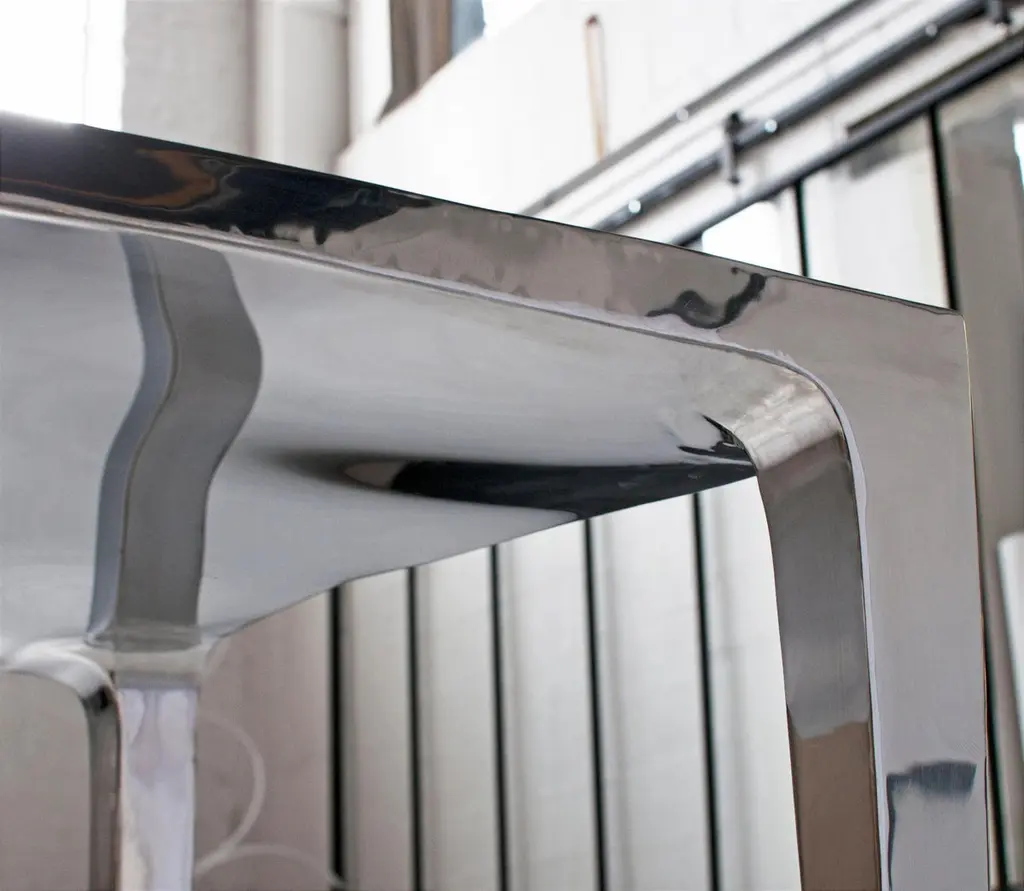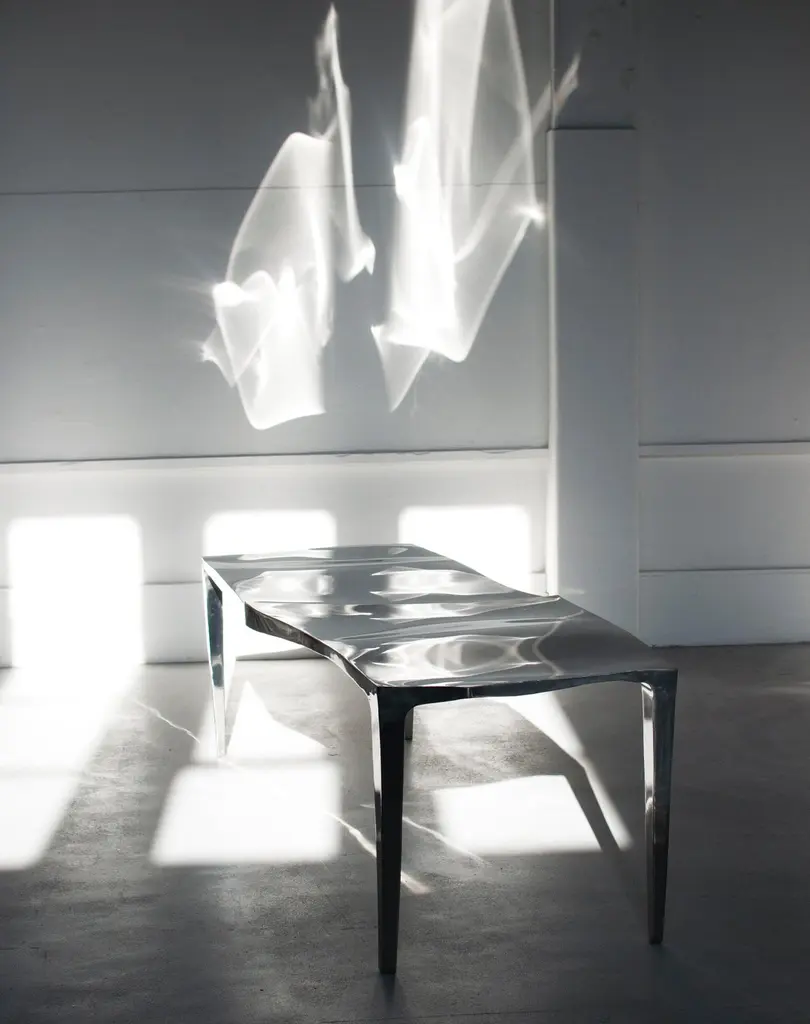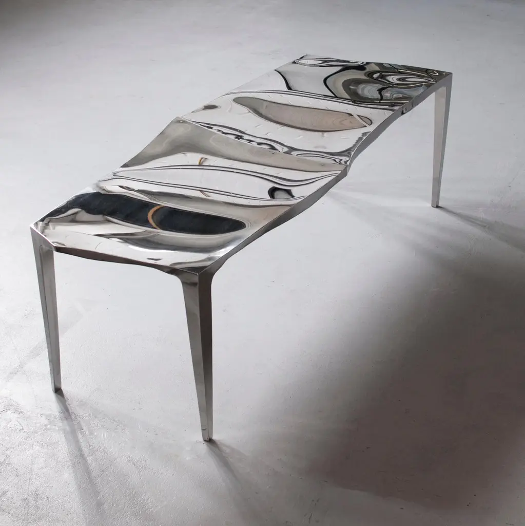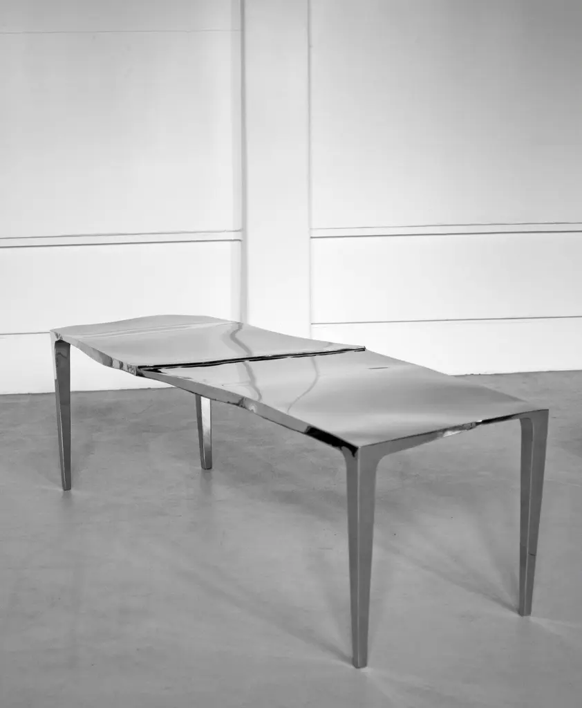 Organic Table by Pol Quadens Unique Piece.Dimensions: D 95 x W 250 x H 75 cm.Materials: Polished stainless steel.Pol Quadens was born in Brussels. His father was active in the fields of composites the metal industry, and the world of materials, therefore, surrounded Pol since his early childhood. After his artistic studies, he starts restoring vintage cars. This experience has allowed him to gain strong practical skills and a deep knowledge of all materials.In 1987, he made his first creations and production of objects. His sensitivity and passion for the arts led him to create functional artworks. His CD shelf has sold more than 100,000 pieces and has become iconic in its category.