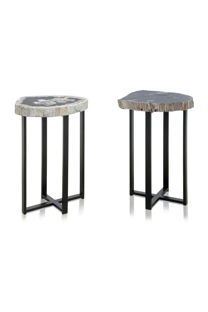 A nature's artistry, this Versmissen Petrified Wood Occasional Table is a striking addition to any space. The petrified wood, formed over millions of years through permineralization, replaces organic matter with minerals while preserving the original structure. This unique process results in a three-dimensional representation of the ancient tree. Paired with a black iron base that criss-cross at the bottom, this table combines natural beauty with industrial charm, adding a distinct character and depth to any room.
