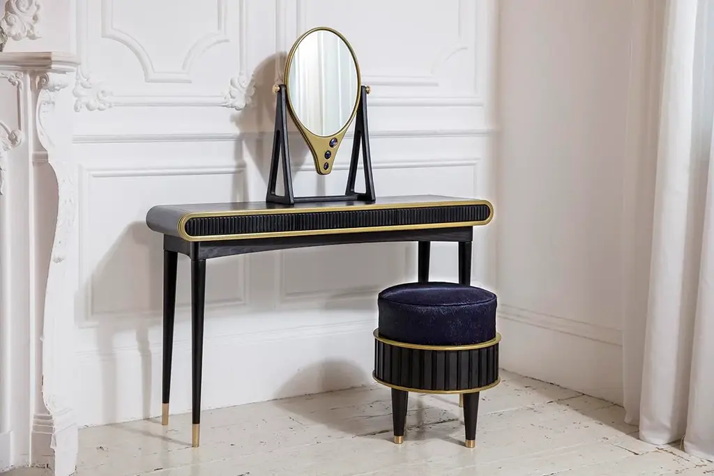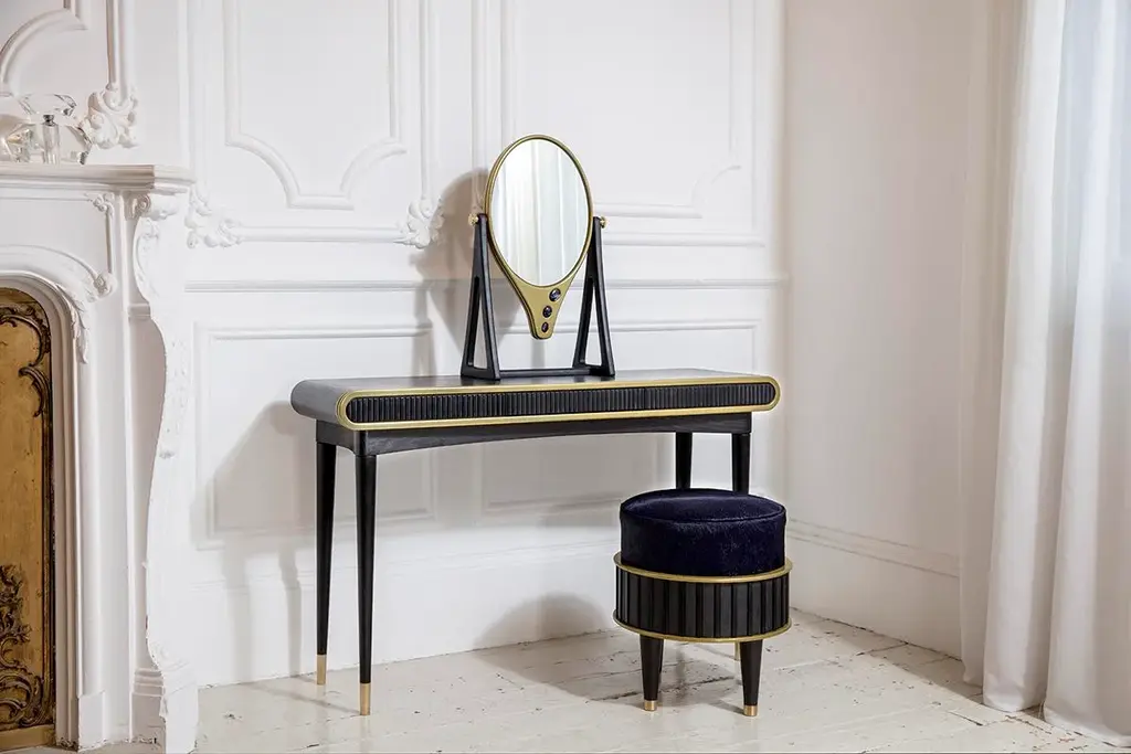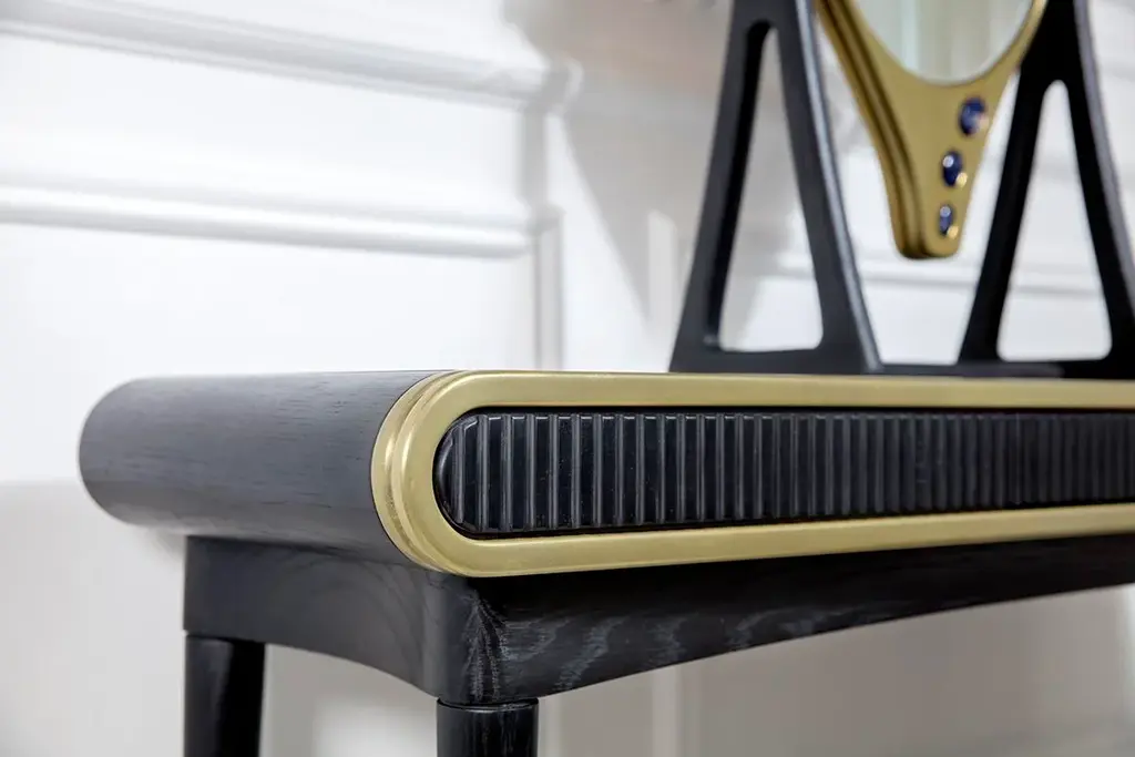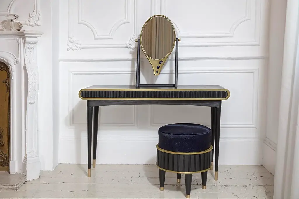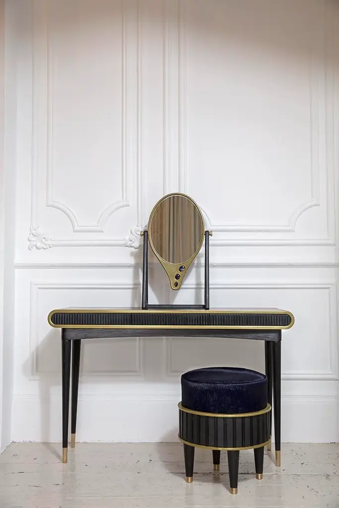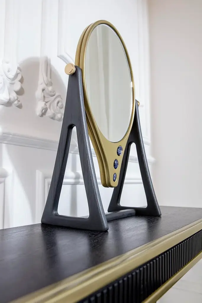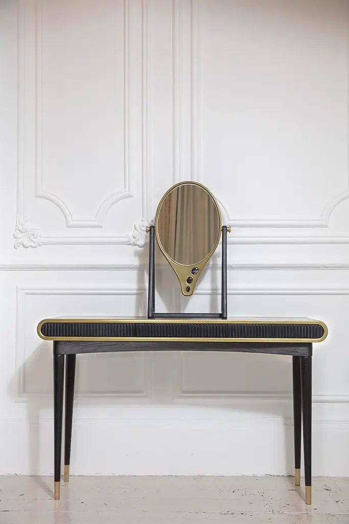 An alluring and striking dressing table with sodalite stone and brass accents and a free-standing mirror. Designed and produced by Award winning London based designers Rebecca James and Andrea Felice. This piece is part of Collection 1 and is handmade in Andrea's London studio.