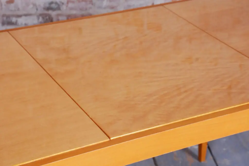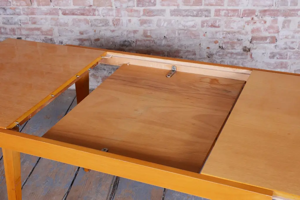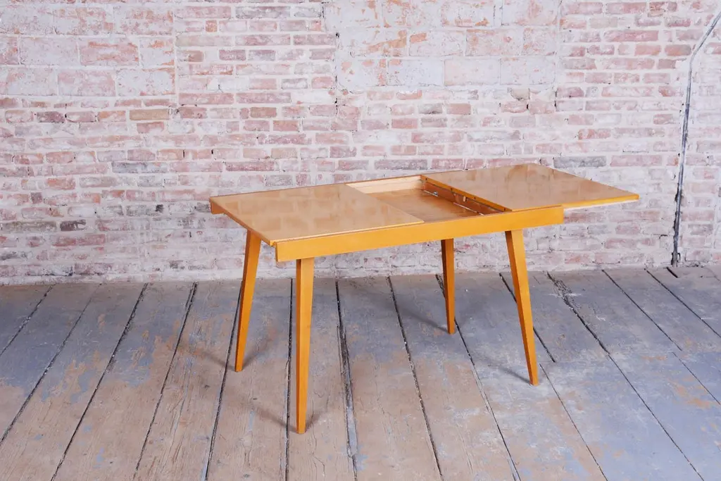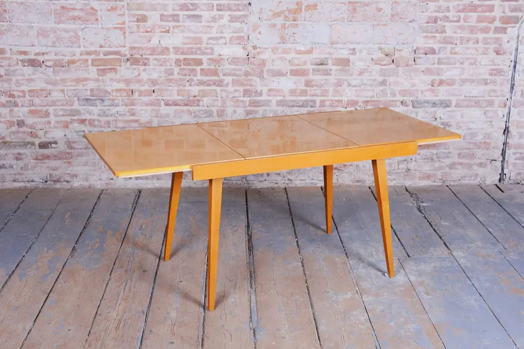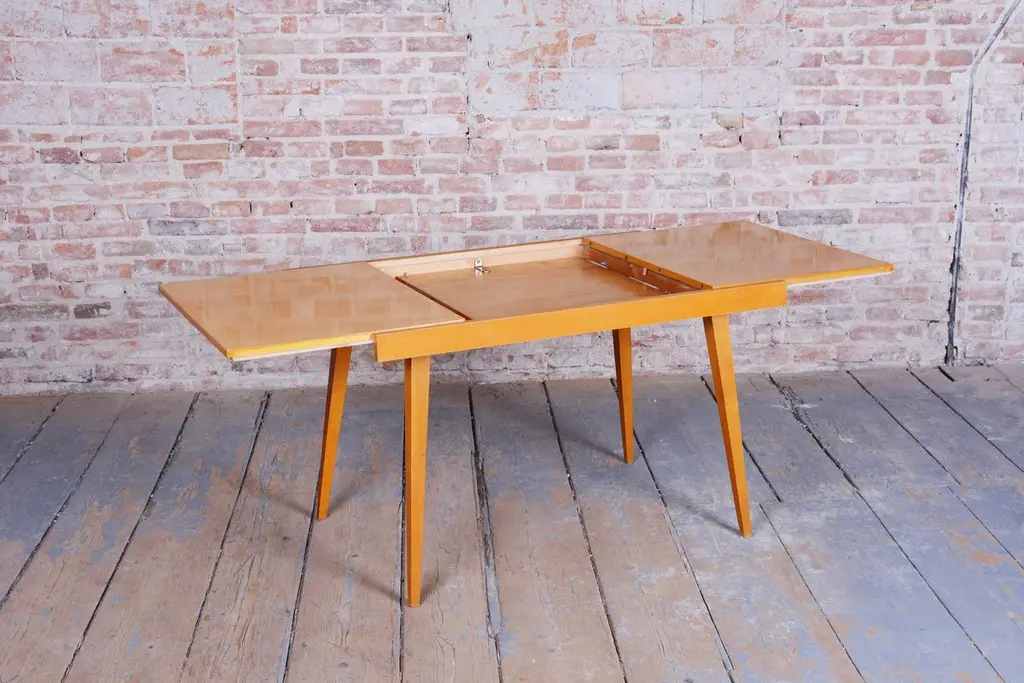Restored Mid-Century Oak Folding Table.Source: CzechiaPeriod: 1950-1959Material: Ash, BeechDissociative: 180 cm / 70.87″Revived polish. It has been re-polished with polyutherane piano lacquer by our professional refurbishing team in Czechia according to the original process.Our professional refurbishing team in Czechia has fully restored it according to the original process. This item features classic Mid-Century Modern (MCM) design elements. Elements of MCM interior design include clean lines, muted tones, a combination of natural and manmade materials, graphic shapes, and vibrant colors. Perfect for livelier, more colorful spaces.