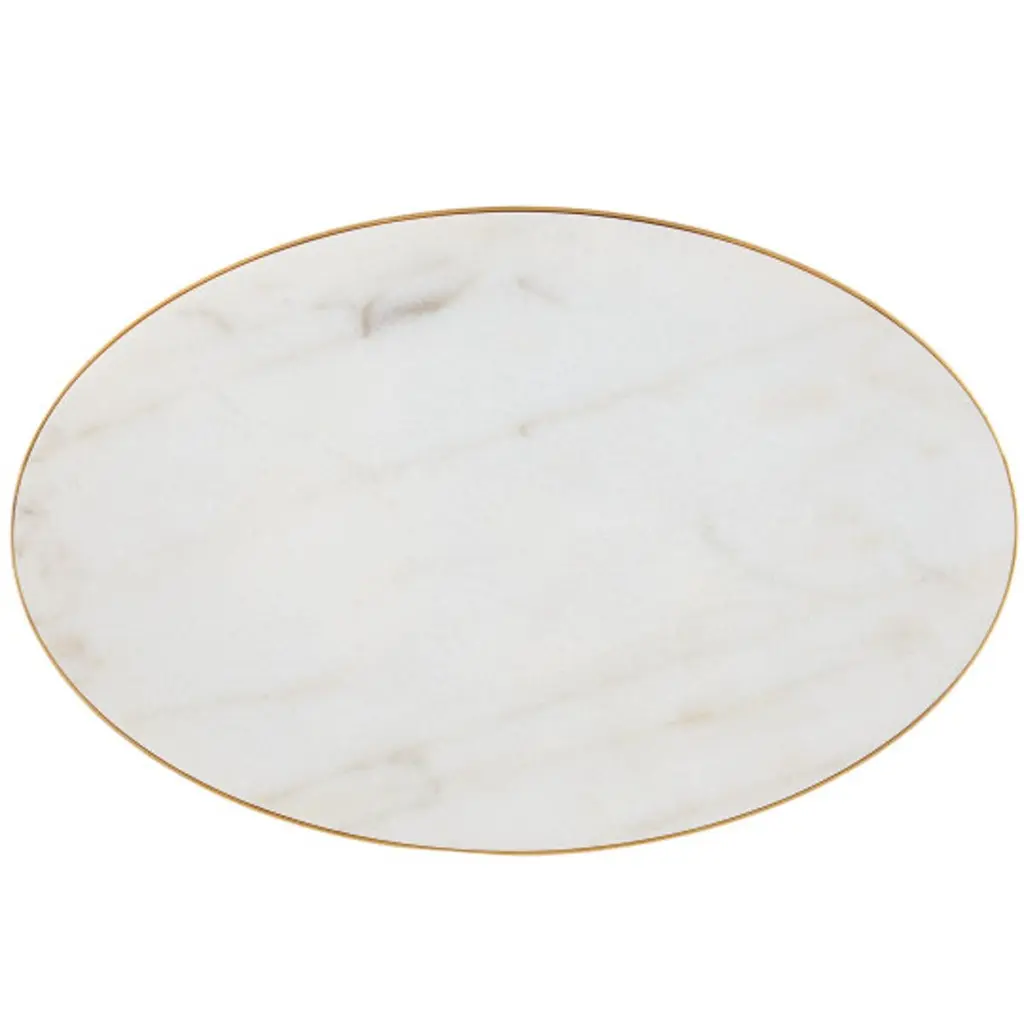 The Orla C Table is a cantilever table with delicate lines. Thin ribs of metal rise up from the oval base to support the oval top. The luminous finish on the metal contrasts the crisp inset marble top. The base has tiny ball feet that lift it slightly off the floor.