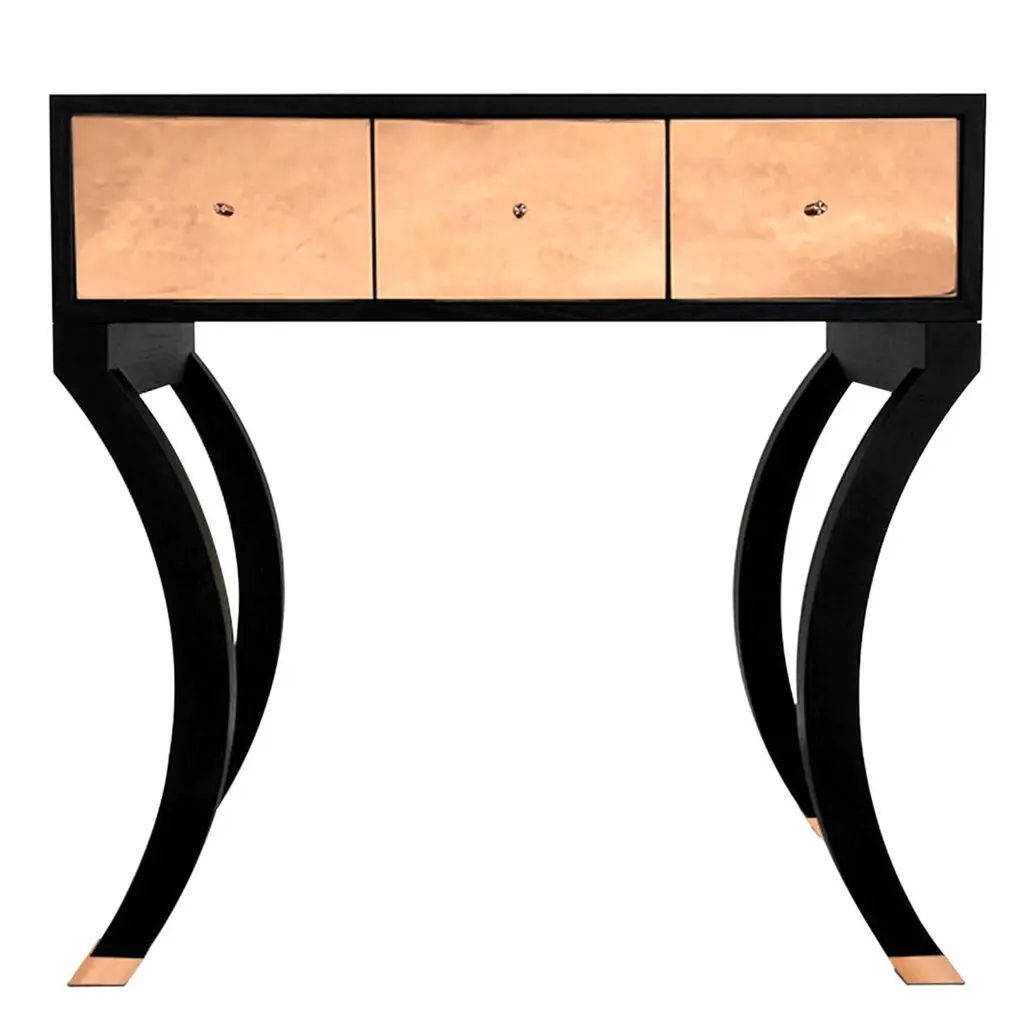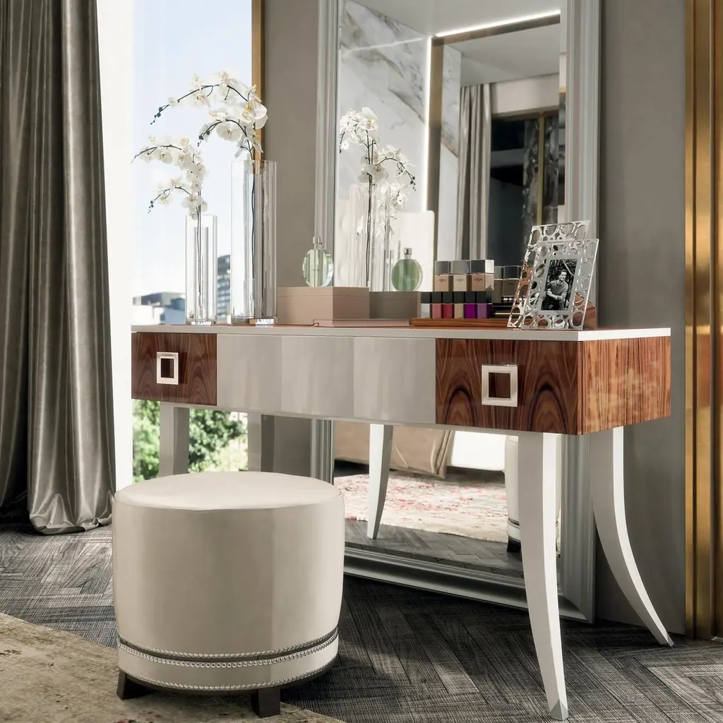 This captivating vanity table featuring 2 side drawers and 1 central drawer with push pull blumotion is a furnishing piece of refined quality. Crafted with elements in Santos rosewood, it offers a splendid polished finish and silver leaf detail for an attractive design that will suit any setting with a contemporary, cosmopolitan flavor.