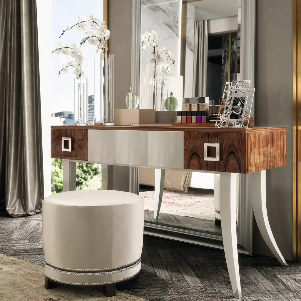 This captivating Vanity Table featuring 2 Side Drawers and 1 Central Drawer with push pull blumotion is a furnishing piece of refined quality. Crafted with elements in santos rosewood, it offers a splendid polished finish and silver leaf detail for an attractive design that will suit any setting with a contemporary, cosmopolitan flavor.