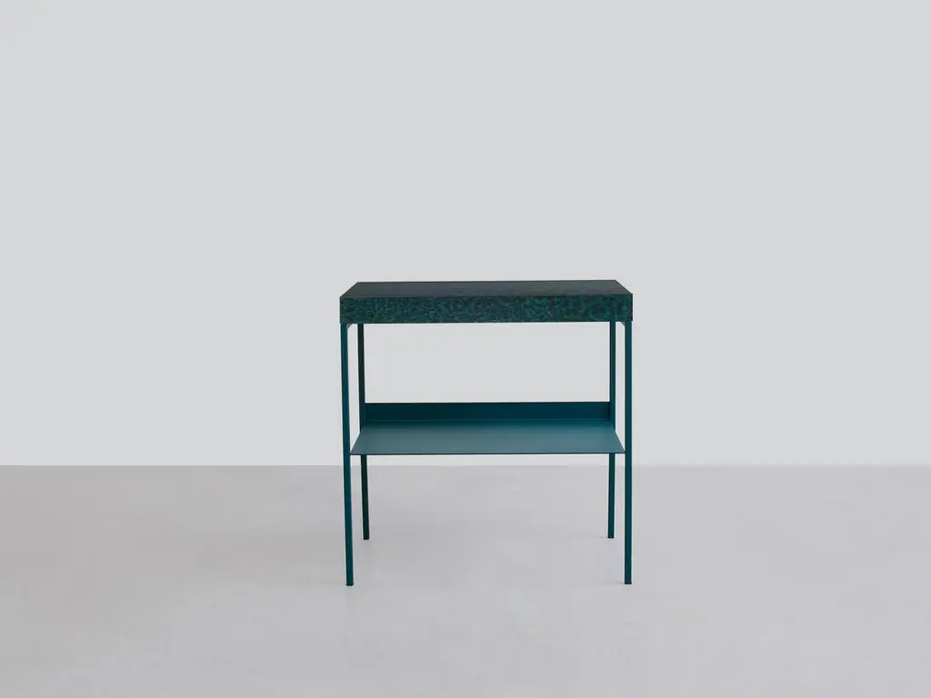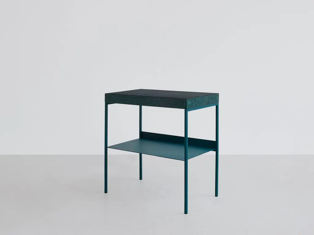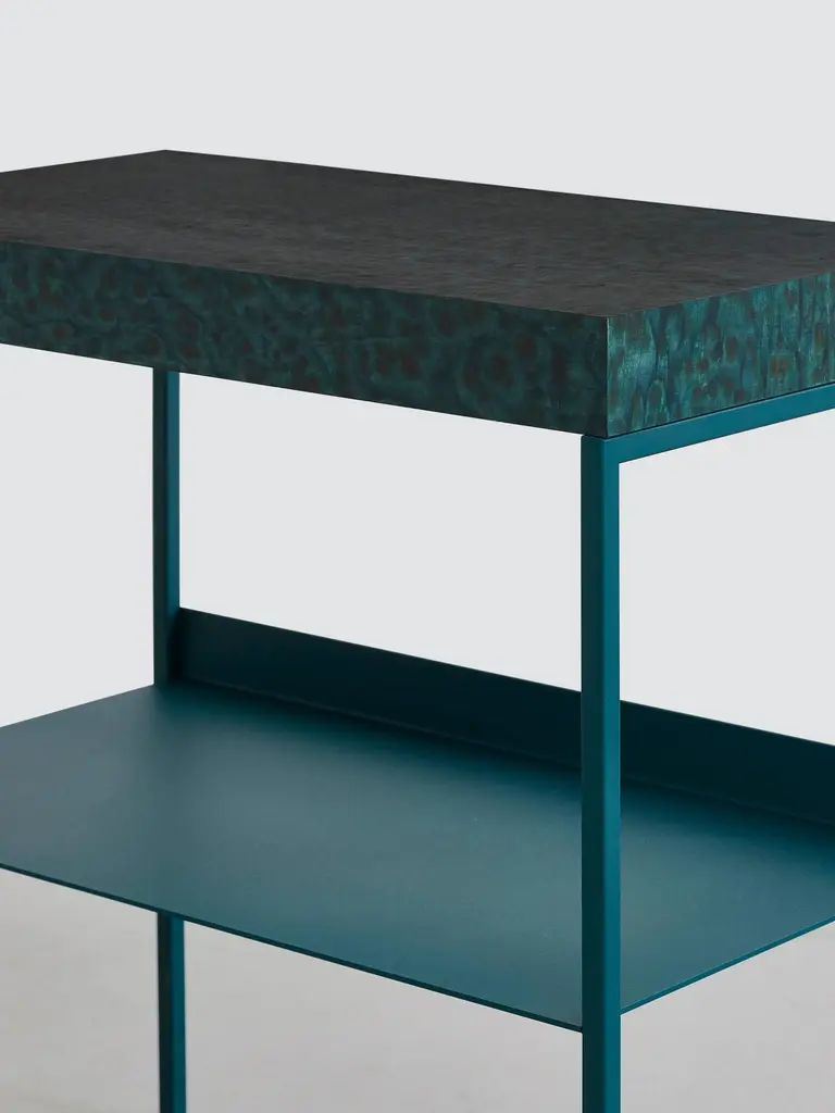 Osis Inga side table by Llot LlovDimensions: H 65 x W 66 x D 37 cmMaterials: birchFinishing: lacquered / powder-coated steelThe surface finish OSIS is an innovation developed by llot llov in Berlin and is 100% handmade.We transferred the effects of osmosis caused by salt onto the wood. The surface is glazed monochrome or multi-coloured. Salt is spread on the wet surface in different techniques. Soon the natural process starts. Salt has the capacity of absorbing liquids from its environment and collecting pigments of paint at the same time. The results are determined by the different kinds of salt we use, humidity, and length of reaction time.When combined with birch wood, the salt draws the pigment into the natural flow of the grain, emphasizing the unique features of the original material.The color range and variety of patterns are as endless as their applicability.Behind the LLOT LLOV brand is the studio for product and interior design as well as the producer of furniture, objects, lighting and surfaces. Since their foundation in 2006 by Ania Bauer and Jacob Brinck, the two Berlin based author designers have established themselves internationally. One of their recognizable features is the reinterpretation of traditional arts and crafts brought into a contemporary design context.An example of this is OSIS, an innovative surface finish using salt crystals and colour pigments on wood, with which they won the German Materials Prize, among other awards. They use OSIS as well as the terrazzo GLACIER, which was introduced in 2018 and is made of nail polish bottles, for their own designs, but they also supply interior designers worldwide. For GLACIER, as for other designs, they upcycle high-quality materials, for example from the cosmetics industry. Their objects are manufactured in Europe, often in social workshops, and distributed directly by LLOT LLOV.LLOT LLOV produce exclusive furniture and objects for private or corporate clients and also manage interior design projects such as hotels or offices. In addition, the duo has been running a shop for fashion and accessories in Berlin-Mitte with BAERCK since 2007.