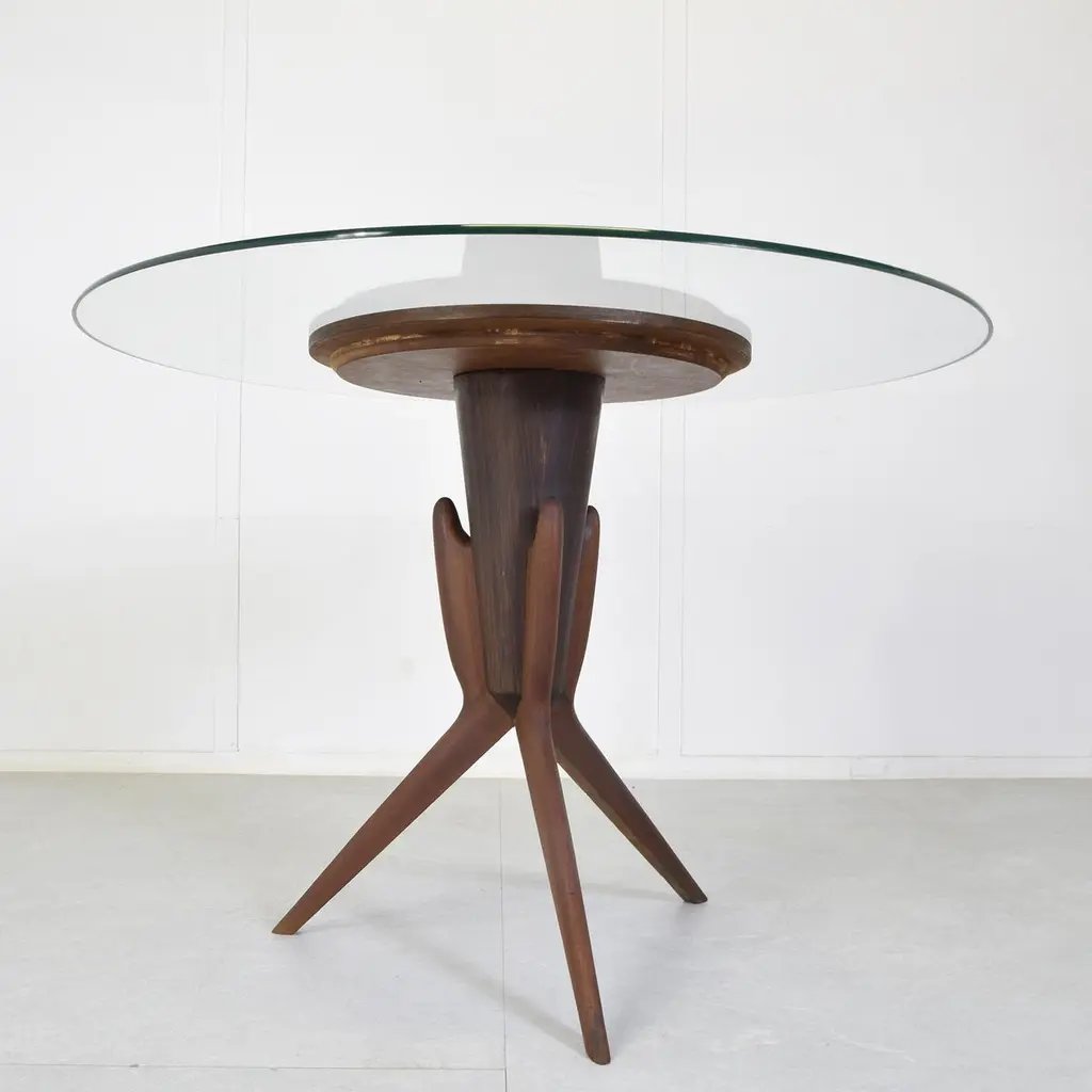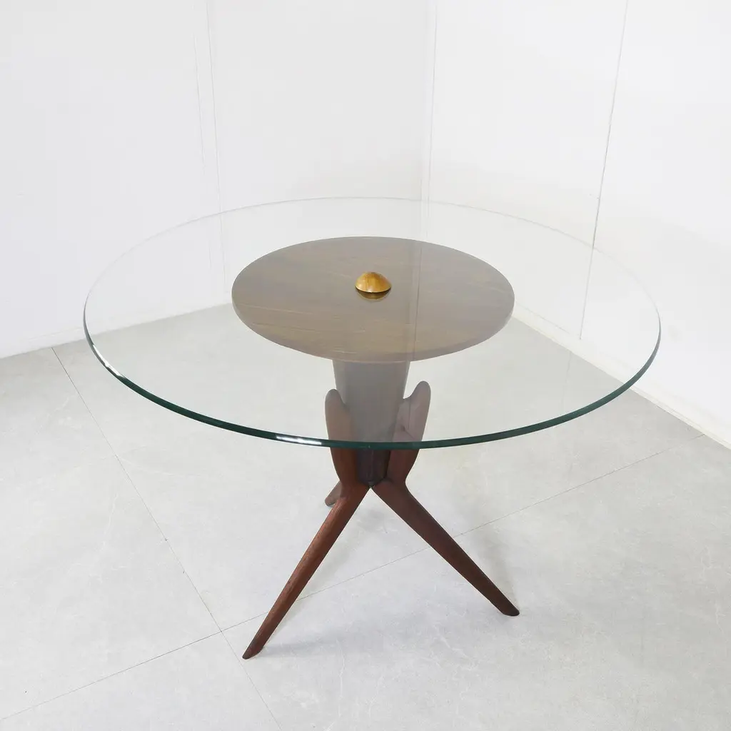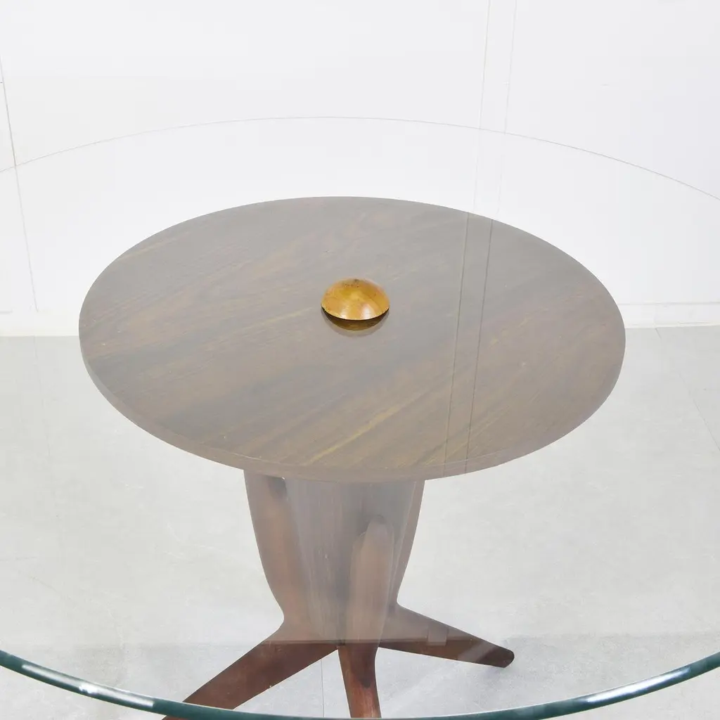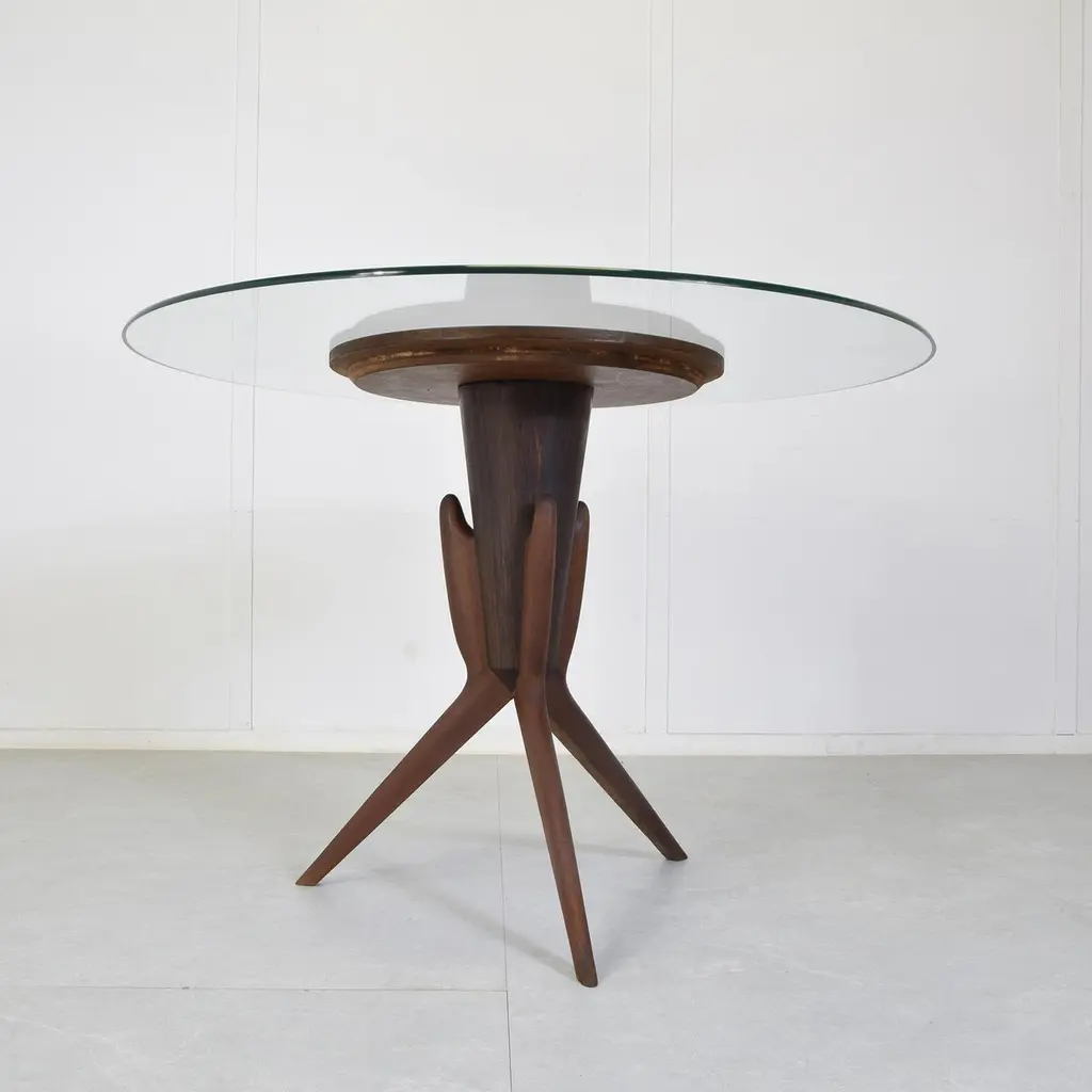 Stunning round wooden and crystal table, attributed to the famous Italian designer Osvaldo Borsani. The wooden base with its characteristic shape and clear crystal top give the table a timeless elegance , 1960s.When you purchase vintage design products on our website, the cost includes secure and careful packaging. Each item will be protected with a wooden crate or suitable packing materials to ensure it arrives in perfect condition.