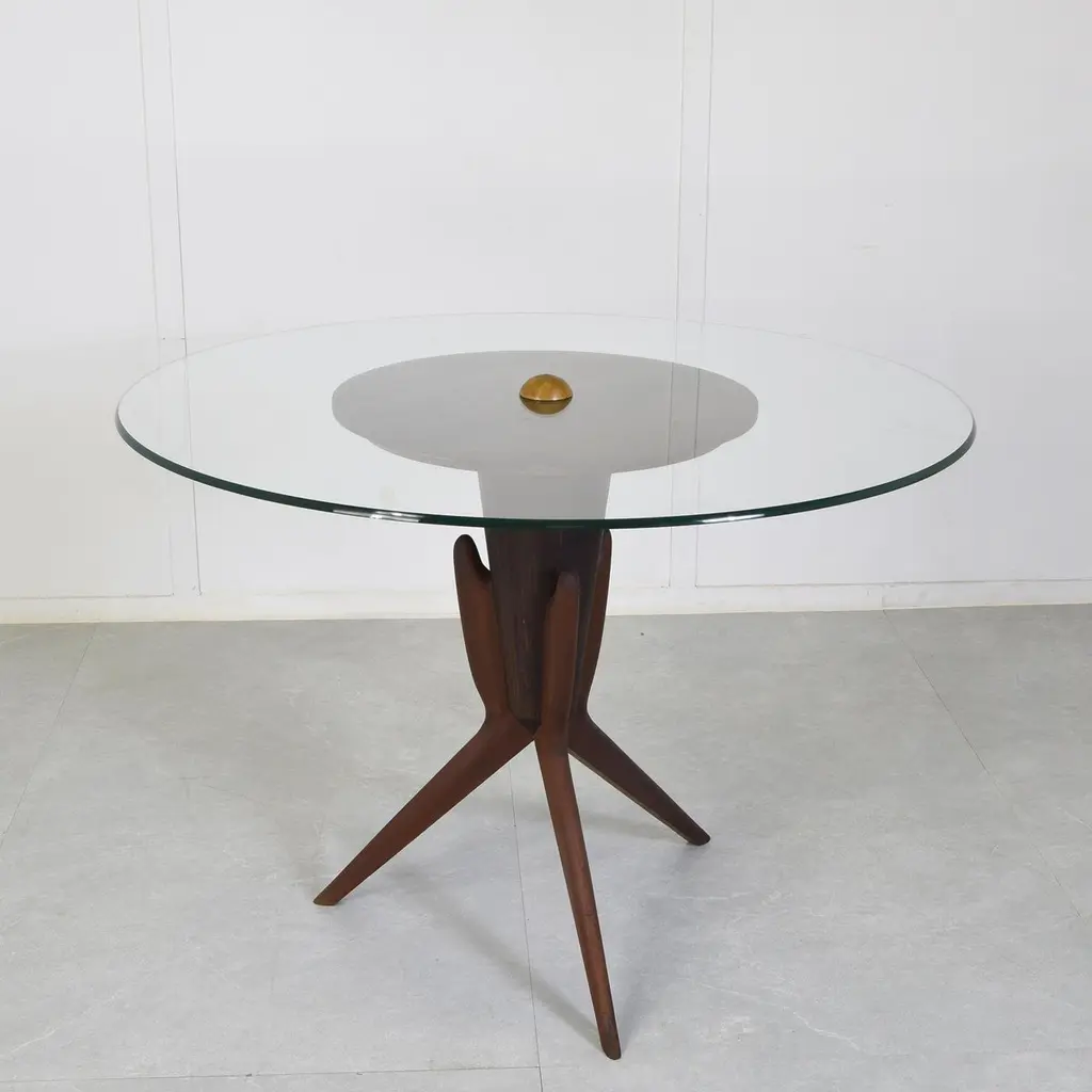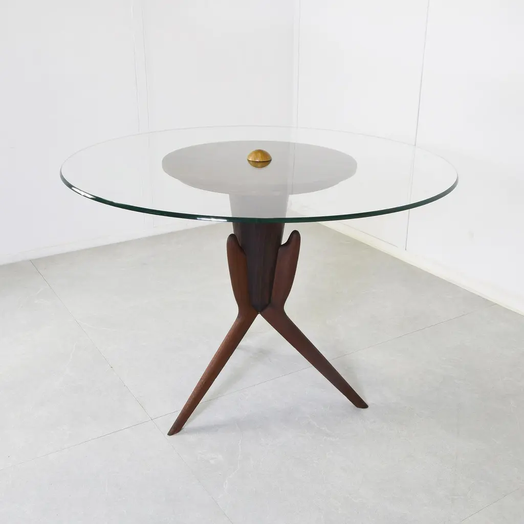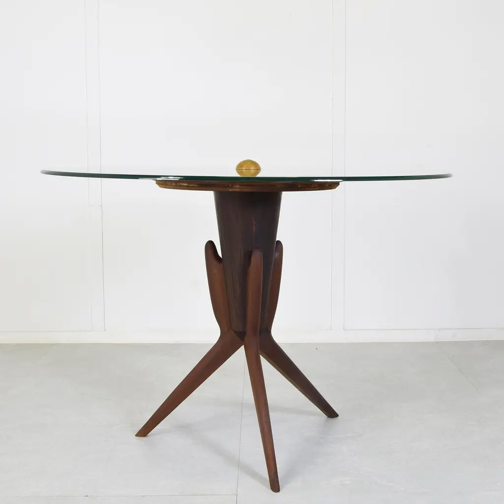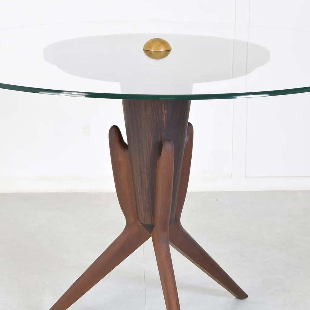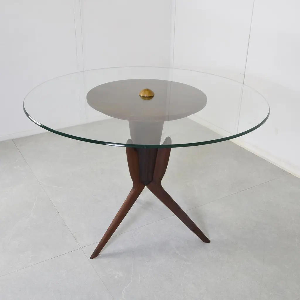 Stunning round wooden and crystal table, attributed to the famous Italian designer Osvaldo Borsani. The wooden base with its characteristic shape and clear crystal top give the table a timeless elegance , 1960s.When you purchase vintage design products on our website, the cost includes secure and careful packaging. Each item will be protected with a wooden crate or suitable packing materials to ensure it arrives in perfect condition.