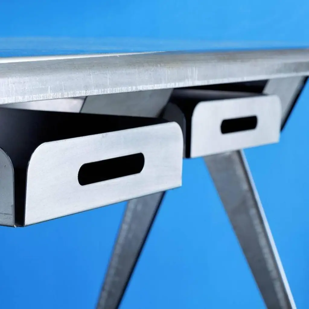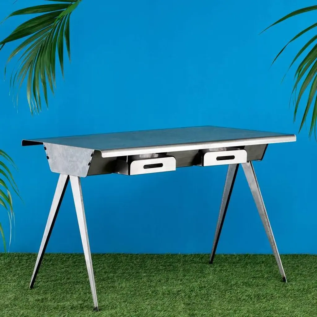 Elegance and functionality come together in this writing table. The delicate frame of this piece is crafted in sheets of steel and is fashioned with different folds forming the edges of the table's top and the two drawers that slide out from underneath it. Its simplicity and its perfect geometric proportions make this piece ideal for any home. Its lightweight shapes don't overwhelm the environment but instead compliment it. This piece is available in other vivid colors for a unique and original look.