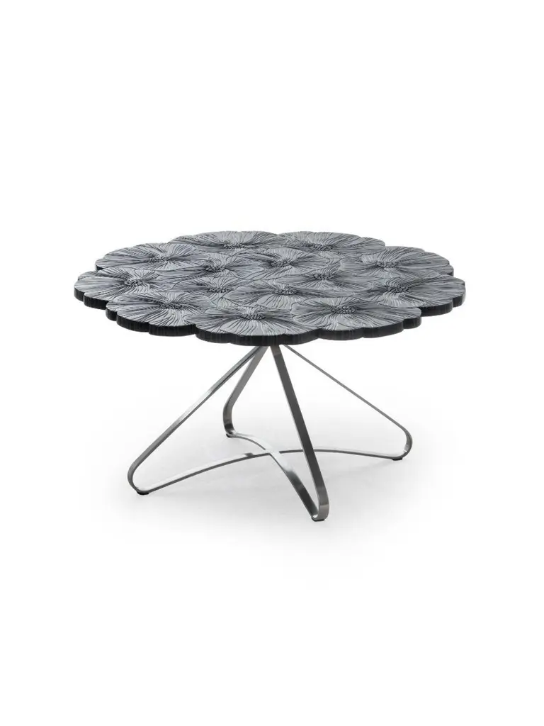 Bouquet coffee table by Kenneth Cobonpue.Materials: Fiberglass reinforced polymer, and stainless steel.Dimensions: Diameter 75 cm x height 40 cm.An exquisitely eye-catching centerpiece, Bouquet makes any day feel like a special occasion. The delicate lines of the signature floral relief pattern complete the contrasting resin top and stainless steel base.Also available in other sizes and colors. Please contact us for more information. Designer's BiographyKenneth Cobonpue is a multi-awarded furniture designer and manufacturer from Cebu, Philippines. His passage to design began in 1987, studying Industrial Design at the Pratt Institute in New York. While completing his studies, he apprenticed for a leather and wood workshop near Florence, Italy. He went on to study Furniture Marketing and Production at the Export-Akademie Baden-Württemberg in Reutlingen, Germany, under a private and state scholarship program, and subsequently worked in Bielefeld and Munich.Kenneth returned home to Cebu in 1996 to manage Interior Crafts of the Islands, Inc., a furniture design and manufacturing company founded by his mother Betty Cobonpue in 1972. Discovering that modern design could have a new face using natural fibers and materials, Kenneth created pieces of functional art, offering an alternative to the Western definition of modern design. Today, the Kennethcobonpue brand has become known globally for its unique designs and extensive roster of clientele, including Hollywood celebrities and members of royalty.With his masterful way of integrating nature, traditional craft and innovative technologies, designer and creative director Kenneth Cobonpue has earned international awards and recognition for his creative, organic, and expressive pieces. Working closely with some of the world’s leading designers, from household names to emerging talents, Kenneth has been pushing the envelope for design in the Philippines and sharing his vision to a global audience. Awards to his credit include five Japan Good Design Awards, the grand prize at Singapore International Design Competition, the Design for Asia Award of Hong Kong, the American Society of Interior Design Top Pick selection and the French Coup de Coeur award. Several of his designs were selected for several editions of the International Design Yearbook published in London and New York. Phaidon’s book entitled “& FORK” underscores Kenneth’s position as a leader of a new movement incorporating new technologies with crafts. In 2007, TIME magazine called him “rattan’s first virtuoso”. Kenneth was named the Designer of the Year in the first edition of Maison et Objet Asia held in March 2014 in Singapore.Kenneth reveals new work each year in the design shows from Milan to New York, and he speaks regularly about Southeast Asian design all over the world. He has also appeared in European television and in countless international magazines and newspapers around the world. Various Cobonpue designs have also appeared in full-length feature films and television, such as Oceans 13 and CSI.