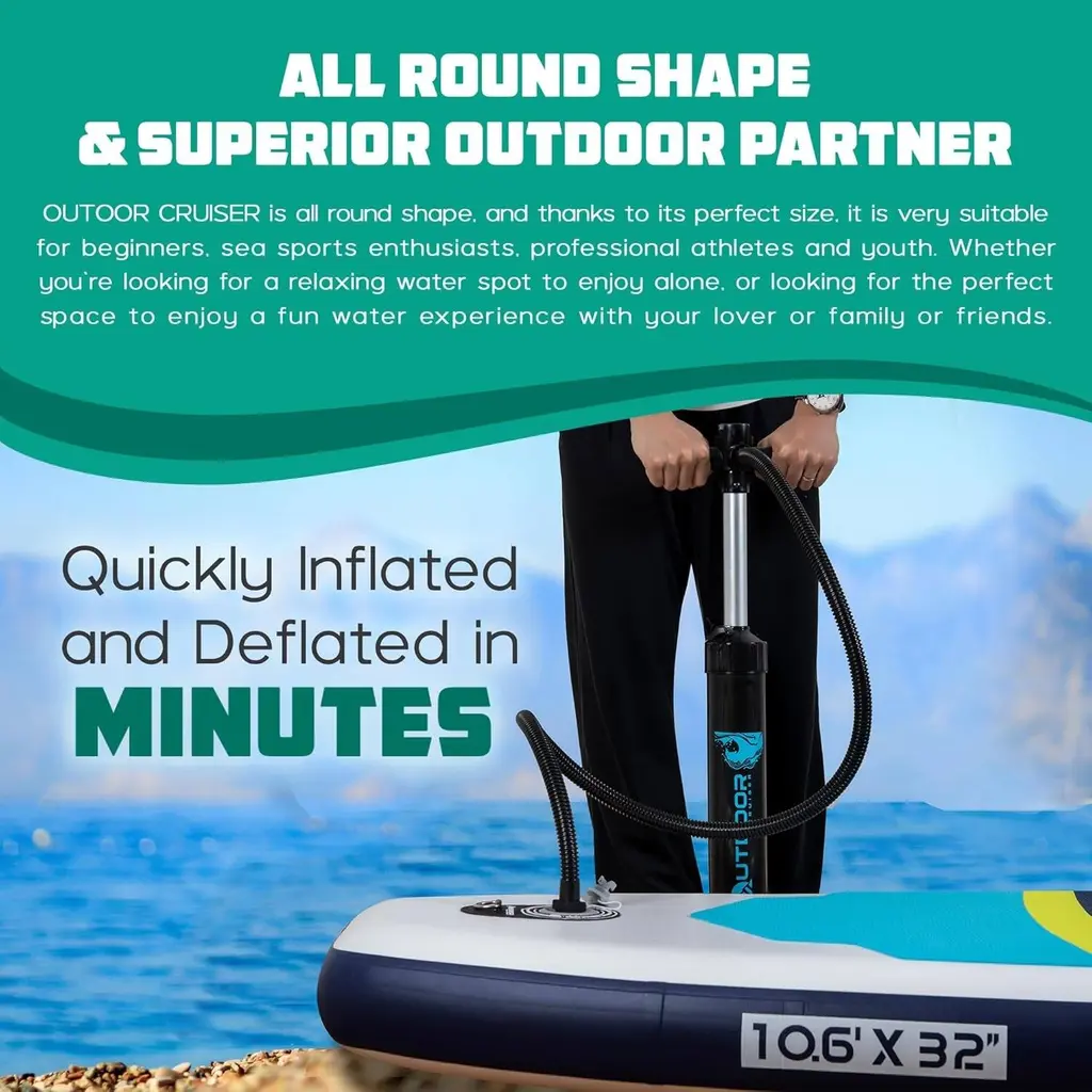 Discover the OUTDOOR CRUISER Inflatable Paddle Board, your ultimate companion for aquatic adventures! Crafted with precision using high-quality drop-stitch material and laminated PVC, this paddle board is built to withstand the rigors of water activities while ensuring long-lasting durability and performance. Achieve rock-solid stability on the water with the OUTDOOR CRUISER, which can be inflated to a robust hardness level of 13-15 PSI. This exceptional stability allows you to paddle with confidence, whether you're navigating calm waters or exploring gentle waves. Weighing a mere 18 pounds and featuring an ultra-portable design, the OUTDOOR CRUISER is effortless to transport and set up. Its compact size and quick inflation/deflation process (within 10 minutes) make it a breeze to carry to your favorite water spots, be it a serene lake or a coastal adventure. The versatile all-round shape of the paddle board caters to a diverse range of users, from beginners to seasoned water enthusiasts. Experience the perfect balance of stability and maneuverability, making the OUTDOOR CRUISER suitable for various water activities and skill levels. Complete with essential SUP accessories, including an inflatable stand-up paddle board, double-action hand pump, adjustable aluminum paddle, removable fin, safety leash, and waterproof backpack, the OUTDOOR CRUISER is your comprehensive solution for an exhilarating and hassle-free paddle boarding experience. Embark on your water adventures with confidence and style with the OUTDOOR CRUISER Inflatable Paddle Board!