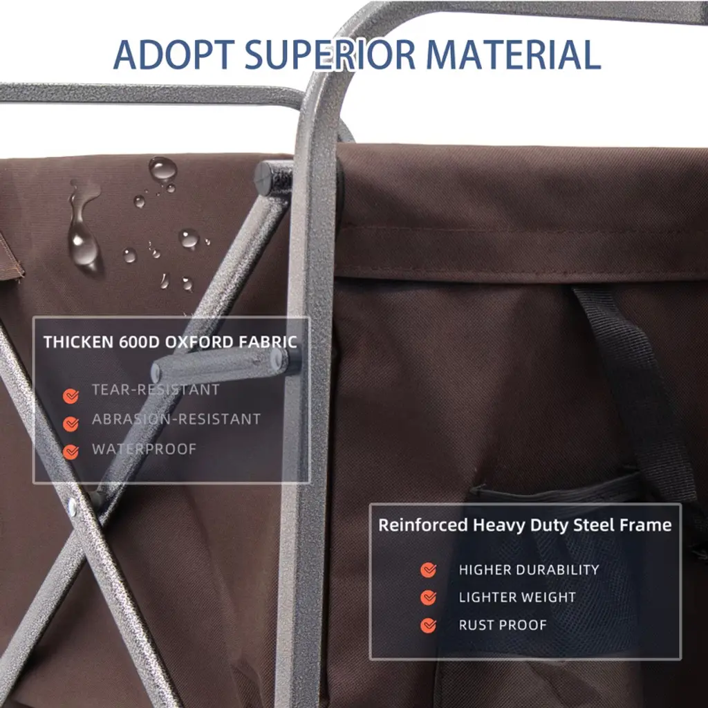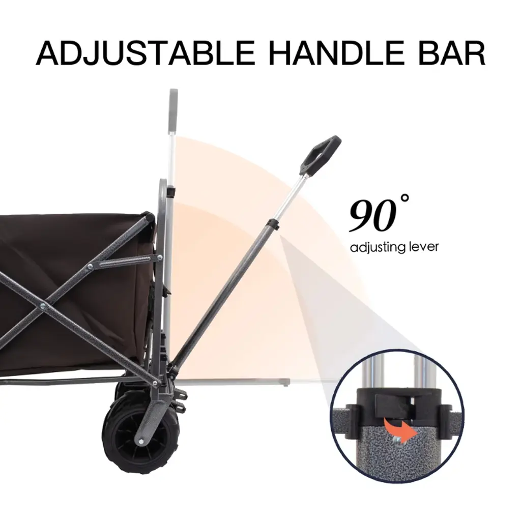 All-Terrain and Foot Brake - Our beach wagons carts heavy duty foldable is equipped with large wheels that it is motorized in various outdoor settings and have strong off road capabilities, such as camping, the beach, and fishing. The beach carts with wheels has a foot brake that can be used to lock the wheels when it's parked on uneven ground. This keeps the collapsible wagons carts heavy duty foldable from moving and helps protect the items it's delivery, like groceries and equipment.Durable and Heavy Duty - Our heavy duty wagon has a alloy frame, making it highly capable of delivery heavy duty loads. It's well-suited for transporting various equipment and tools during gardening work, allowing you to efficiently complete the task without worrying about multiple trips on the yard and lawn due to insufficient weight-carrying capacity.We provide customers with a collapsible carts with wheels equipped secure foot brakes, easy-folding design, a mesh pocket for placing water bottles, and all these features are designed to enhance the customer's experience with the push wagon.The folding carts with wheels rust-resistant frame and double-thick steel tubes make it more durable than typical foldable carts with wheels.