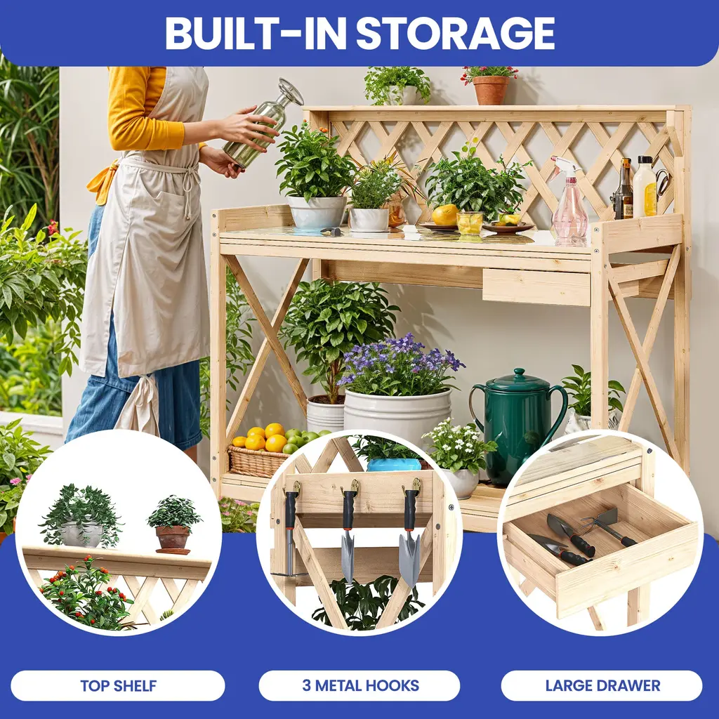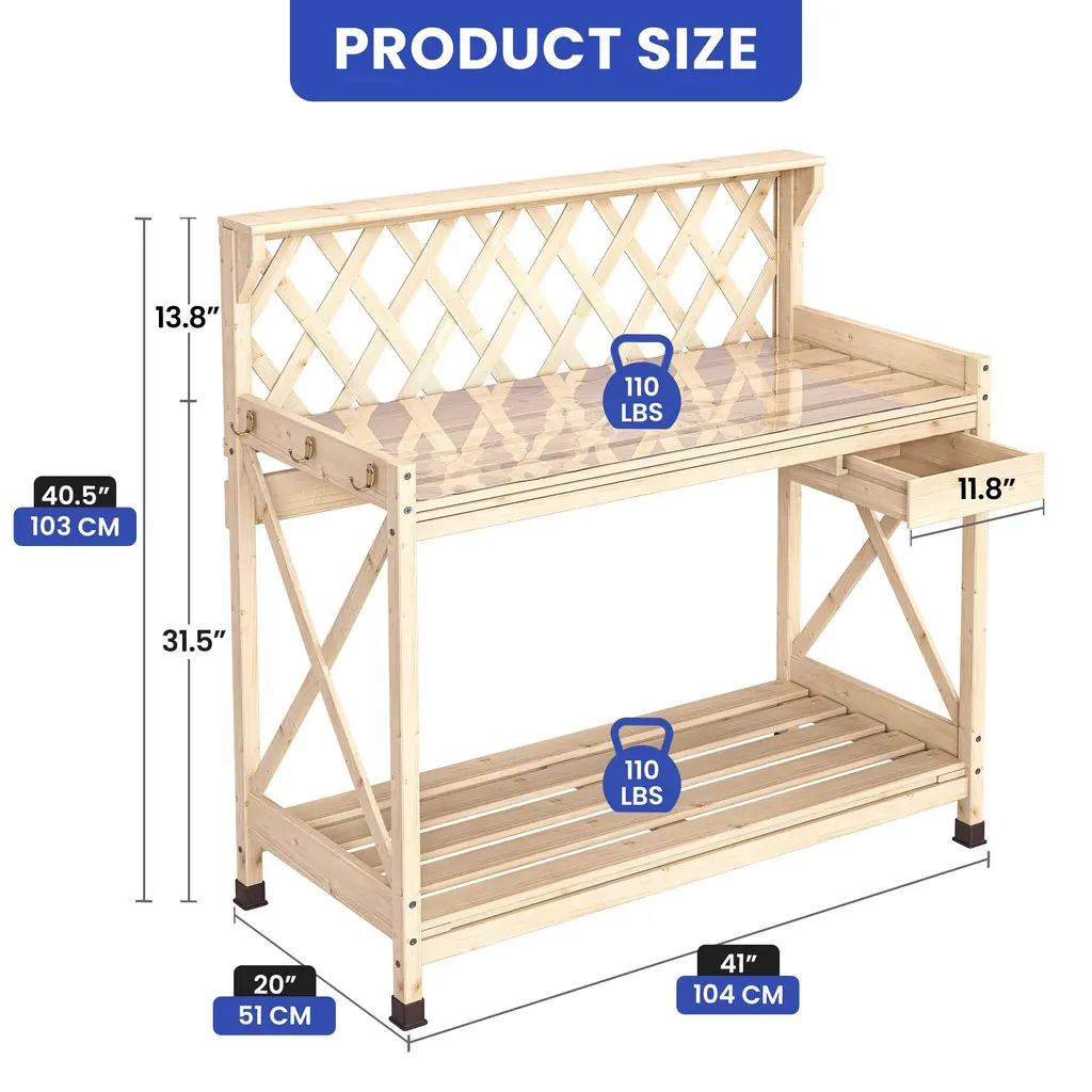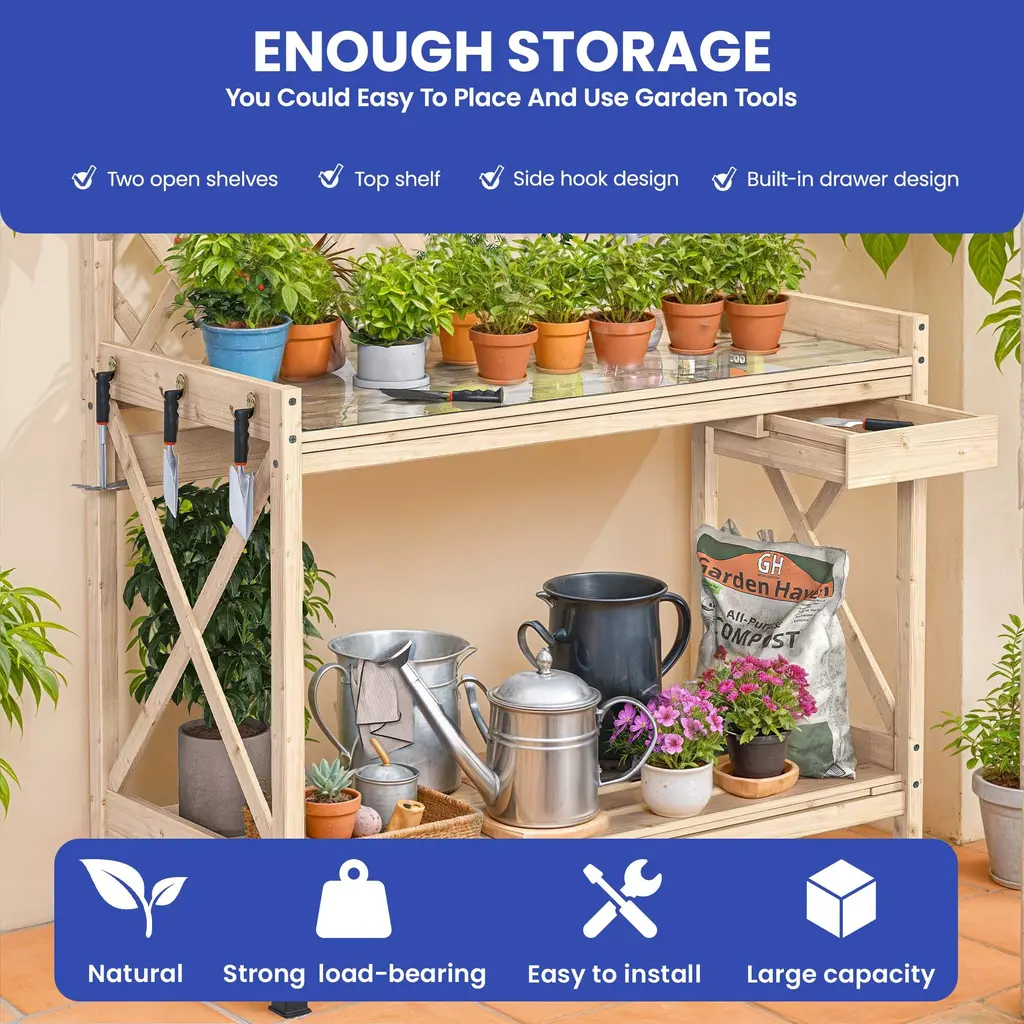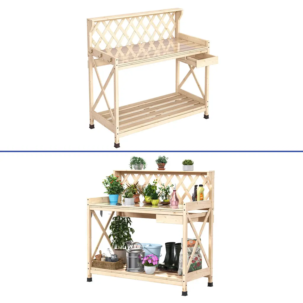 Outdoor Garden Workstation Table with Drawer, Potting Bench Table w/Exposed Rack, Hanger, PVC Water-Resistant MatFeatures:Dimensions: