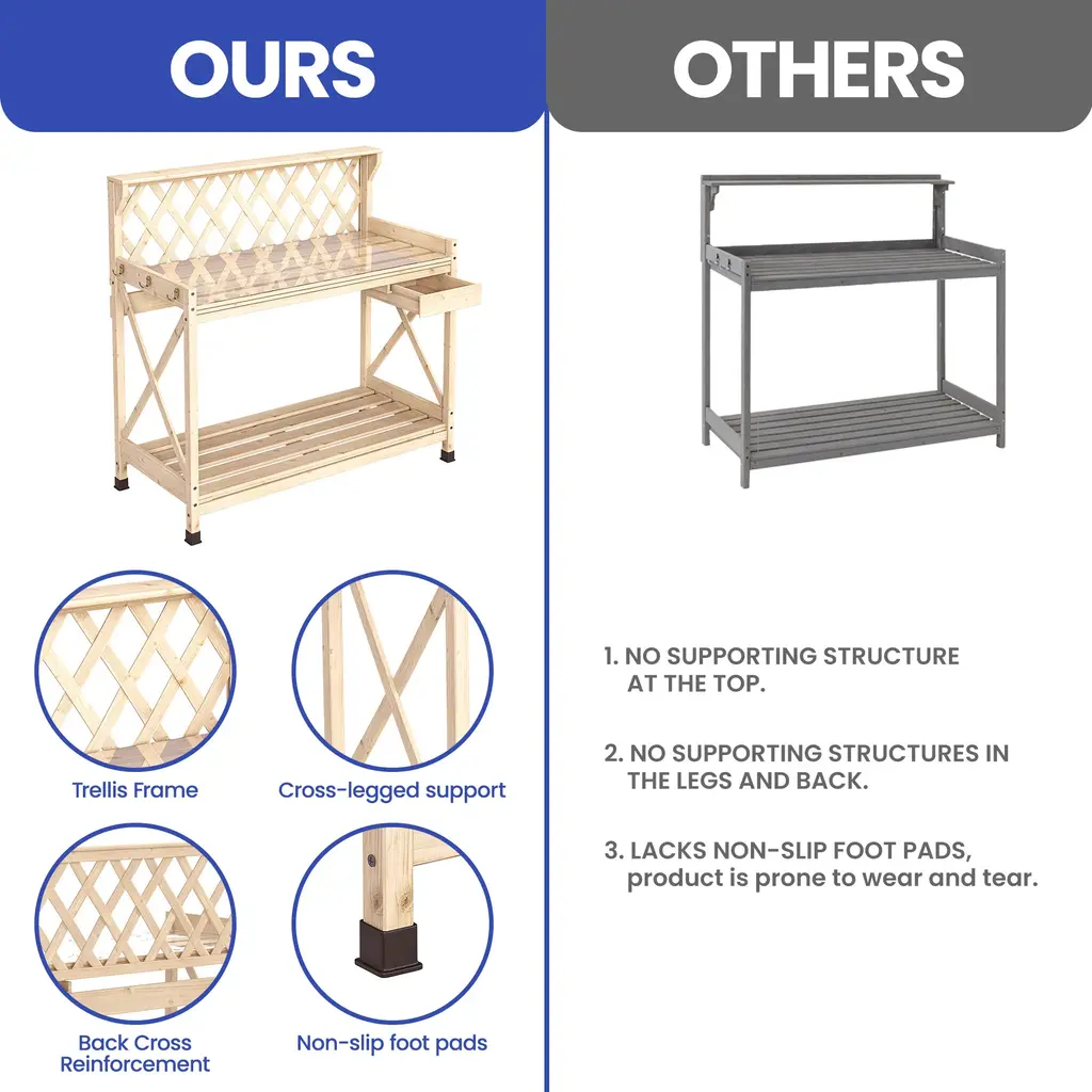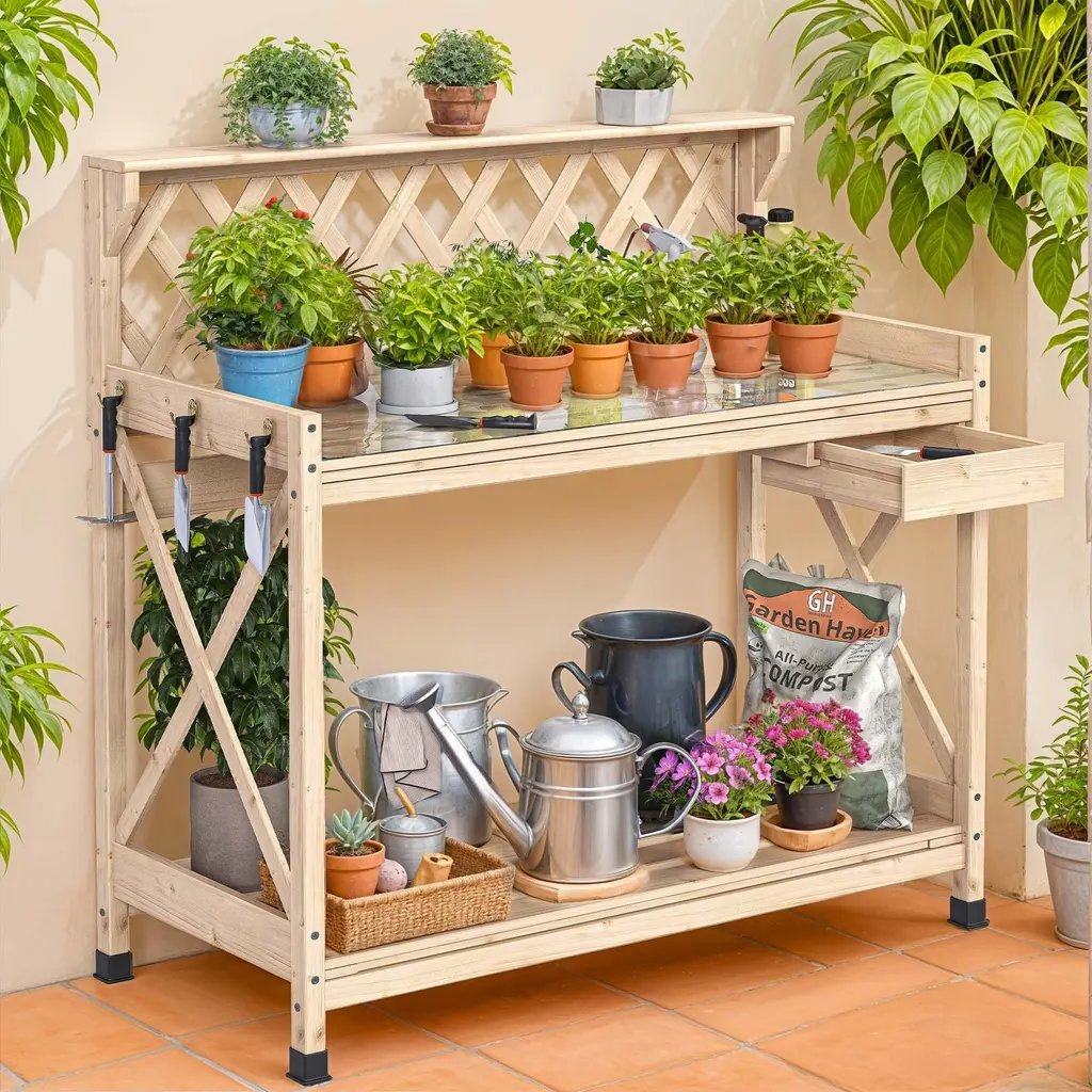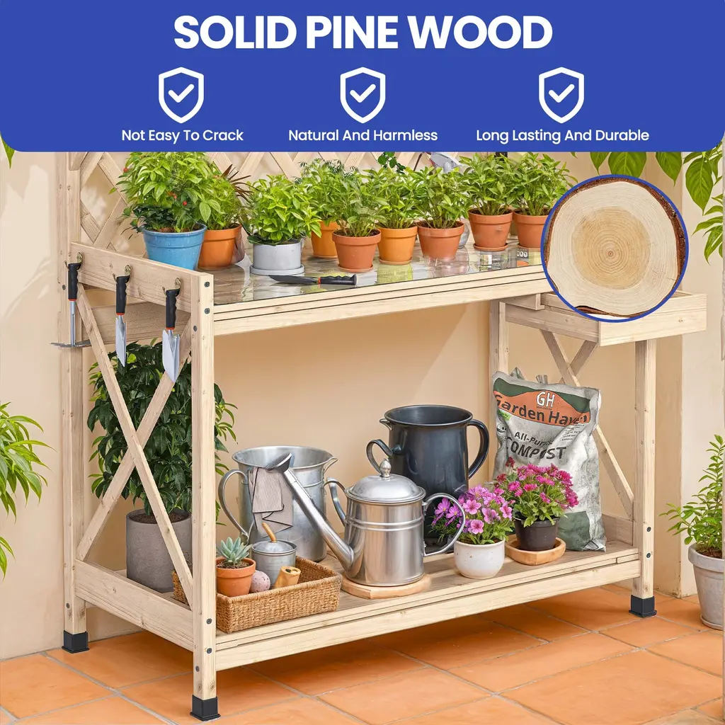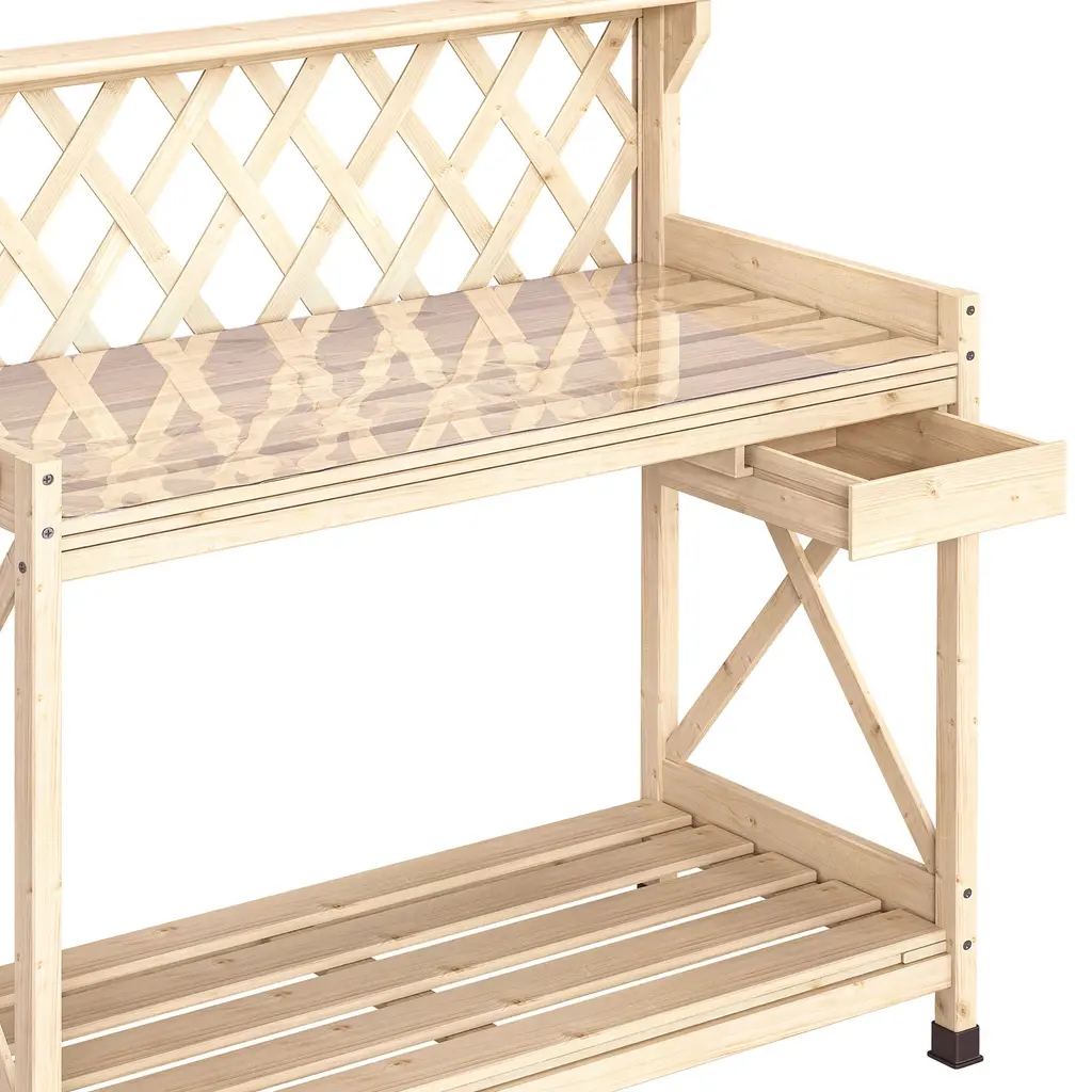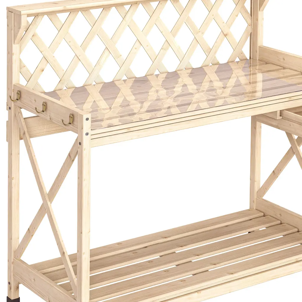 Outdoor Garden Workstation Table with Drawer, Potting Bench Table w/Exposed Rack, Hanger, PVC Water-Resistant MatFeatures:Dimensions: