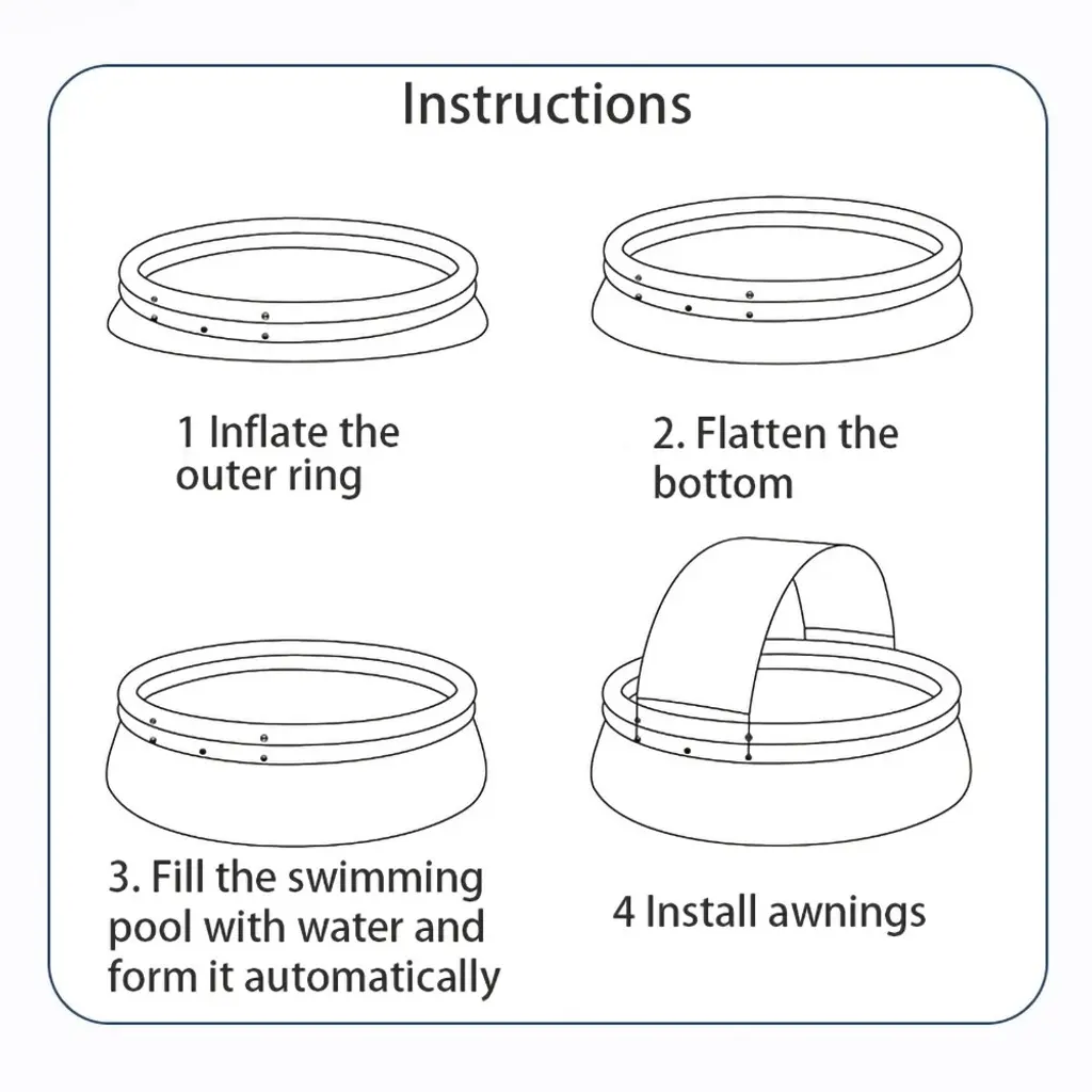 Premium Family Inflatable Pool - Ultimate Summer Entertainment 1. Spacious & Durable Design 12-foot diameter (141.73") × 30" depth - comfortably fits 9 adults for group fun 0.6mm triple-layered PVC with cross-stitched seams resists punctures and stretching Rigid sidewalls maintain shape even with maximum water capacity (1,200 gallons) 2. Quick & Easy Setup 3-step installation: Lay on flat ground (grass/concrete/deck) Inflate top ring (standard air pump compatible) Fill 80% with water (~15 min prep time) High-capacity drain valve empties pool in under 8 minutes 3. Smart Safety Features Stable water displacement prevents tipping Non-slip base texture reduces fall risks UV-resistant material won't fade or degrade in direct sunlight Technical Specifications: ▸ Weight limit: 1,800 lbs (water + users) ▸ Includes: Repair patches + storage bag ▸ Maintenance: Wipe clean with mild soap Why This Pool Stands Out? ► 30% thicker material than budget pools ► Oversized dimensions allow actual swimming (not just wading) ► Space-saving storage - folds to 3' diameterBeat the Heat This Summer - Order Now!