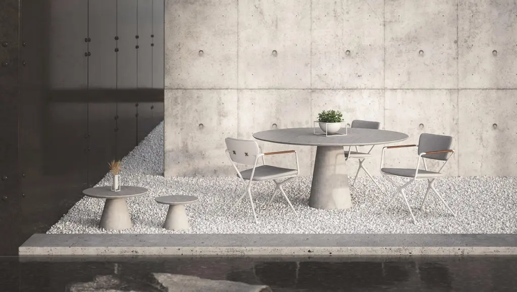 New Conix 160 round table design by Kris Van PuyveldeFinishes:Base: ConcreteTop: CeramicAvailable in other ceramic or teak topDimensions:Round Ø 62.9"Height 29.5"Weight: 321lbs.