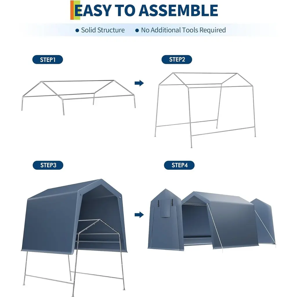 [Built to last] This garden shed features a 19-gauge rust-resistant galvanized steel frame (1.5-inch-diameter poles) and a durable 220gsm waterproof tarp, engineered to last a lifetime and withstand extreme weather. [Excellent Ventilation] The bike shed features mesh windows that ensure airflow while keeping out pesky insects; The outside storage sheds' smooth zippers enable easy access and form a secure seal to keep pets out. [Versatile Usage] This tool shed outdoor storage serves as both a bike shed and tool shed, perfectly stores bicycles, motorcycles, small trucks, as well as small lawnmowers, firewood, or gardening tools. These garden sheds & outdoor storage can keep your space environment neat and tidy. [Reliability Assurance] All components for the bike storage shed are packed in a single box; If you encounter any issues during installation or use, don' t hesitate to contact our customer support team for immediate assistance. [Easy Assembly] With pre-numbered parts and clear assembly instructions, these sheds & outdoor storage can be assembled one person in under an hour—No more frustrating screw assembly