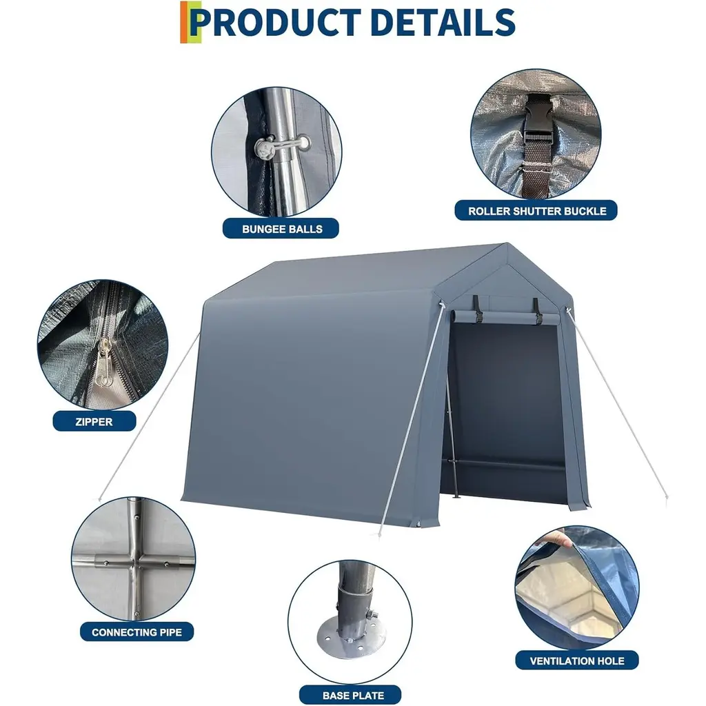 [Built to last] This garden shed features a 19-gauge rust-resistant galvanized steel frame (1.5-inch-diameter poles) and a durable 220gsm waterproof tarp, engineered to last a lifetime and withstand extreme weather. [Excellent Ventilation] The bike shed features mesh windows that ensure airflow while keeping out pesky insects; The outside storage sheds' smooth zippers enable easy access and form a secure seal to keep pets out. [Versatile Usage] This tool shed outdoor storage serves as both a bike shed and tool shed, perfectly stores bicycles, motorcycles, small trucks, as well as small lawnmowers, firewood, or gardening tools. These garden sheds & outdoor storage can keep your space environment neat and tidy. [Reliability Assurance] All components for the bike storage shed are packed in a single box; If you encounter any issues during installation or use, don' t hesitate to contact our customer support team for immediate assistance. [Easy Assembly] With pre-numbered parts and clear assembly instructions, these sheds & outdoor storage can be assembled one person in under an hour—No more frustrating screw assembly