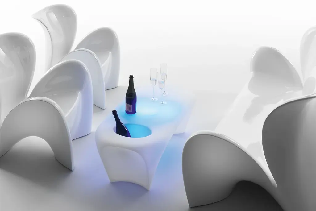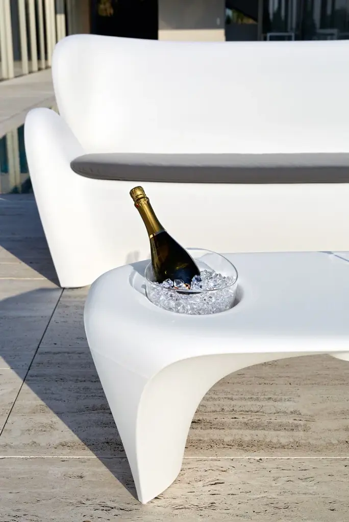 The Outdoor Table With Icebox from Myyour Lily collection is a sophisticated and practical addition to any outdoor space. Made with weather-resistant and easy-to-clean Poleasy®, it features organic, flower-petal-like shapes that add character and elegance to your outdoor area. Perfect for complementing seat cushions and storing cool drinks.