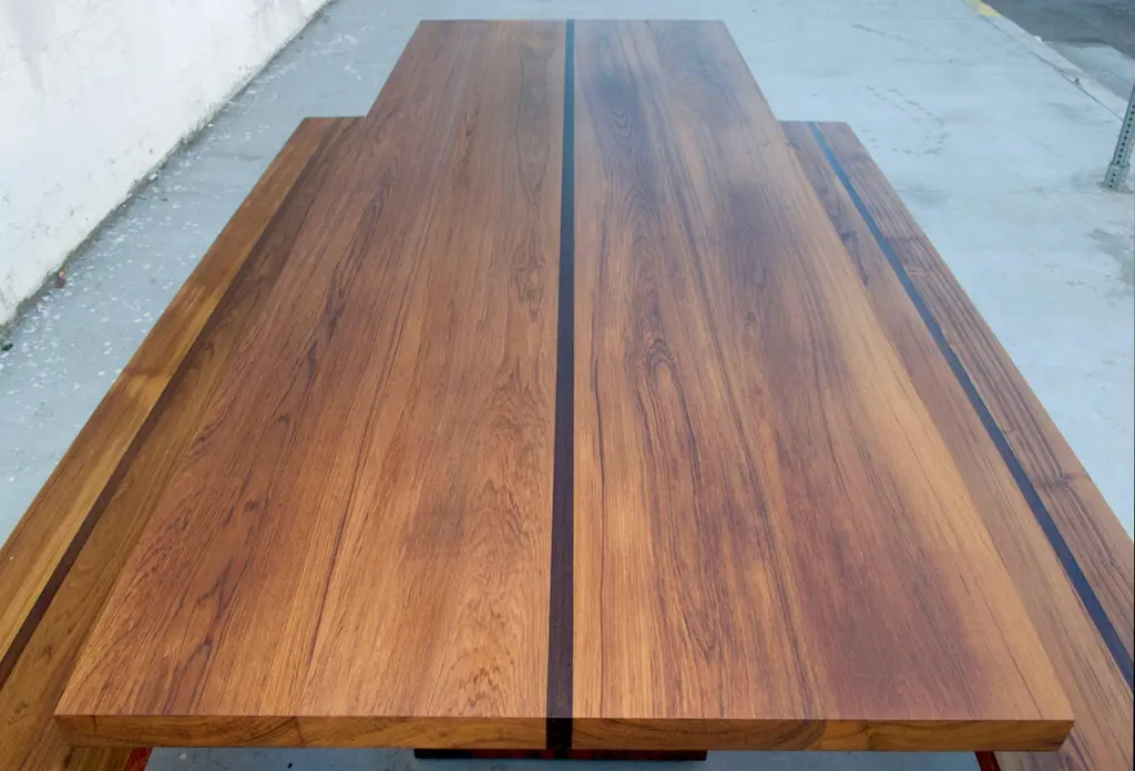 Zen and the outdoor dining table. This custom built table and benches are made from teak and wenge wood. Designed to withstand any climate. Legs are reinforced with 1/2 thick steel plates. We build this table to order in our own workshop in Los Angeles.This custom listing is for two 8'-0" tables and two 8'-0" benches. The tables will have cutouts for umbrellas.