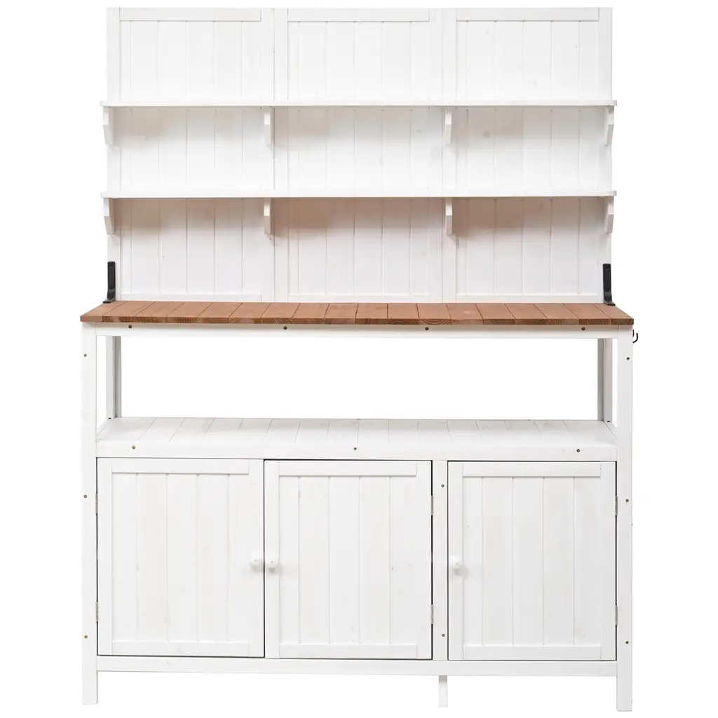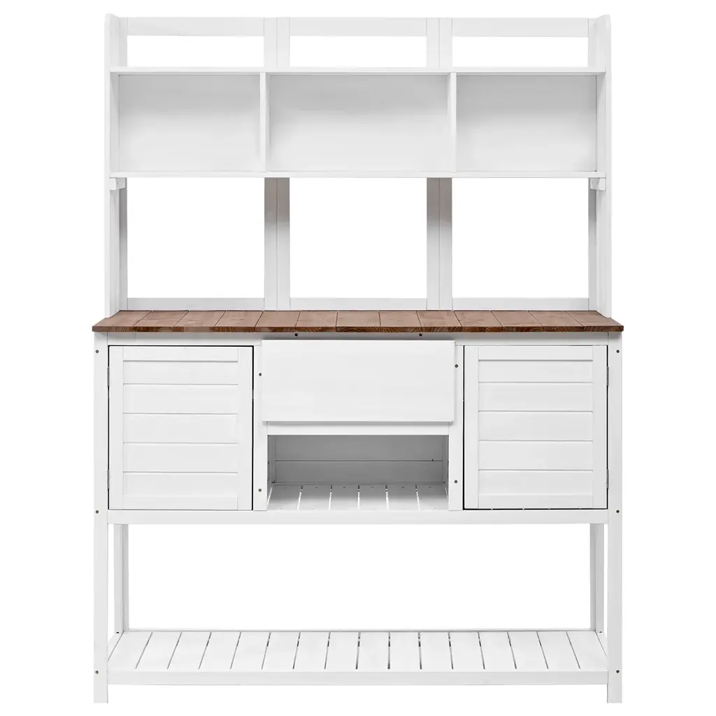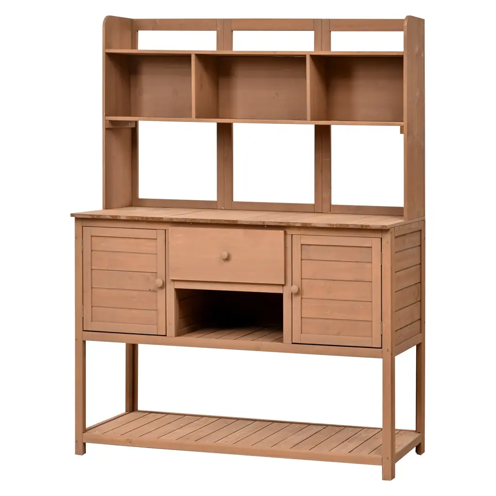 Large Outdoor Farmhouse Wooden Potting Bench Table, the quintessential garden workstation designed to elevate your outdoor gardening experience. With its charming farmhouse aesthetic and robust functionality, this spacious bench is a versatile addition to any backyard or mudroom, now available in a pristine brown finish.Crafted from high-quality wood, this potting bench embodies durability and resilience, ensuring it withstands the elements and serves as a reliable companion for your gardening endeavors. Its classic farmhouse design exudes timeless elegance while seamlessly integrating into any outdoor setting.Equipped with two drawers, a cabinet, and open shelves, this bench offers abundant storage space for all your gardening tools, supplies, and accessories. From pots and soil to seeds and hand tools, everything finds its place, enhancing organization and convenience in your gardening routine.The cabinet provides discreet storage for larger items or personal belongings, while the open shelves offer easy access to frequently used items, adding both functionality and decorative appeal to the bench.
