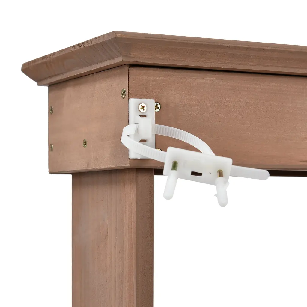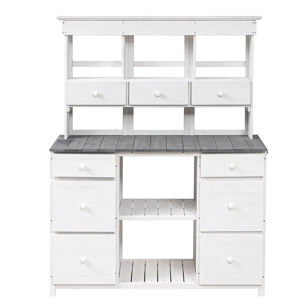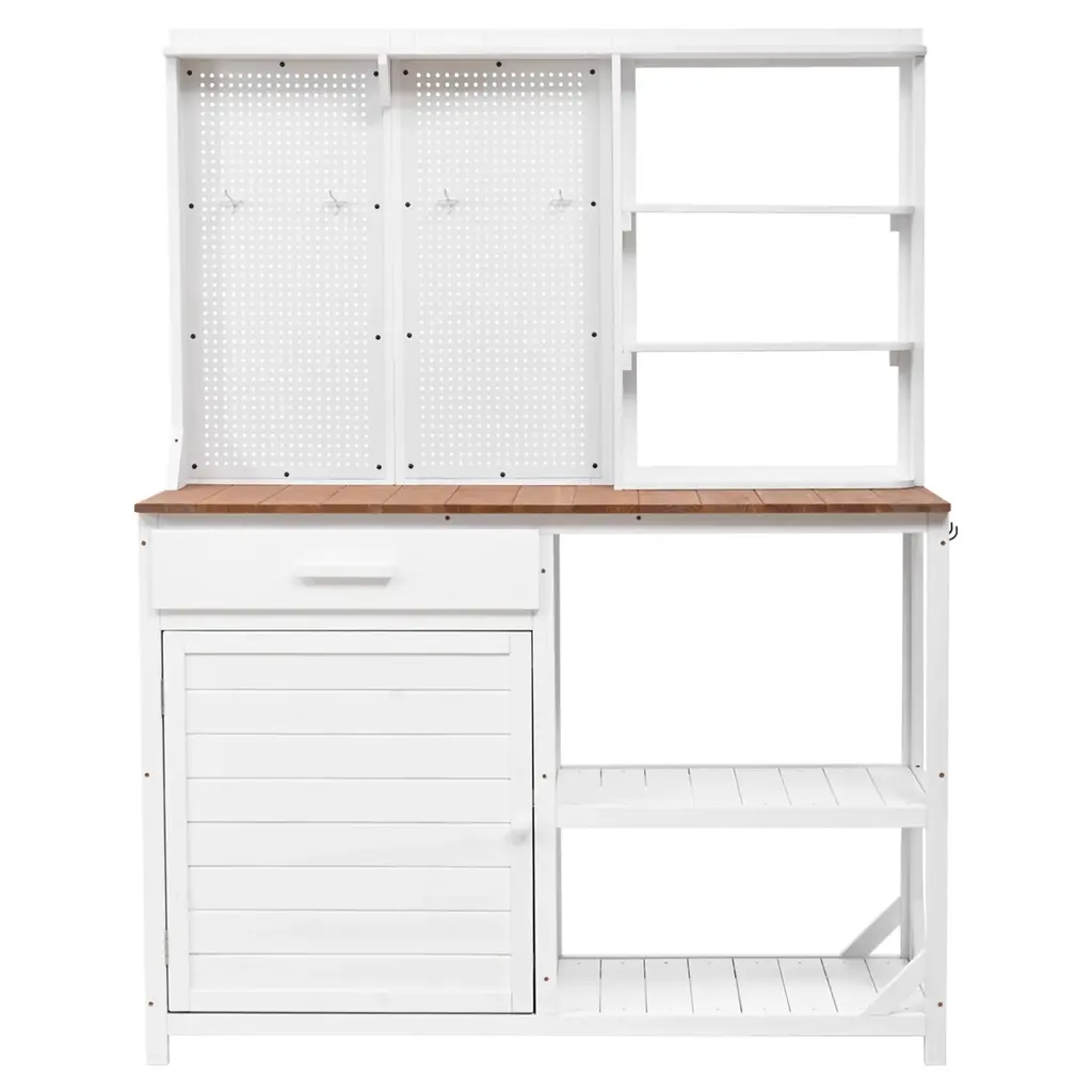 Large Outdoor Farmhouse Wooden Potting Bench Table, the quintessential garden workstation designed to elevate your outdoor gardening experience. With its charming farmhouse aesthetic and robust functionality, this spacious bench is a versatile addition to any backyard or mudroom, now available in a pristine brown finish.Crafted from high-quality wood, this potting bench embodies durability and resilience, ensuring it withstands the elements and serves as a reliable companion for your gardening endeavors. Its classic farmhouse design exudes timeless elegance while seamlessly integrating into any outdoor setting.Equipped with two drawers, a cabinet, and open shelves, this bench offers abundant storage space for all your gardening tools, supplies, and accessories. From pots and soil to seeds and hand tools, everything finds its place, enhancing organization and convenience in your gardening routine.The cabinet provides discreet storage for larger items or personal belongings, while the open shelves offer easy access to frequently used items, adding both functionality and decorative appeal to the bench.