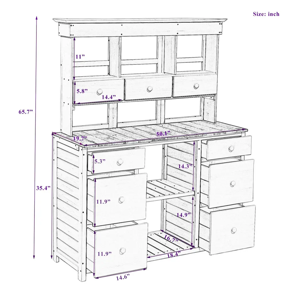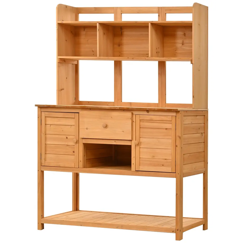 Large Outdoor Farmhouse Wooden Potting Bench Table, the quintessential garden workstation designed to elevate your outdoor gardening experience. With its charming farmhouse aesthetic and robust functionality, this spacious bench is a versatile addition to any backyard or mudroom, now available in a pristine brown finish.Crafted from high-quality wood, this potting bench embodies durability and resilience, ensuring it withstands the elements and serves as a reliable companion for your gardening endeavors. Its classic farmhouse design exudes timeless elegance while seamlessly integrating into any outdoor setting.Equipped with two drawers, a cabinet, and open shelves, this bench offers abundant storage space for all your gardening tools, supplies, and accessories. From pots and soil to seeds and hand tools, everything finds its place, enhancing organization and convenience in your gardening routine.The cabinet provides discreet storage for larger items or personal belongings, while the open shelves offer easy access to frequently used items, adding both functionality and decorative appeal to the bench.