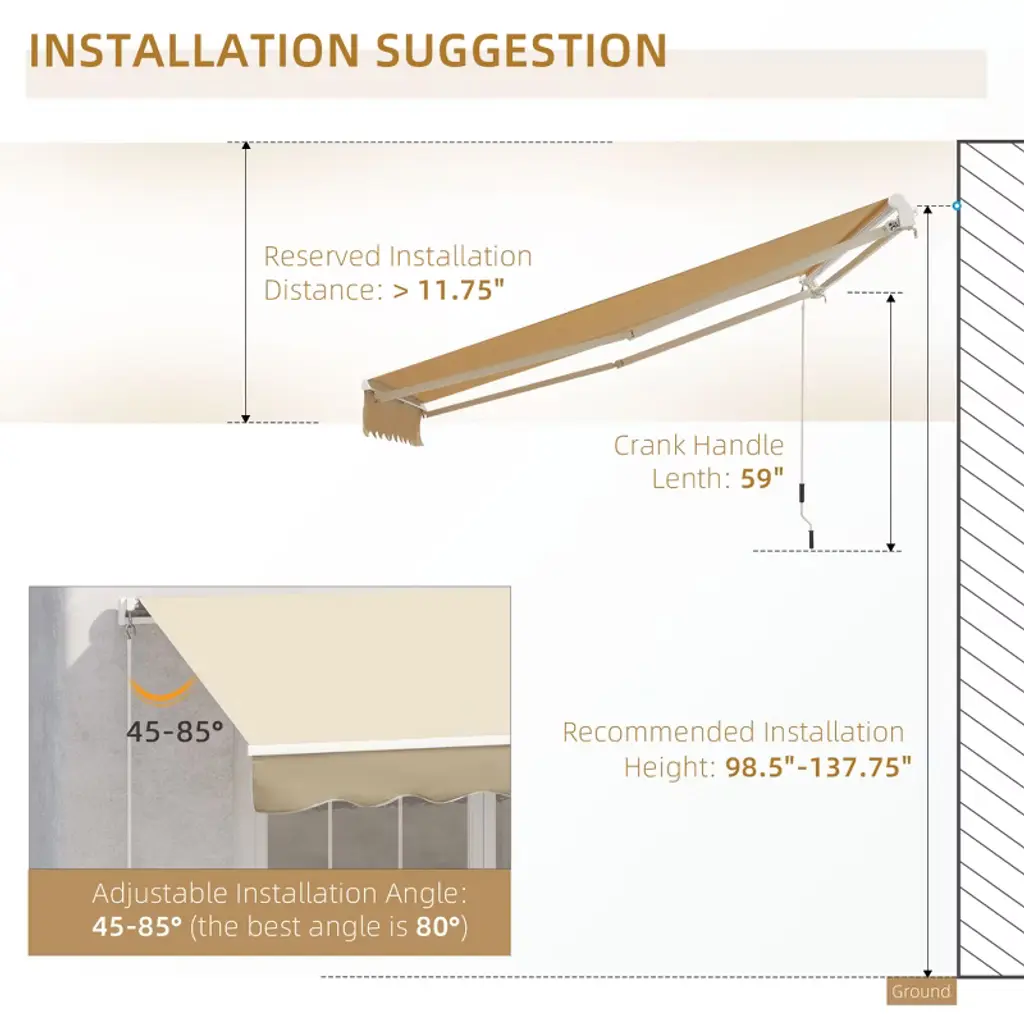 With a tough aluminum and steel frame, Outsunny retractable patio awnings offer outdoor shade. Our awnings create a cool, comfy place on your patio and protect you from UV rays. The reinforced frame and water-resistant polyester fabric make our window awnings superior in material and excellent in workmanship. Our door awnings let you enjoy protection and an accent piece at a reasonable cost. They easily mount on the wall with the included accessories. Get out, get comfy, get Outsunny.