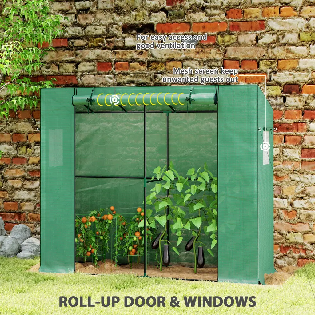 Long Descriptions: No more worrying about your carefully kept plants and flowers freezing! Outsunny tomato growhouse with a reinforced frame is a spacious and convenient solution for gardeners of all levels. Enough vertical space is designed to grow climbing plants like cucumbers and tomatoes. UV-resistant PE cover with roll-up doors and mesh windows creates a desirable temperature and humidity for growing plants. Embrace the art of horticulture with the Outsunny outdoor greenhouse for winter. Features: Specifications: