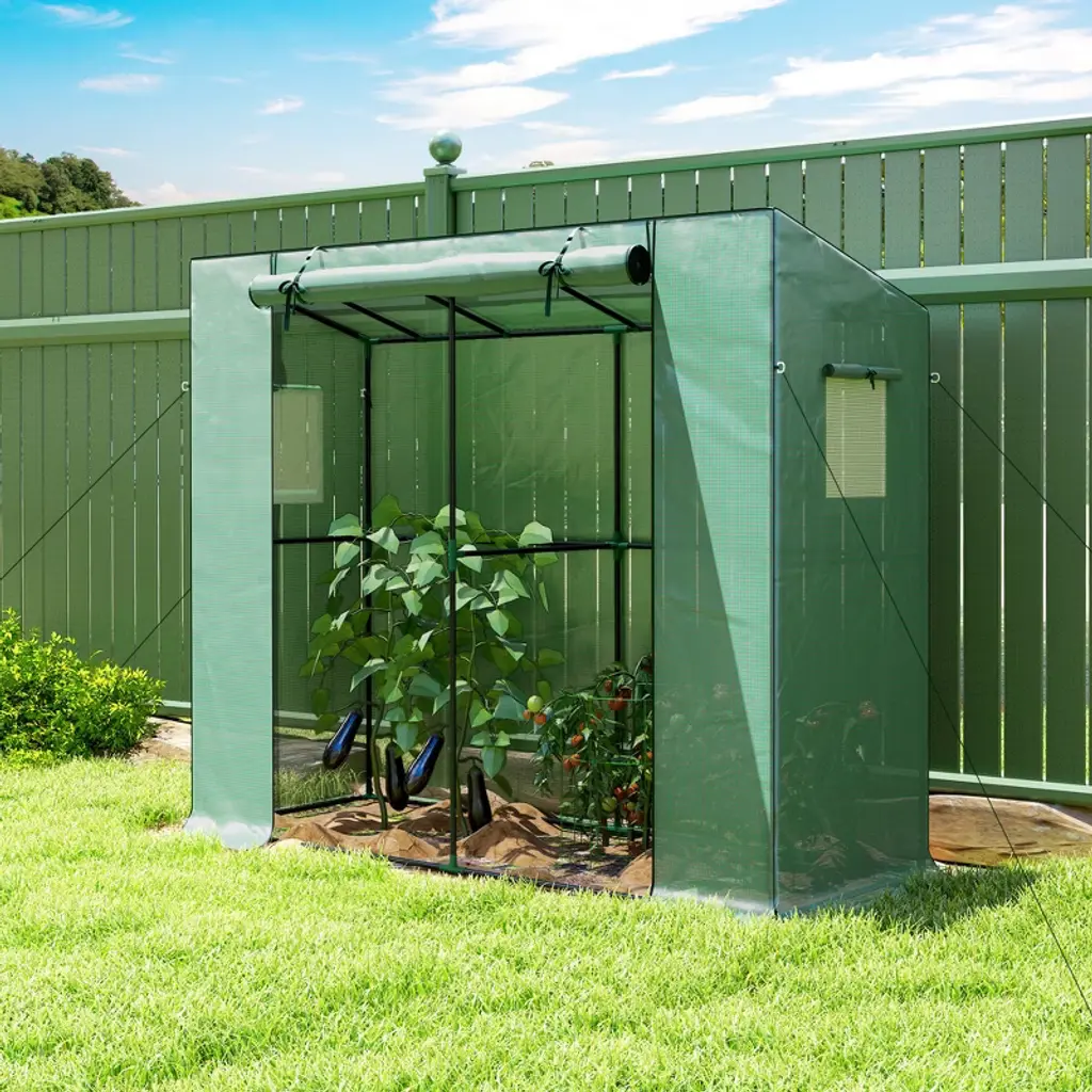 No more worrying about your carefully kept plants and flowers freezing! Outsunny tomato growhouse with a reinforced frame is a spacious and convenient solution for gardeners of all levels. Enough vertical space is designed to grow climbing plants like cucumbers and tomatoes. UV-resistant PE cover with roll-up doors and mesh windows creates a desirable temperature and humidity for growing plants. Embrace the art of horticulture with the Outsunny outdoor greenhouse for winter.
