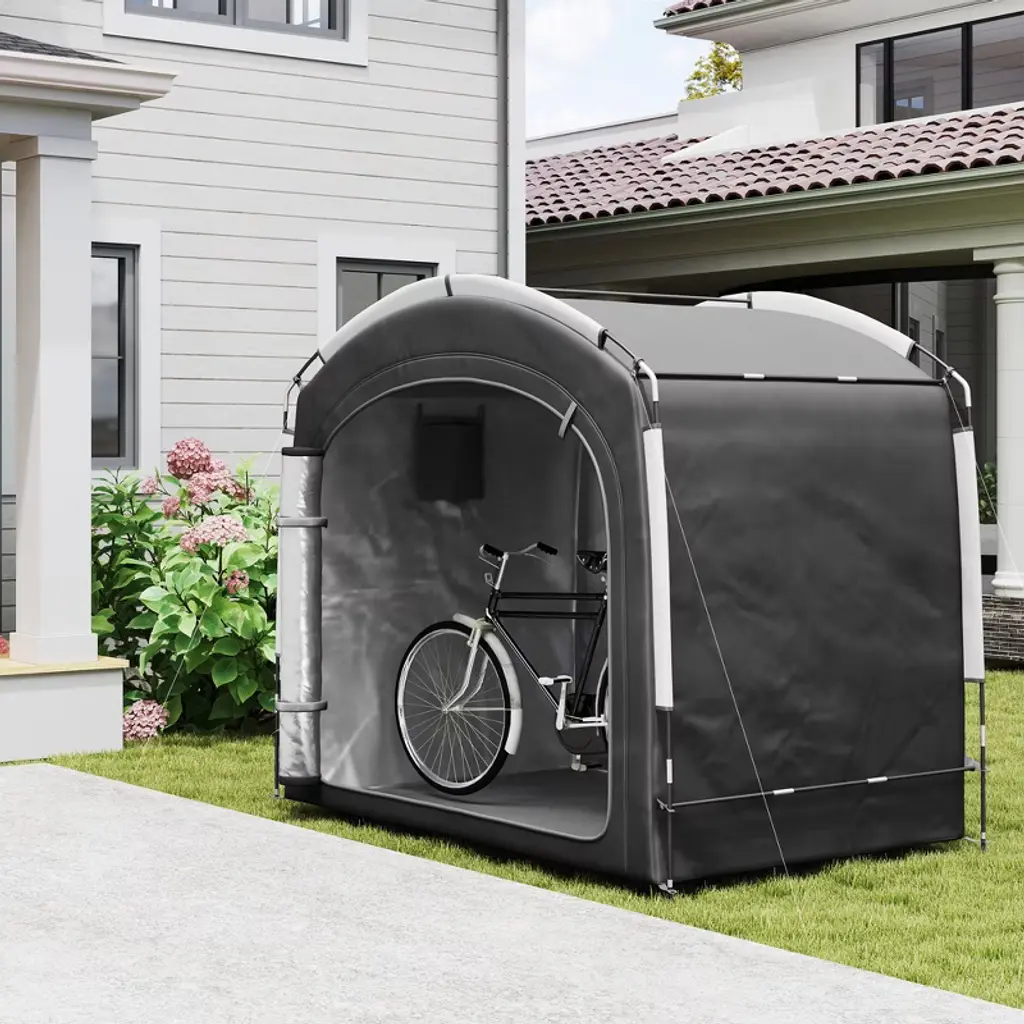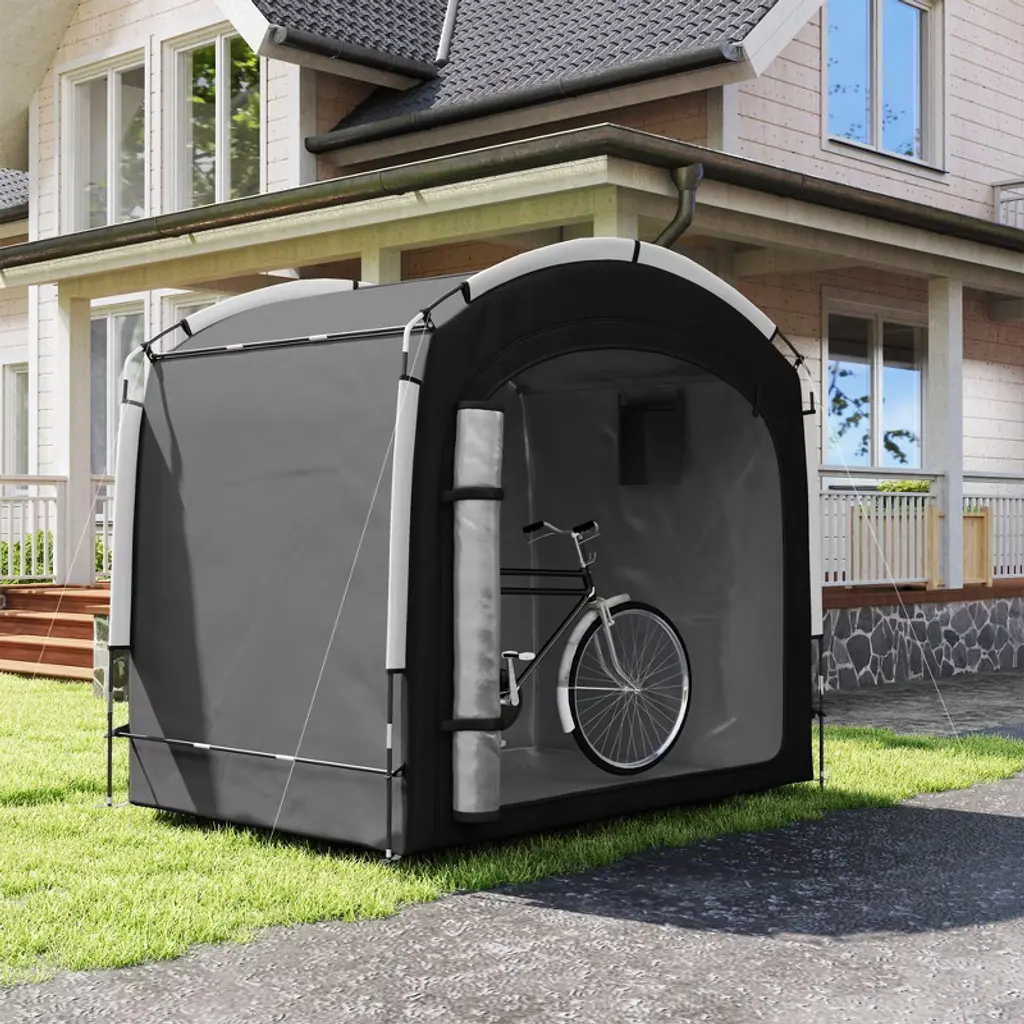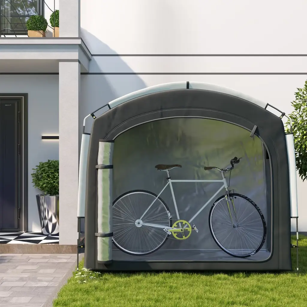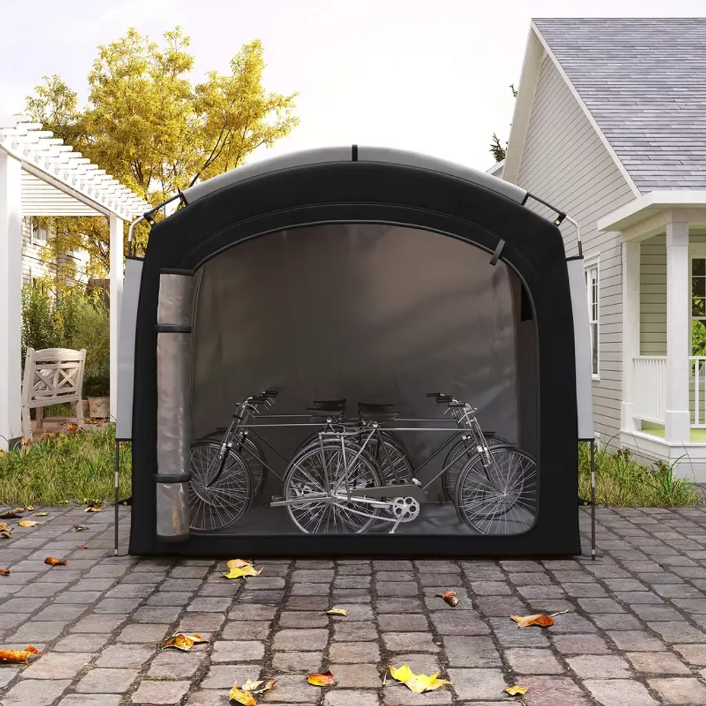 Discover the versatility of the Outsunny bike shed or motorcycle tent! Spacious enough to shelter 4 bikes or 2 motorcycles, this bicycle storage tent also houses your garden tools and seasonal decoration with ease. Crafted from 210D Oxford cloth with a silver coating for UPF50+ protection and seam-sealed waterproofing, it promises reliable coverage in a lightweight, easy-to-manage design.