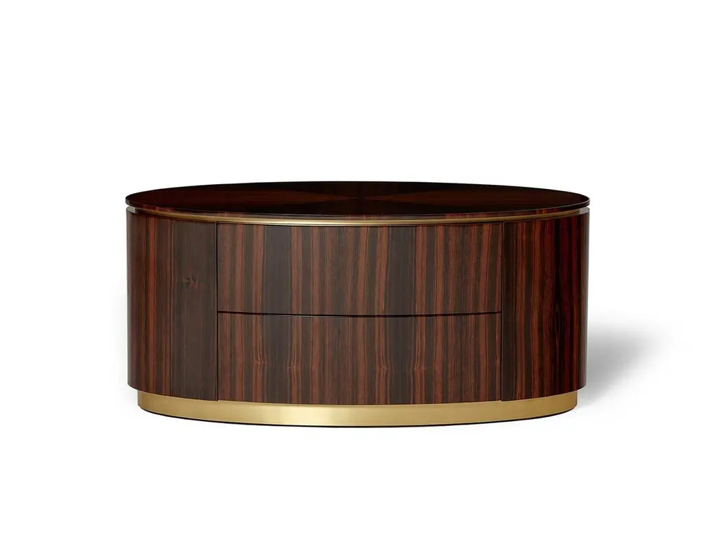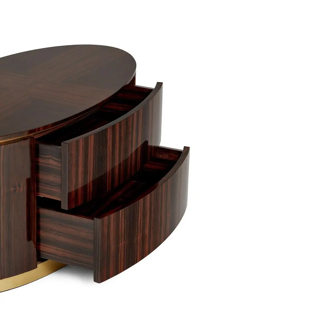 This bed side table is filled with quiet details, combining sumptuous leaf finishes and a minimalistic footer. The left one has two drawers, while the right one has two doors with a middle shelf, all designed to contain cherished memories..Shown here in Amara Ebony with Brass or Nickel, Antique Brass or Antique Nickel.Finishes Options: Top: Bird Eye, Artic Bird Eye, American Walnut, Ebony or Olive Ash wood veneer in matt or gloss finishing.Footer and Rim: Brass, Nickel or Copper in polished, brushed or antique finishing.Size can be customized to fit your space perfectly.We do our best to expedite production and to ship and deliver product within the listed lead time, however current lead times might be longer due to global shipping backlog and delays. These delays are out of our control and cannot be a reason to cancel an order.