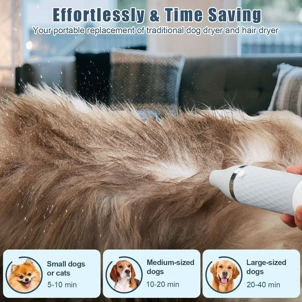 【5 in 1 Pet Hair Dryer】This dog hair blow dryer comes with five functional nozzles for all coats. Choose the right nozzle for blow drying, styling, and combing the coat to meet your pet's specific needs. 【NCT Intelligent Thermostat】This dog hair dryer is equipped with NTC intelligent thermostat function, with hot and cold circulation mode, one key intelligent automatic hot and cold air circulation, to prevent the pet body temperature from getting too high, the temperature key can switch to cold or hot, 3 temperature adjustment. 【Powerful Wind】Powerful 900W motor with the high speed of 110,000 rpm, the motor has three adjustable air speeds to dry hair quickly, which can shorten the overall drying time. In addition, it also releases a high concentration of negative ions, which can eliminate static electricity on the hair, restoring the hair to a smooth and healthy-looking. 【Lower Noise】Specific advanced direct-air noise reduction technology absorbs and blocks noise, gentle blow-drying to prevent stress within the acceptable sound-noise range for cats and dogs. 【Lightweight and Portable】Say bye to bulky water blowers, the compact main unit can be controlled by one hand and weighs only 0.6lbs (without cord), making it a portable dog hair dryer that can easily fit into a suitcase or backpack when travel with your pet.
